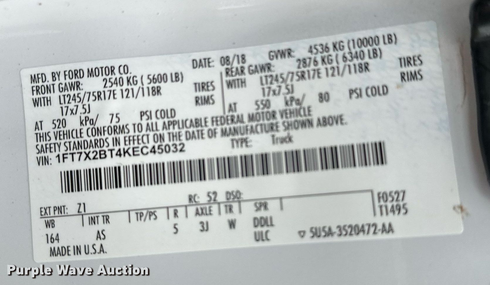 - VIN: 1FT7X2BT4KEC45032