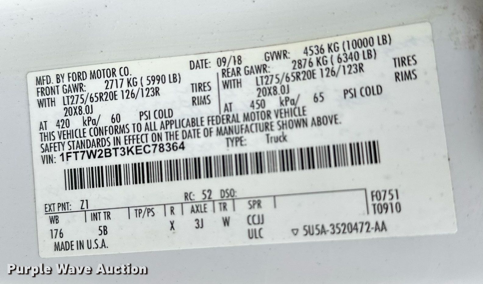 Purple Wave is selling a used 3/4 or 1 Ton Pickup or Van in Oklahoma. This item is a 2019 Ford F250 Super Duty Lariat Crew Cab pickup truck with the following: Miles: 191,047 on odometer, VIN: 1FT7W2BT3KEC78364