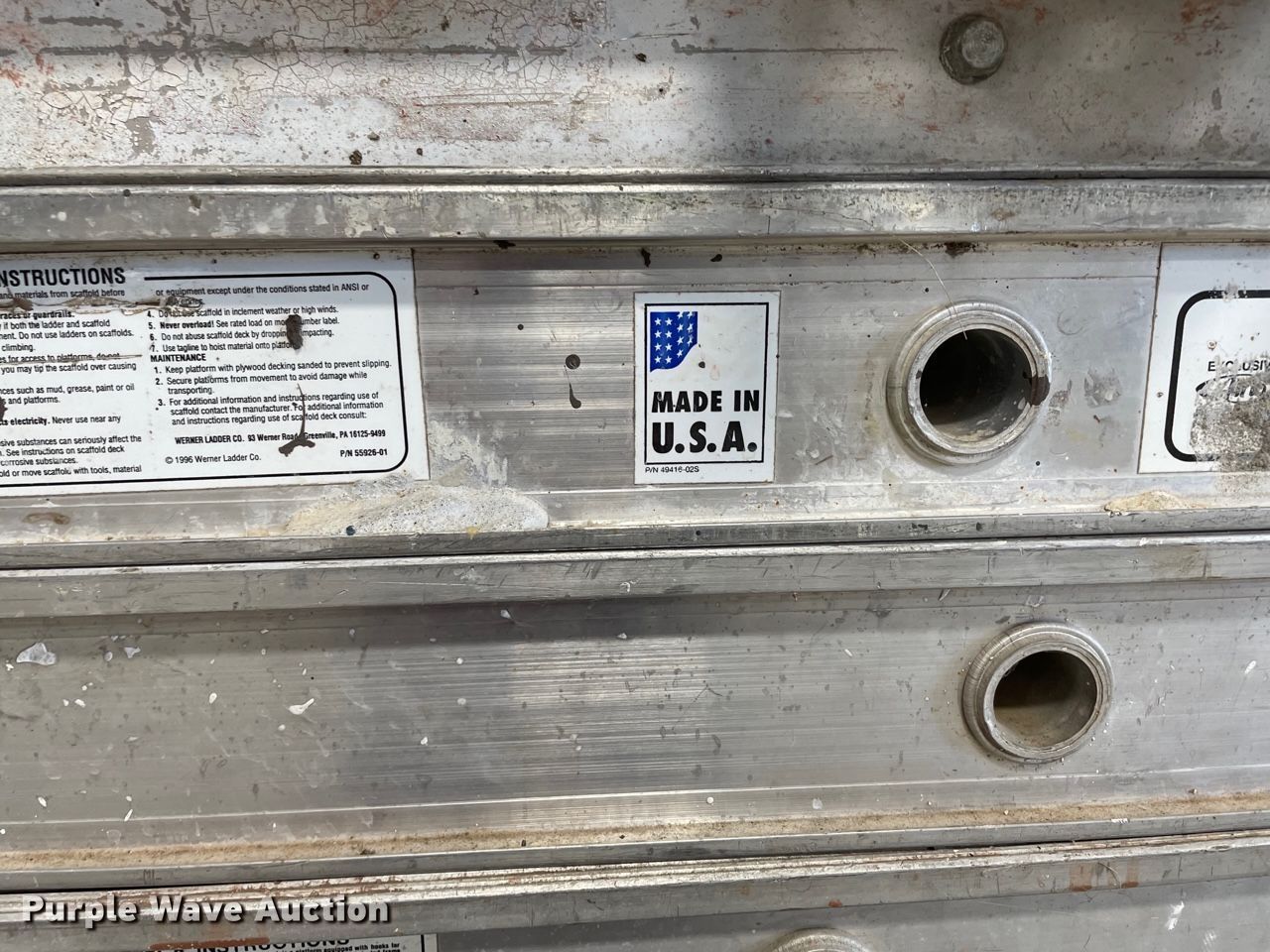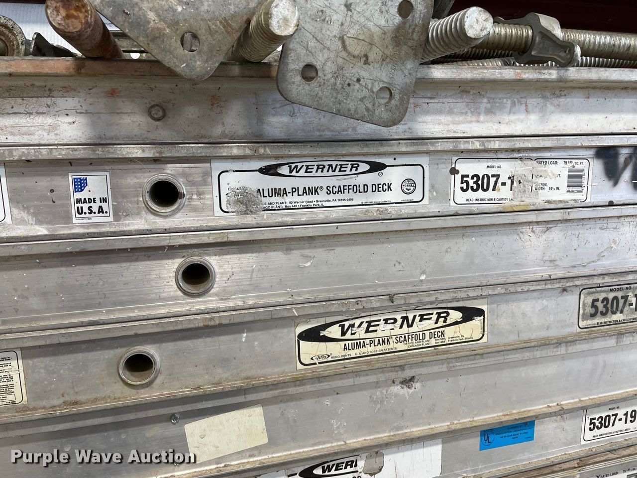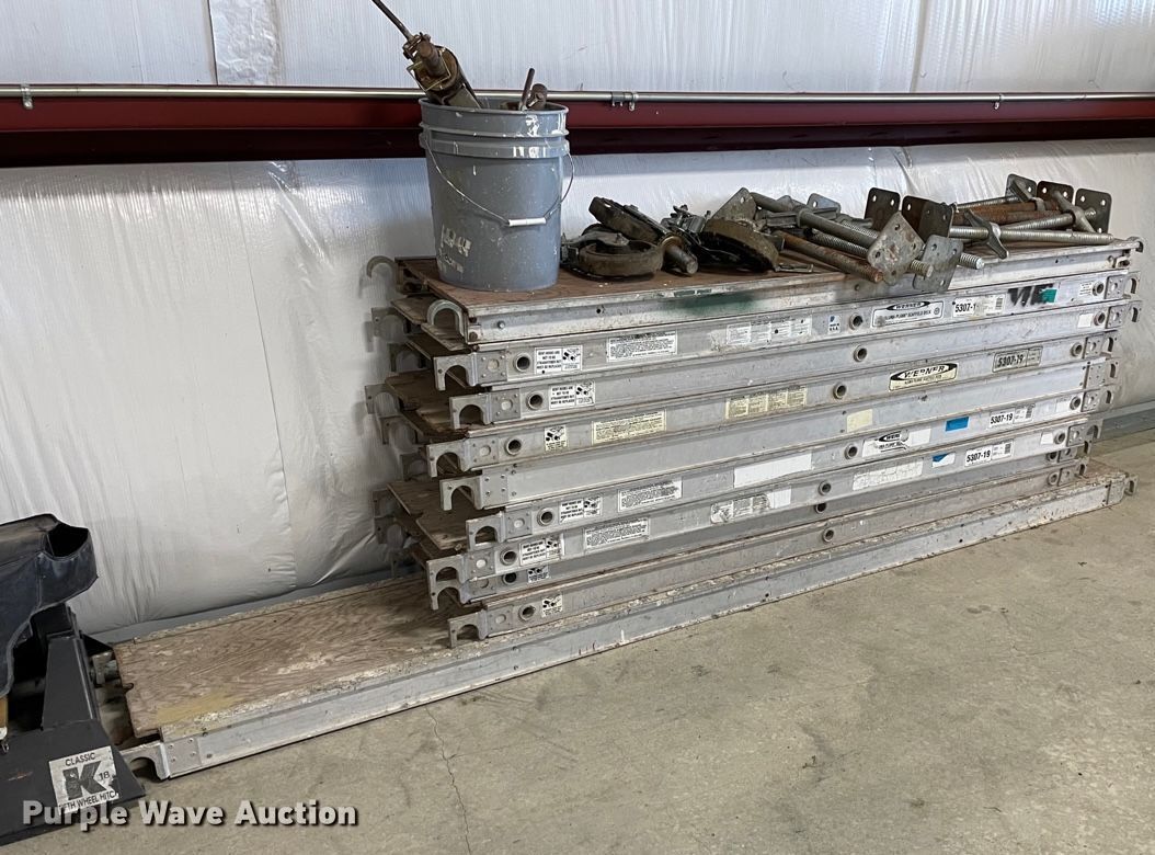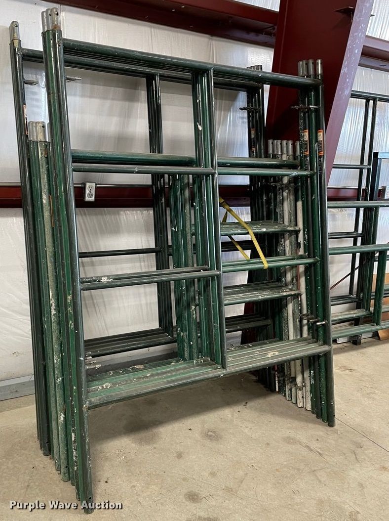 Purple Wave is selling a used Tools in Missouri. This item is a Scaffolding with the following: (20) uprights, (10) 5'W x 79"H, (6) 5'W x 61"H, (2) 5'W x 49"H, (2) 5'W x 36"H, (18) cross-members, (10) planks, (9) 7', 10', (11) leveling feet, (8) wheels