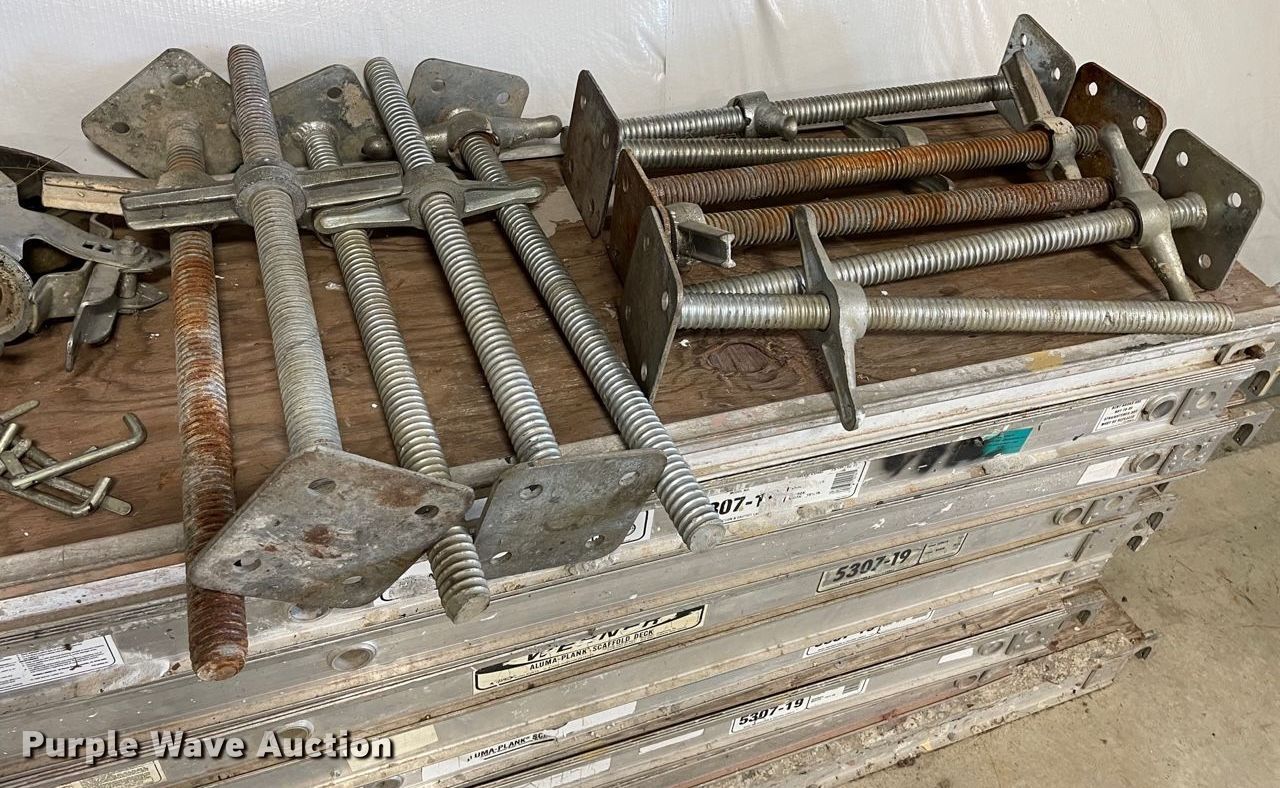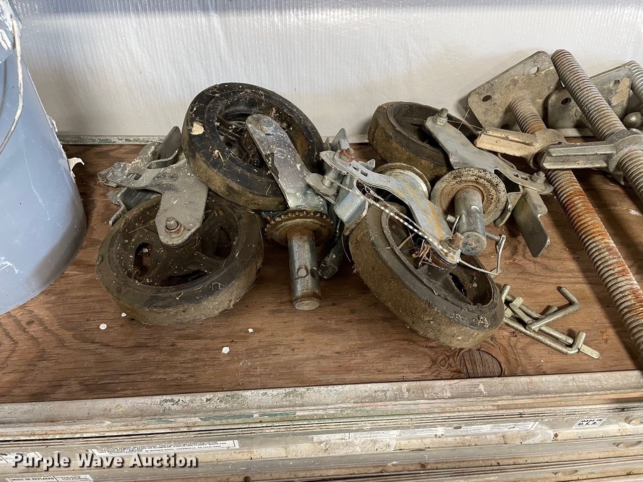 Scaffolding. (20) uprights (10) 5'W x 79"H, (6) 5'W x 61"H, (2) 5'W x 49"H, (2) 5'W x 36"H, (18) cross-members, (10) planks (9) 7', 10', (11) leveling feet, (8) wheels. Highview Properties. 2422 Southwest Springwater Ridge. Lee's Summit, MO 64081