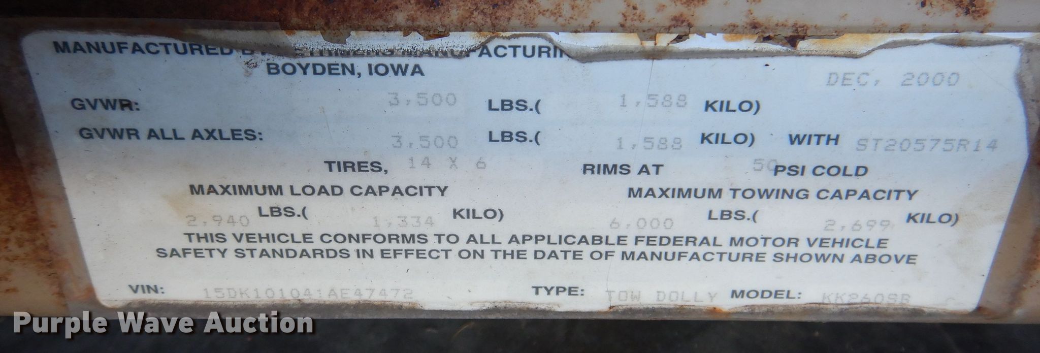 2001 Demco Kar Kaddy KK2608B car dolly. VIN: 15DK101041AE47472. Dimensions Deck: 71"W, Ramps: 2'L. Features Deck type: Steel. Chassis Ball hitch: 2", Brakes: Electric, GVWR: 3,500 lbs, GAWR: 3,500 lbs. Tires Steel wheels, Size: ST205/75D14. Transfer of ownership documentation will be a bill of sale. 14371 County Road R45. Prole, IA 50229