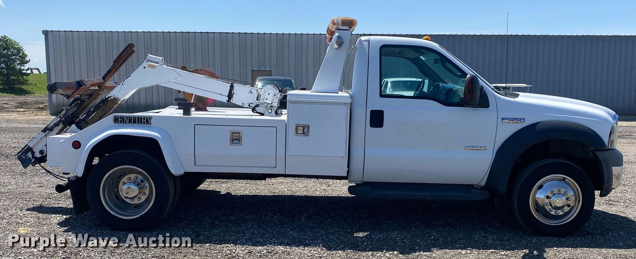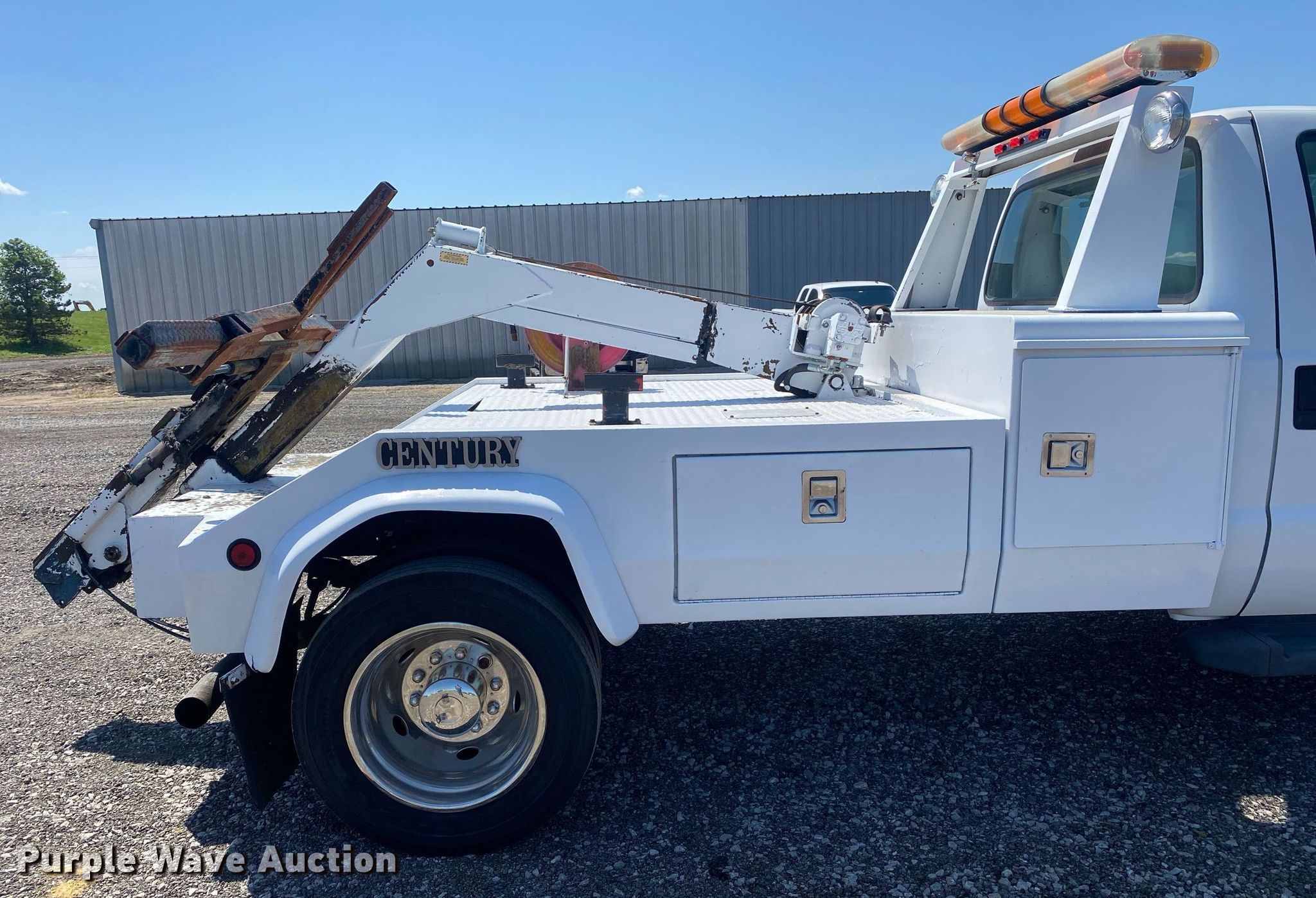 2006 Ford F450 Super Duty XLT tow truck. Miles: 124,040 on odometer, VIN: 1FDXF46P56EA68990. Engine Displacement: 6.0L, Cylinders: 8, Fuel type: Diesel. Transmission Automatic. Chassis Axles: Single, Suspension: Spring, Brakes: Hydraulic, PTO, GVWR: 16,000 lbs, Wheelbase: 165". Interior AC, Heat, Power windows, Power locks, Cruise control, Auxiliary controls, Brake controller. Features Wrecker bed Century, Wrecker boom: Hydraulic, Winch Capacity: 8,000 lbs, Underlift Hydraulic fold, Remote control. Tires Size: 225/70R19.5. Notes Dash warning indicator: battery light. Oklahoma title. Title distribution may be delayed up to 14 days from verification of funds. 15107 North 137th East Avenue. Collinsville, OK 74021