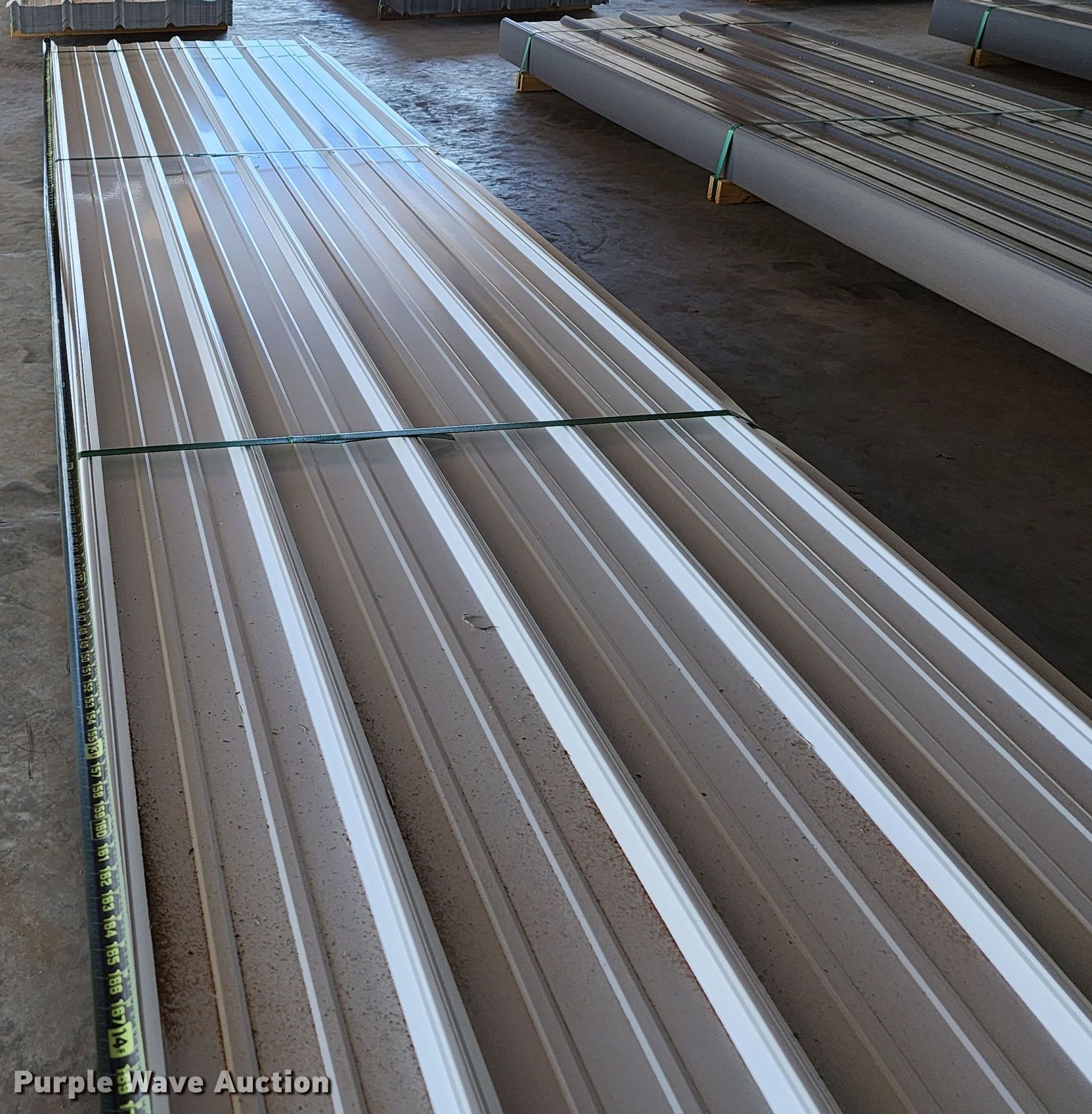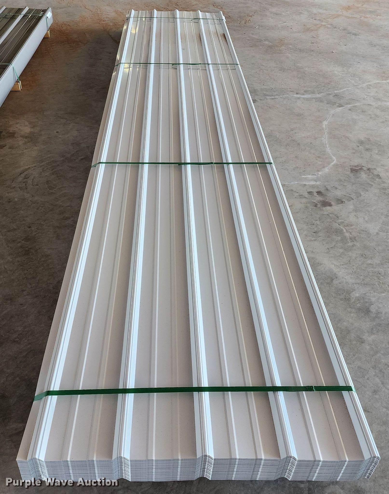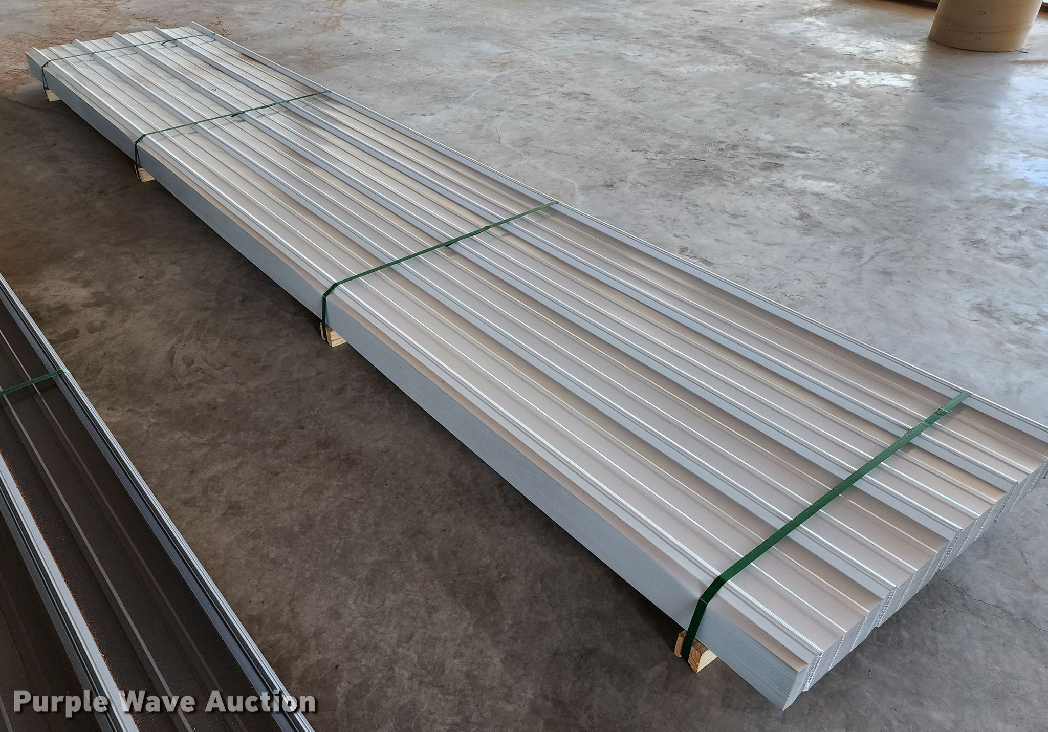 Purple Wave is selling a used Building Materials in Texas. This item is a (170) sheets of 2023 Doerkson Metal Components metal siding/roofing with the following: 16'L x 36"W overlap coverage, AG panel profile, 29 gauge, Color: White, Possible blemishes