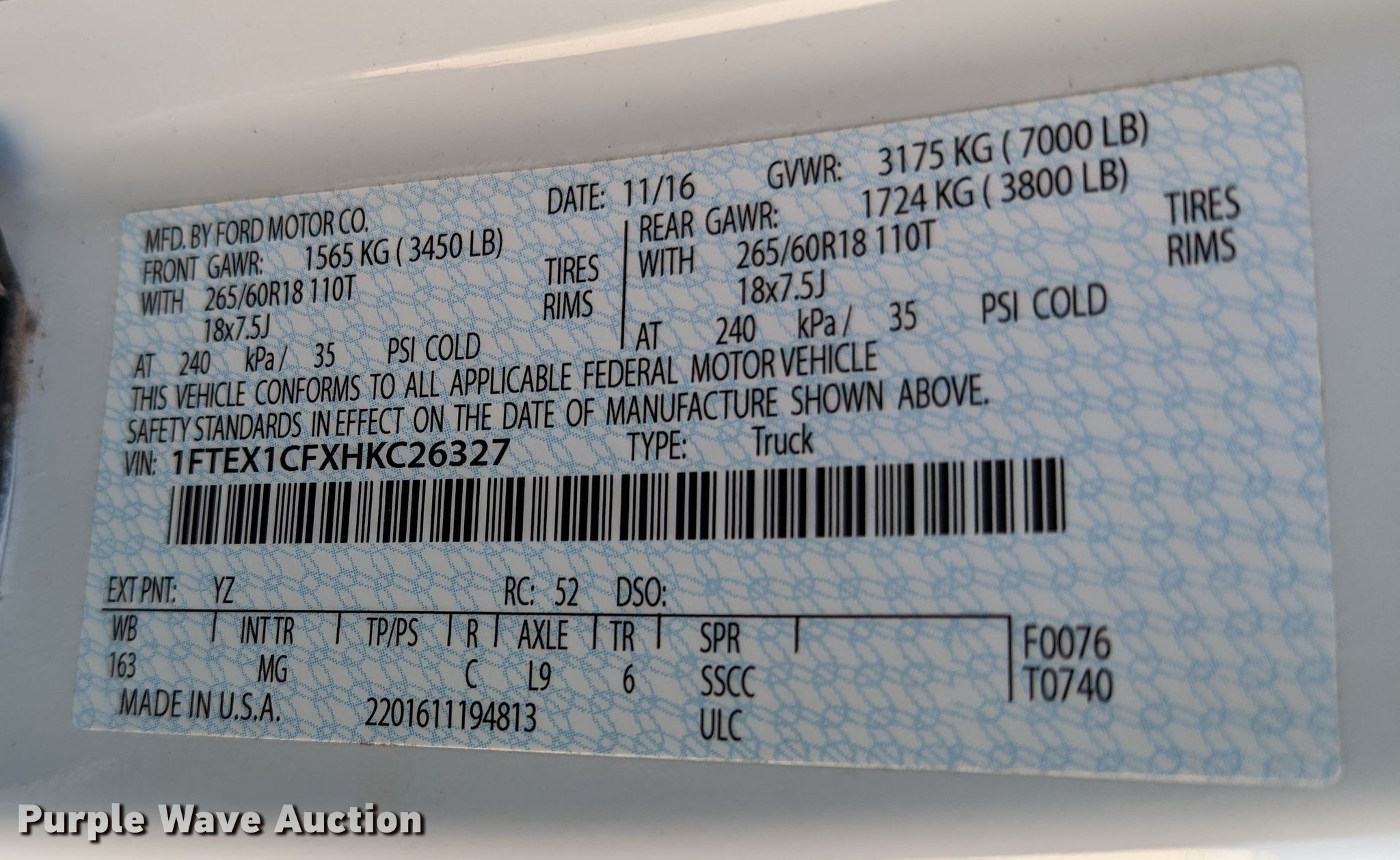 - VIN: 1FTEX1CFXHKC26327