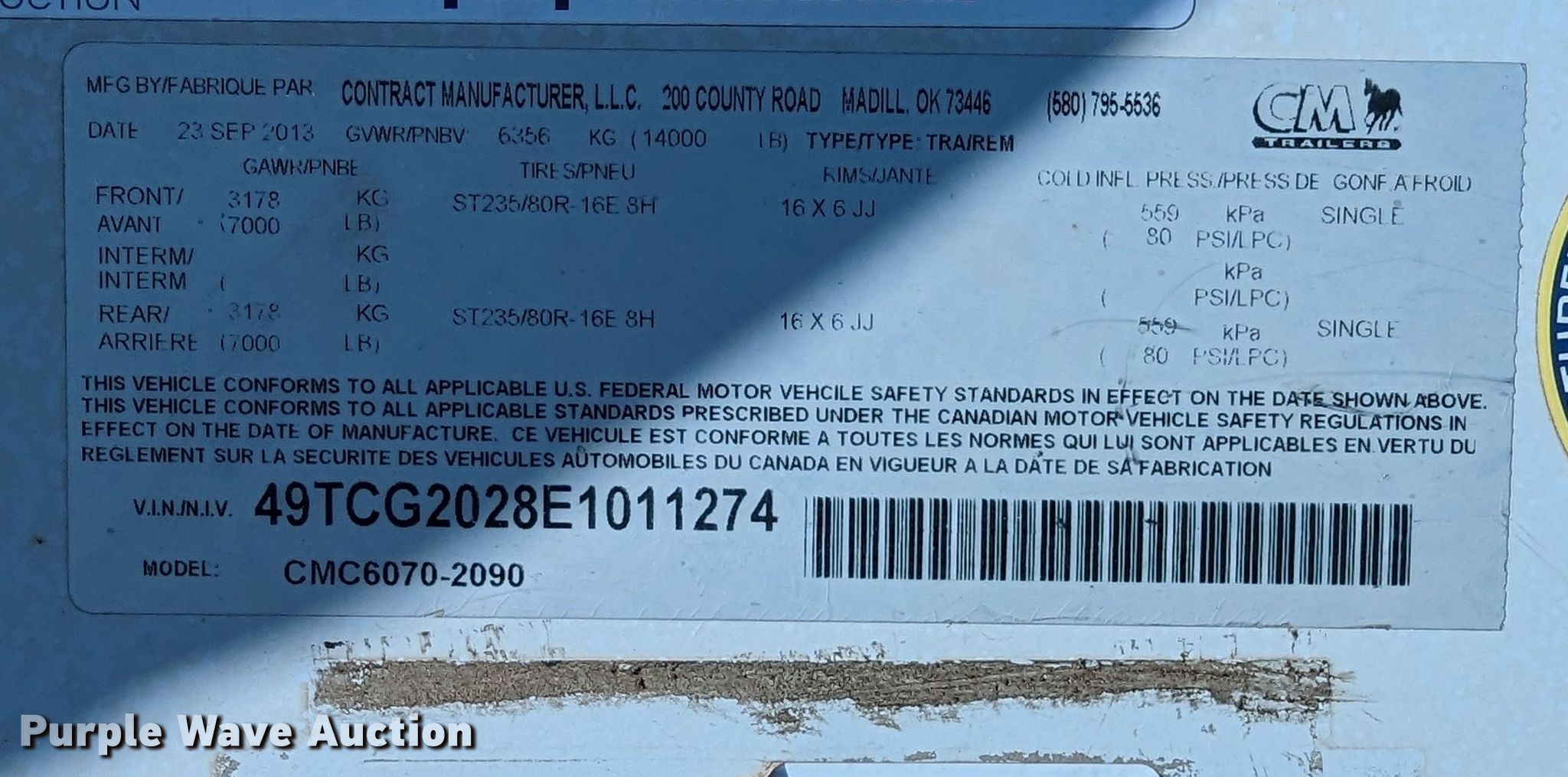 Purple Wave is selling a used Enclosed Cargo Trailer in Oklahoma. This item is a 2014 Contract Manufacturer CMC6070-2090 enclosed cargo trailer with the following: VIN: 49TCG2028E1011274, Unit #: T008