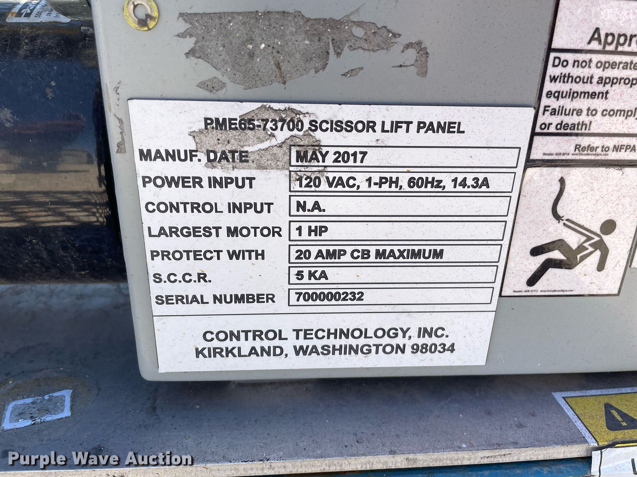 Purple Wave is selling a used Tools in Kansas. This item is a 2017 Control Technology PME65-73700 platform lift with the following: Serial: 700000232