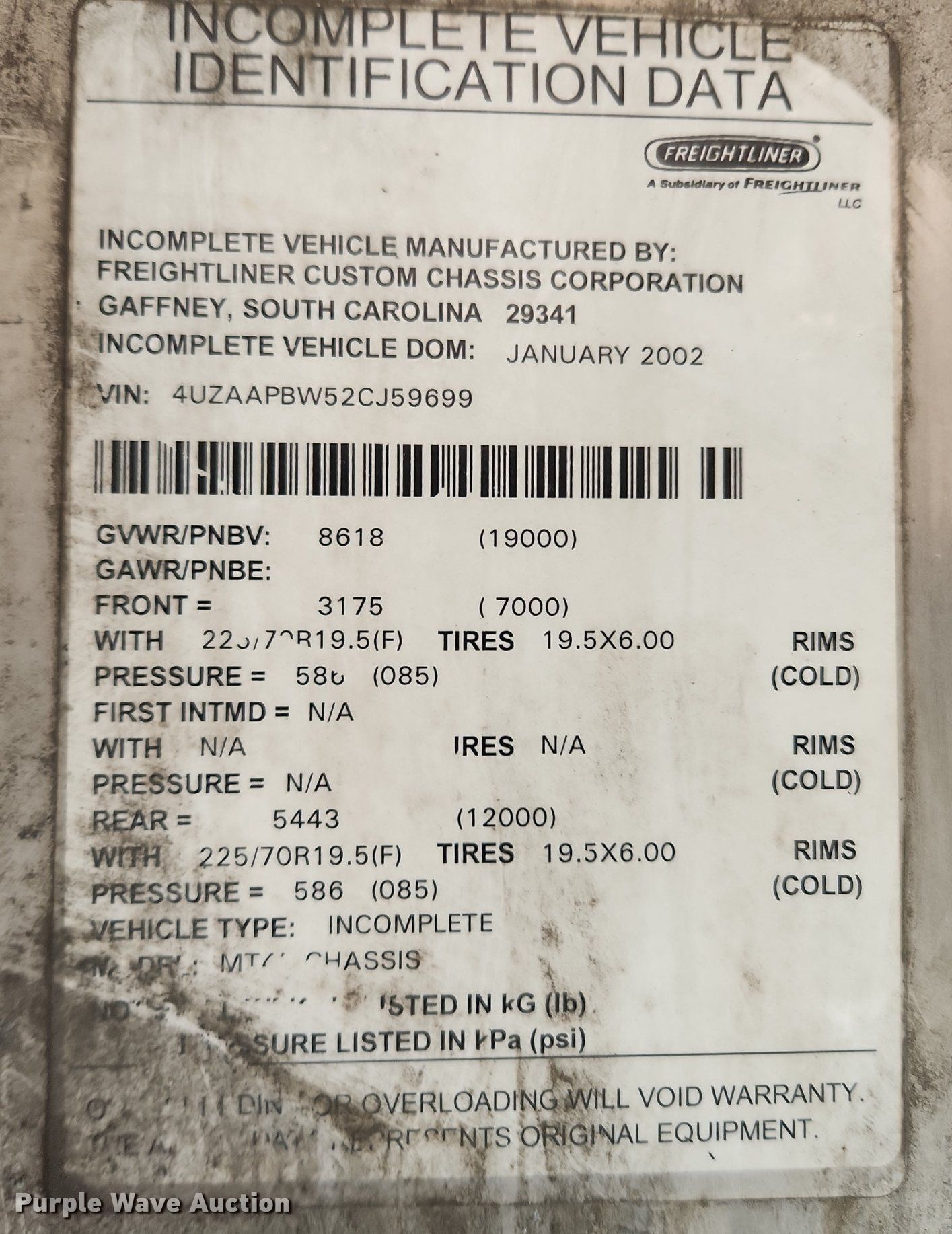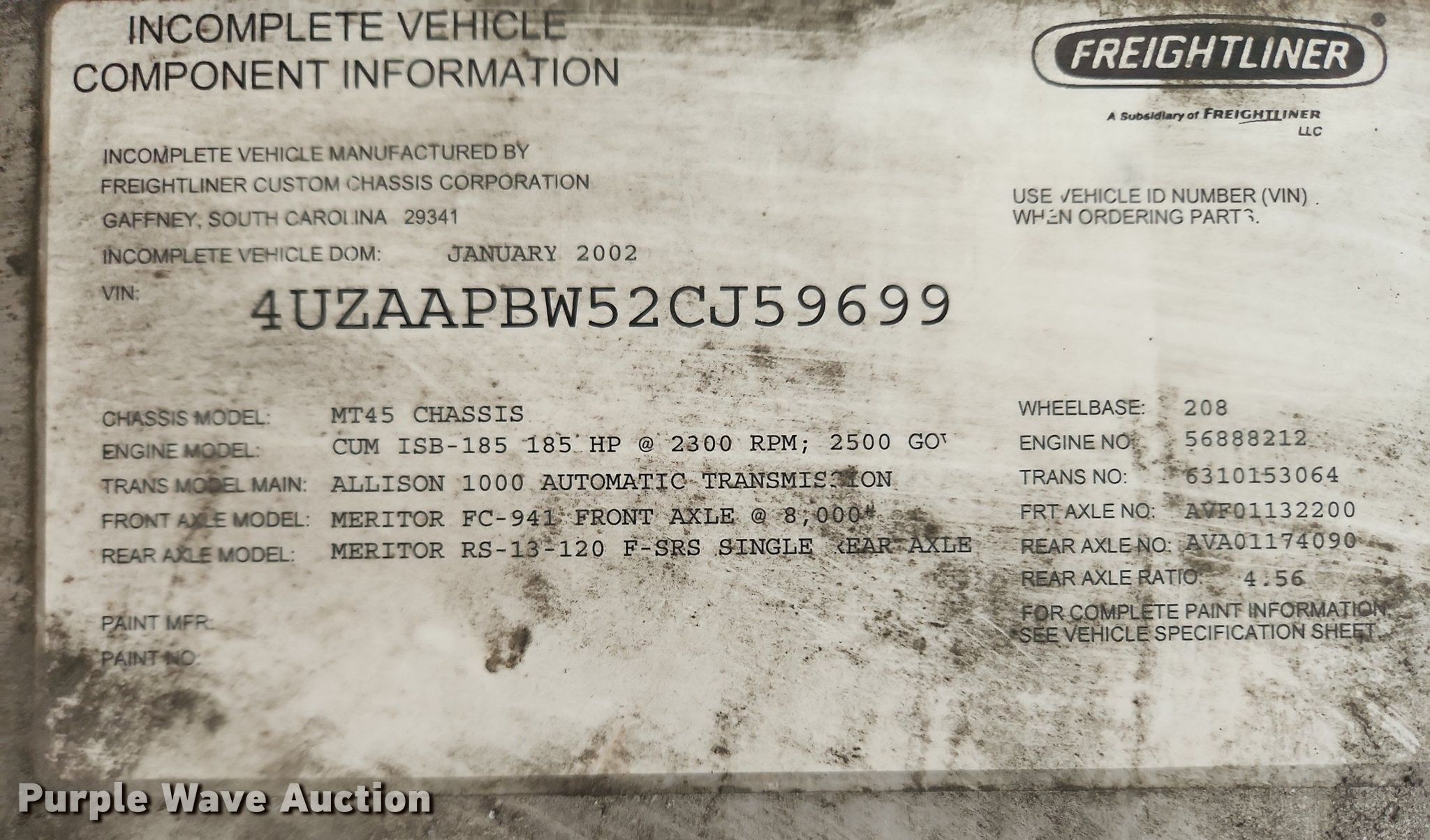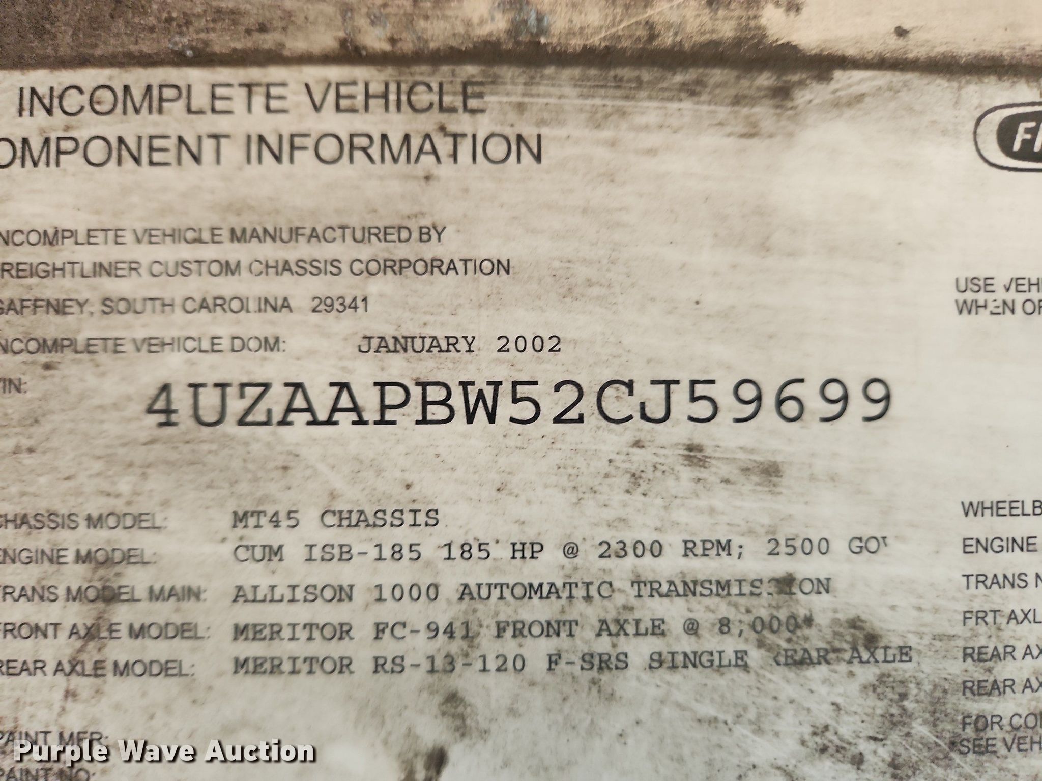 Purple Wave is selling a used Delivery Truck or Van in Illinois. This item is a 2002 Freightliner MT45 delivery van with the following: Miles: 71,421 on odometer, VIN: 4UZAAPBW52CJ59699