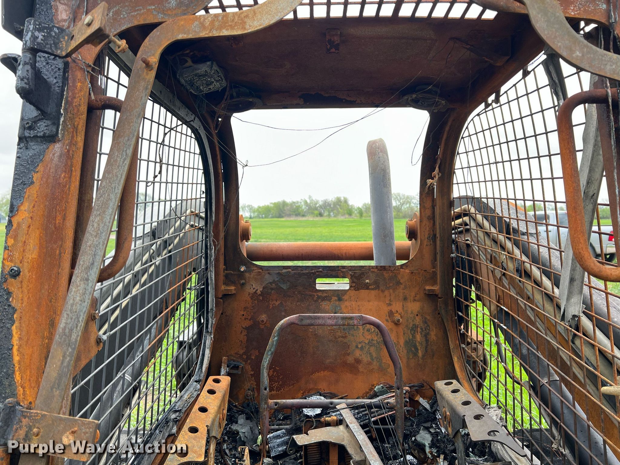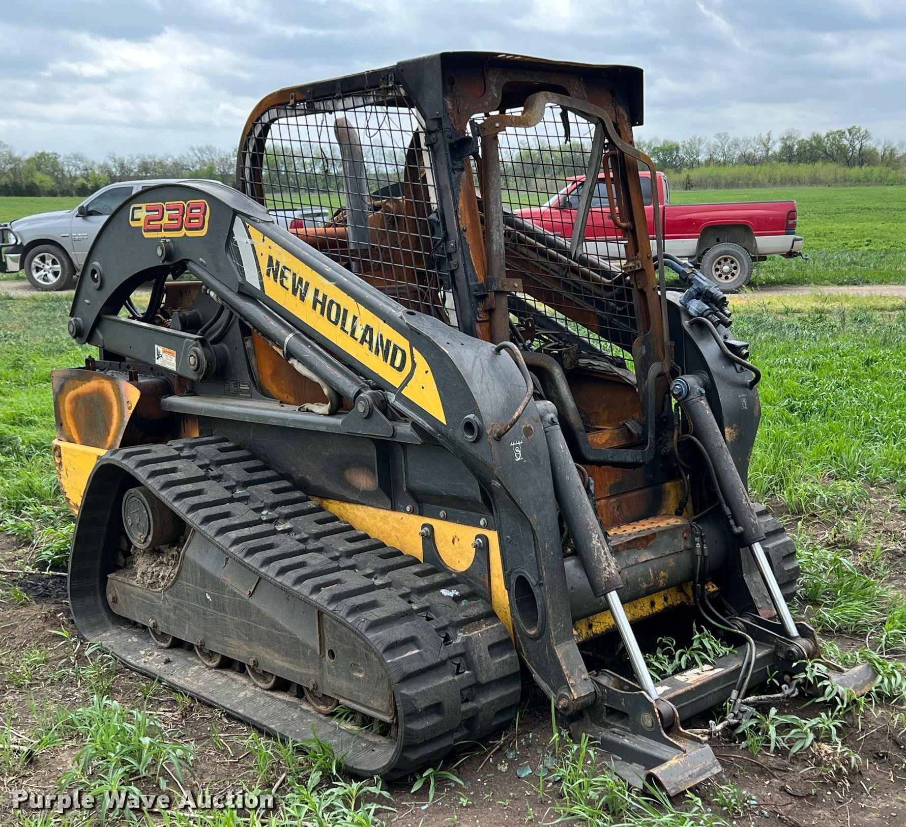2012 New Holland C238 skid steer loader. Hours: Unknown, Serial: NBM425259. Engine Cylinders: 4, Fuel type: Diesel. Transmission Hydrostatic. Operators station Enclosed cab. Features Quick coupler: Hydraulic. Tracks Width: 18". Notes Fire damage, Non-operational unit. Flyin E Brush Clipping. 16079 Udall Road. Oswego, KS 67356