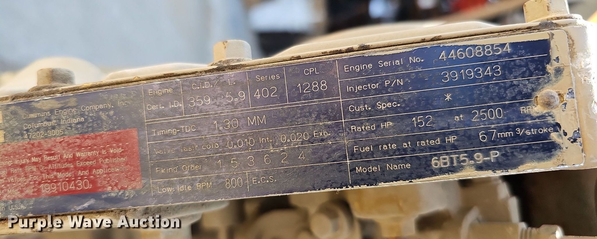 Purple Wave is selling a used Irrigation Equip. Attach. in Nebraska. This item is a Irrigation pump engine with the following: Hours: 85 on meter, Cummins 6BT5.9-P, Displacement: 5.9L, Cylinders: 6, Fuel type: Diesel, HP: 152