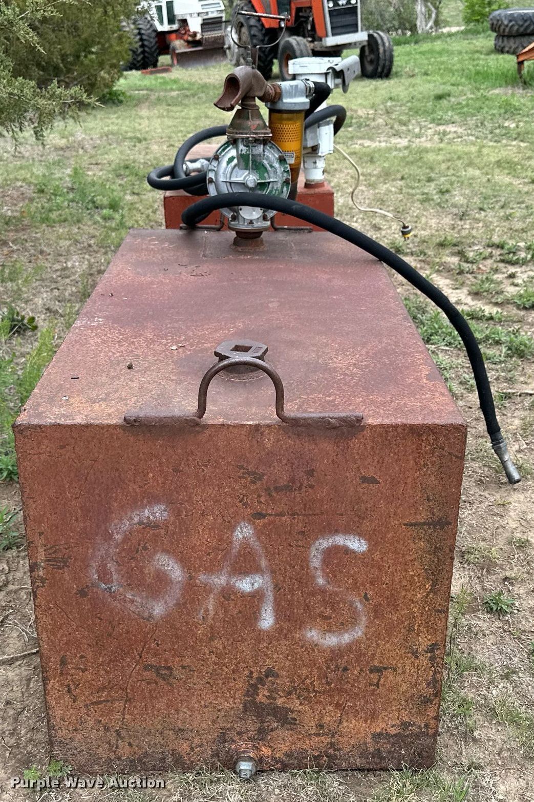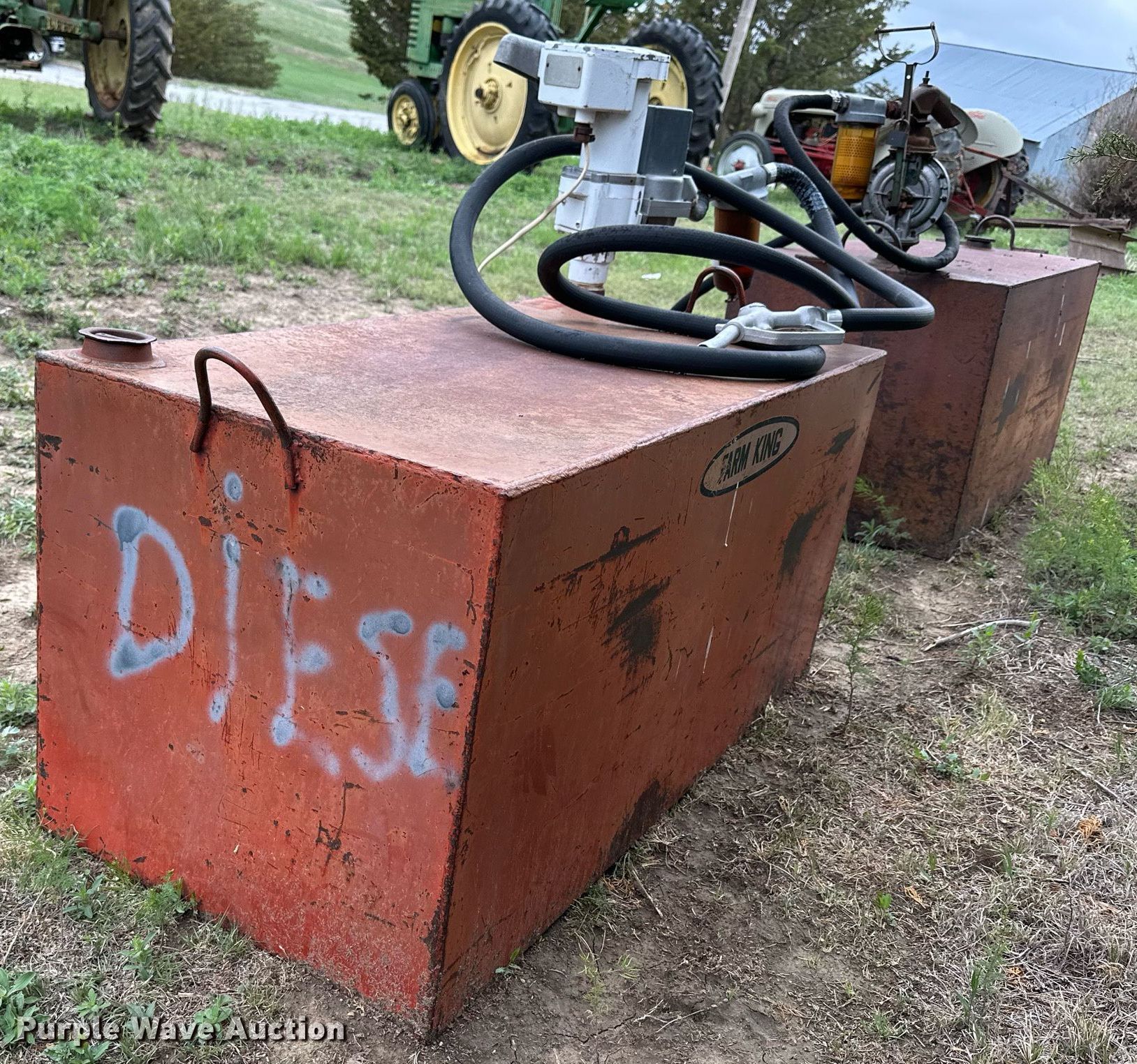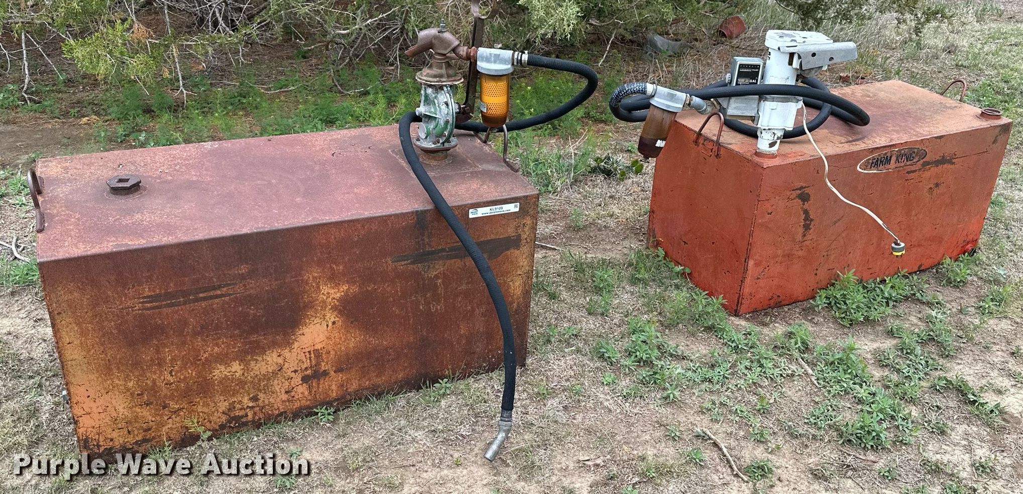 Purple Wave is selling a used Fuel and Lube in Kansas. This item is a (2) fuel tanks with the following: Fuel tank, Dimensions: 4' x 2' x 2', Approx. 110 gallons, Previously used for gas, Farm King fuel tank, Dimensions: 4' x 23" x 22", Approx. 100 gallons, Previously used for diesel