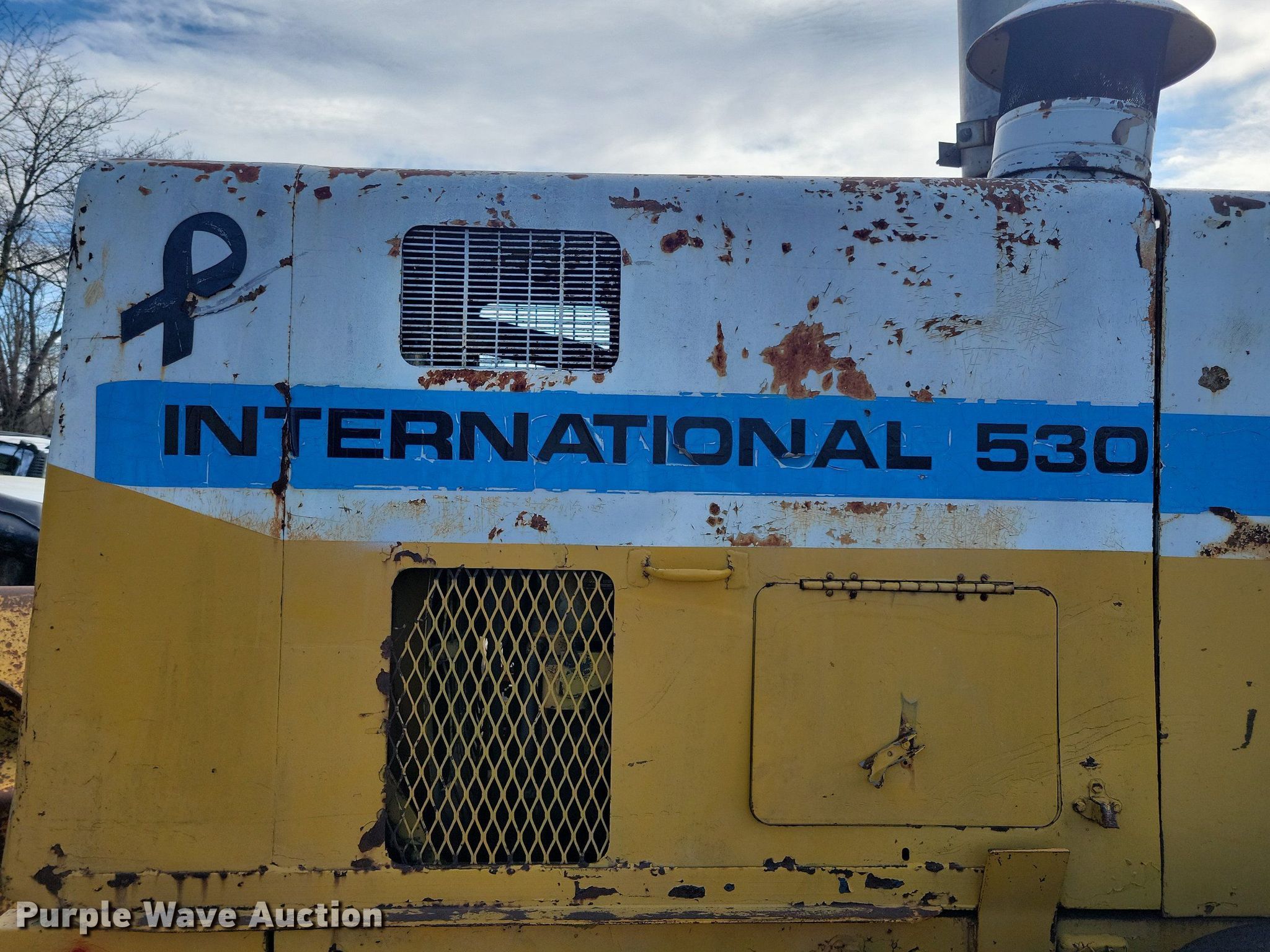 International 530 wheel loader. Hours: 1,089 on meter. Engine Serial: 602661, Cylinders: 6, Fuel type: Diesel. Transmission Powershift, 3F - 3R. Operators station Enclosed cab, Bucket controls: Two-lever. Features Bucket Width: 104", Cutting edge: Bolt-on. Tires Size: Same. Notes Injector pump issues, Glass cracked, Non-operational unit. 1625 Dixon Street. Des Moines, IA 50316