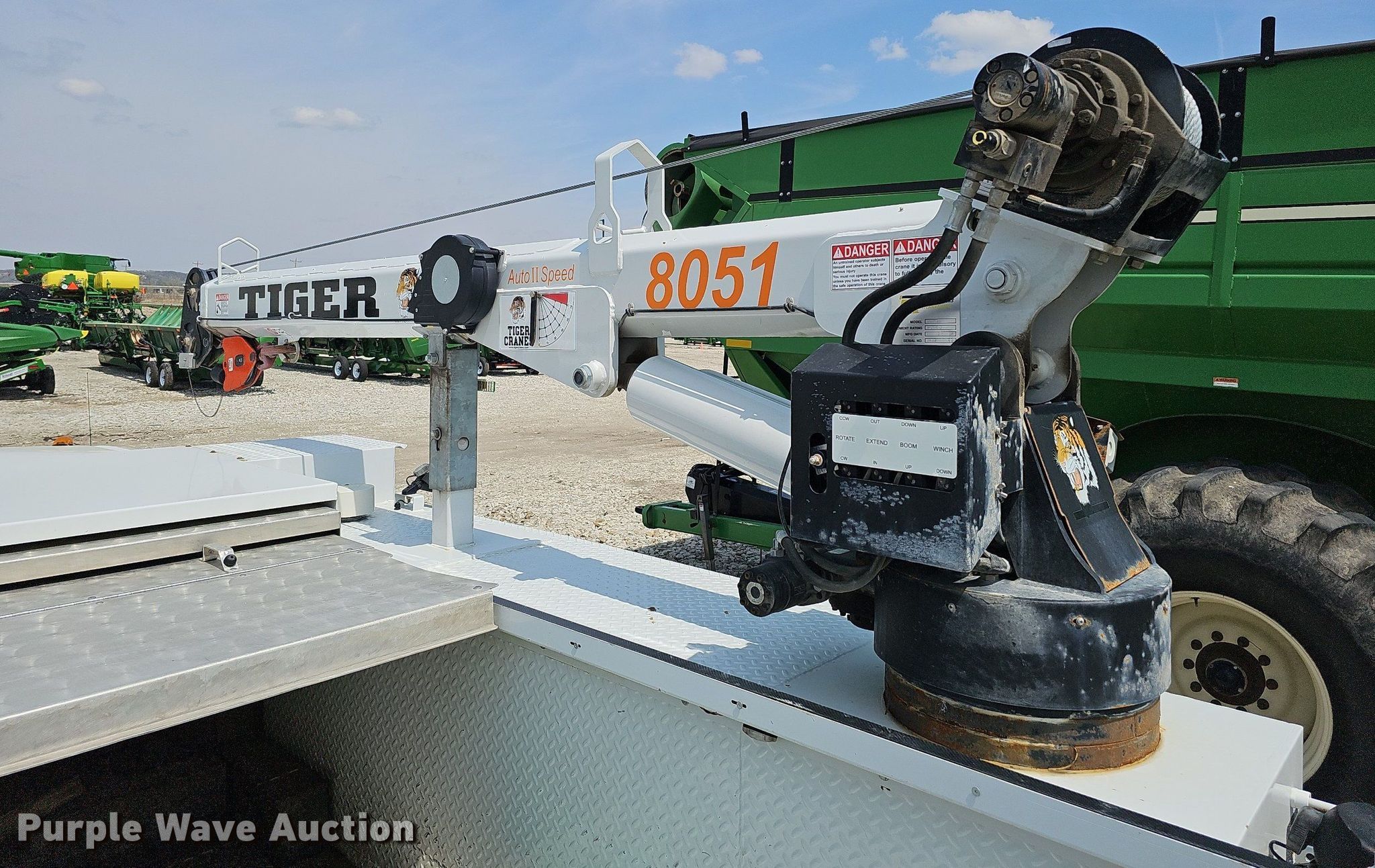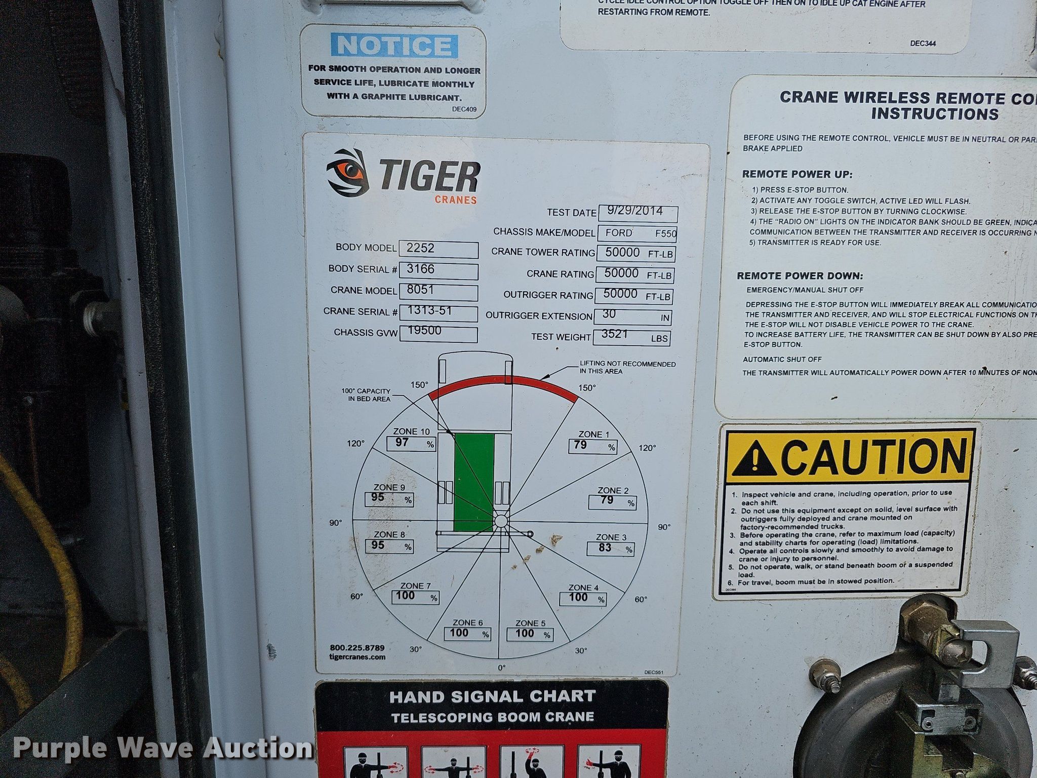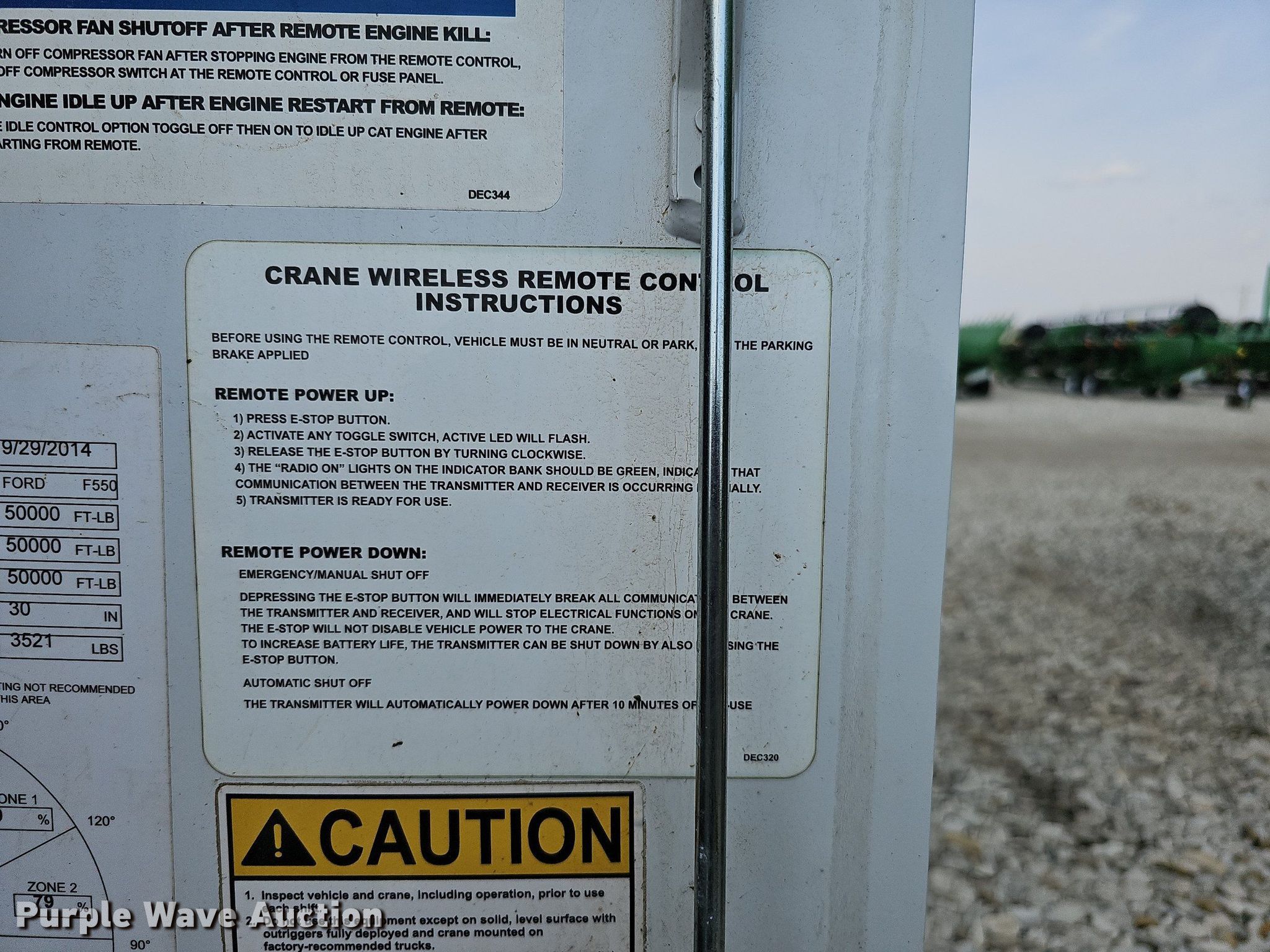 2015 Ford F550 Super Duty utility / service truck. Miles: 99,076 on odometer, VIN: 1FDUF5GY5FEB45311. Engine Displacement: 6.8L, Cylinders: 10, Fuel type: Gas. Transmission Automatic. Chassis Axles: Single, Suspension: Spring, Brakes: Hydraulic, PTO, GVWR: 19,500 lbs, Wheelbase: 165". Interior AC, Heat, Heated mirrors, Power windows, Power locks, Cruise control, Auxiliary controls. Features Bed STI 2252 13' 6" L x 95" W, Air compressor Vanair RC40, Hours: 8, Hose reel Reelcraft 7850 OLP, Crane STI Tiger 8051, Maximum boom length: 21', Maximum lift capacity: 4,300 lbs. Tires Size: 225/70R19.5. Notes Driveshaft removed but. included Non-operational engine, Non-operational unit. Iowa title. Title distribution may be delayed up to 14 days from verification of funds. AgriVision Equipment Group. 58668 190th Street. Pacific Junction, IA 51561