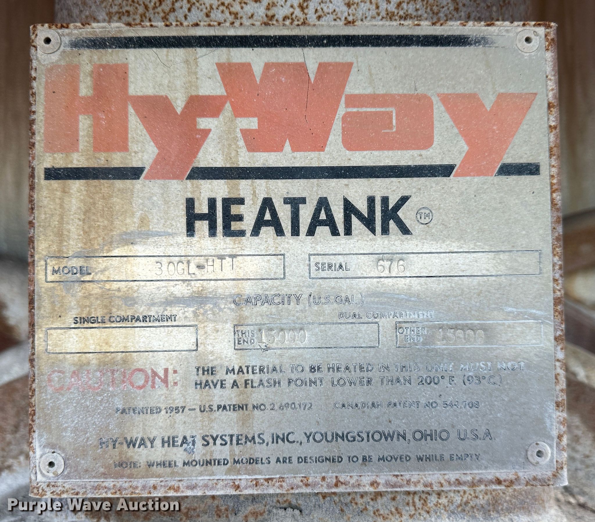 Purple Wave is selling a used Tanks in Kansas. This item is a Hy-Way HeaTank 30GL-HTT asphalt heater tank with the following: Overall: 65'L x 10'W x 10'H, Tank: 55'L x 10'H x 10' diameter, Compartments: 2, Capacity: 30,000 gallons, 6" insulation, Serial: 676