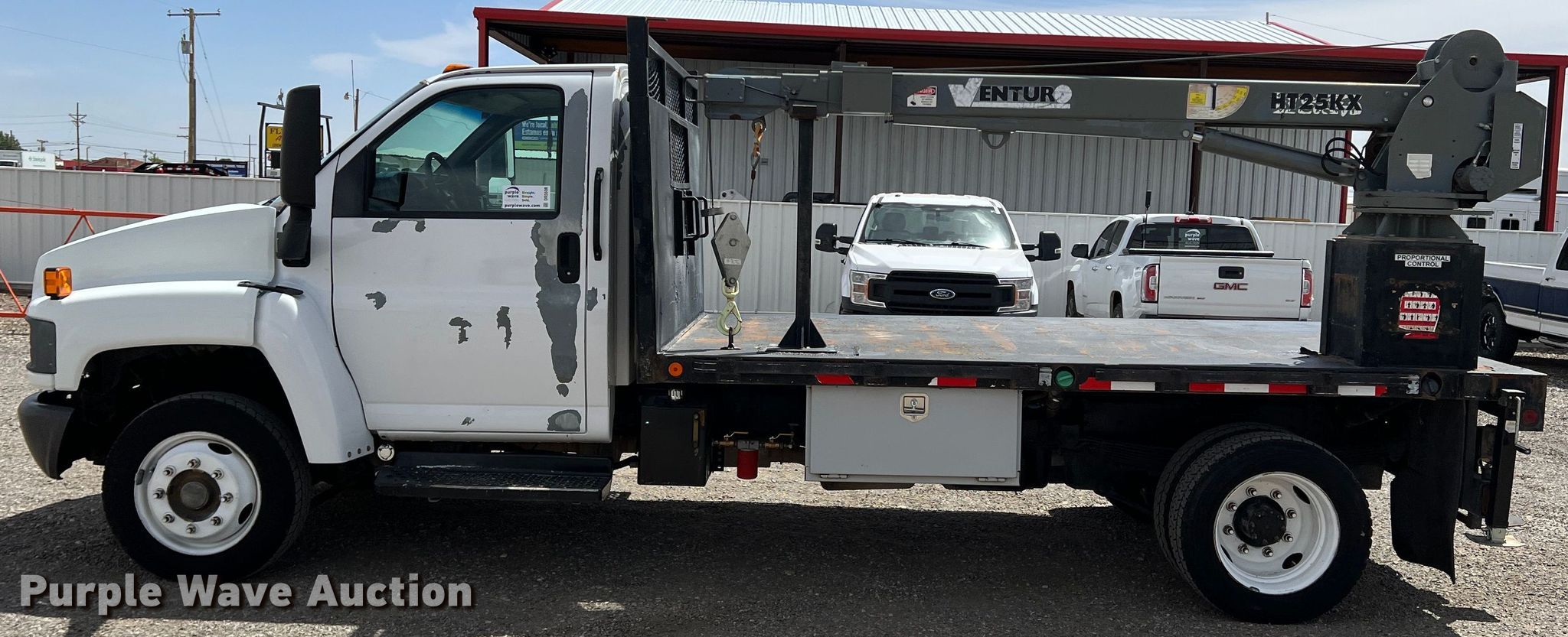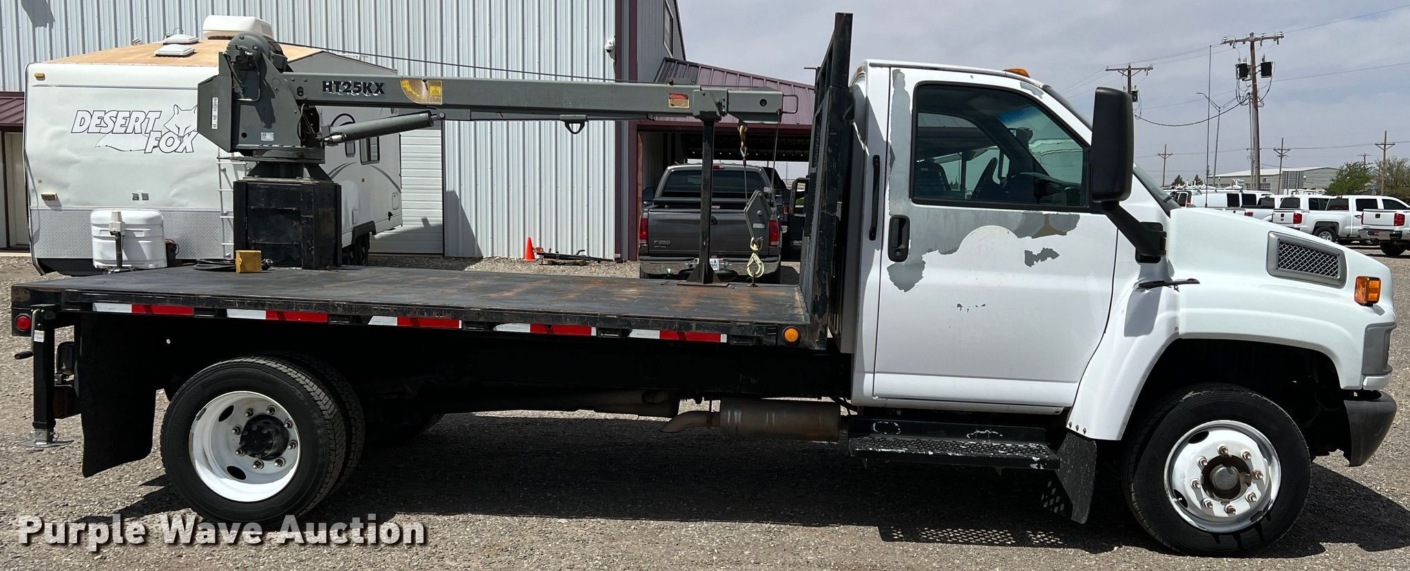 2007 Chevrolet C5500 flatbed truck. Miles: 363,309 on odometer, VIN: 1GBE5C1217F401383. Engine Displacement: 6.6L, Cylinders: 8, Fuel type: Diesel. Transmission Automatic. Chassis Axles: Single, Suspension: Spring, Brakes: Hydraulic, PTO, GVWR: 19,500 lbs. Interior AC, Heat, Cruise control. Features Flatbed 12' x 96" W, Crane Venturo HT25KX Serial: 80401, Boom Telescopic, Maximum boom length: 20', Maximum lift capacity: 5,000 lbs, Boom controls Remote control.. Tires Size: 225/70R19.5. Notes Dash warning indicator: Check engine, Windshield chipped or cracked. Texas title. Seller is a Texas licensed motor vehicle dealer. The buyer may be required to pay sales tax and/or registration fees to the dealer prior to taking possession. Title will be assigned and distributed by the dealer. Please contact the seller for distribution questions. Specialty Trucks of Lubbock. 839 US-62. Wolfforth, TX 79382