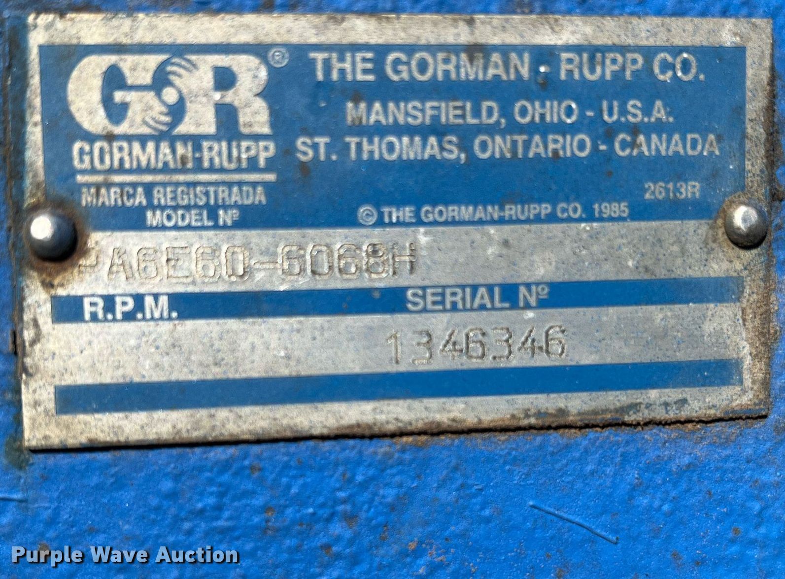 Purple Wave is selling a used Pump in Texas. This item is a Gorman Rupp PA6E60-6068H centrifugal pump with the following: Hours: 777 on meter, Serial: 1346346