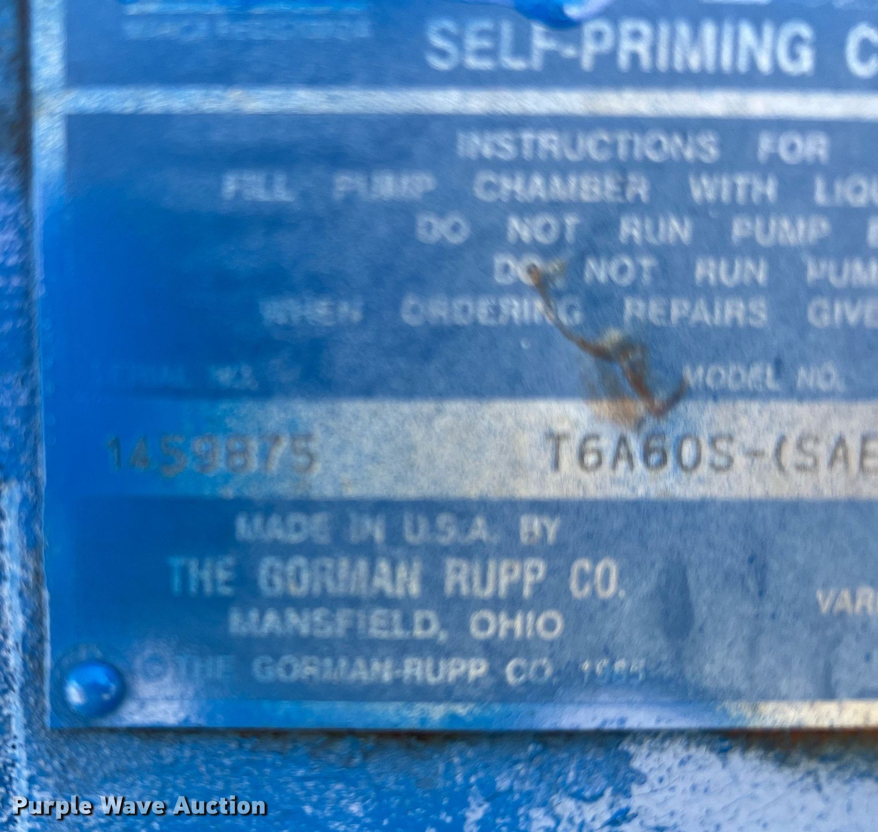 Purple Wave is selling a used Pump in Texas. This item is a Gorman Rupp T6A60S centrifugal pump with the following: Hours: 1,697 on meter, Serial: 1459875