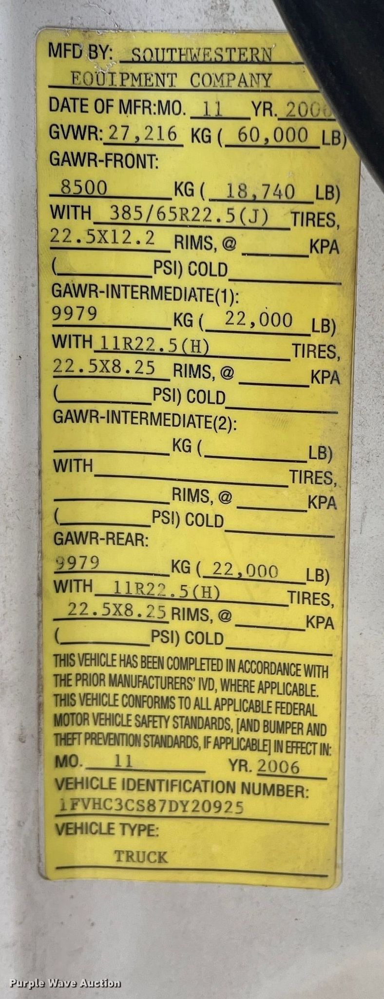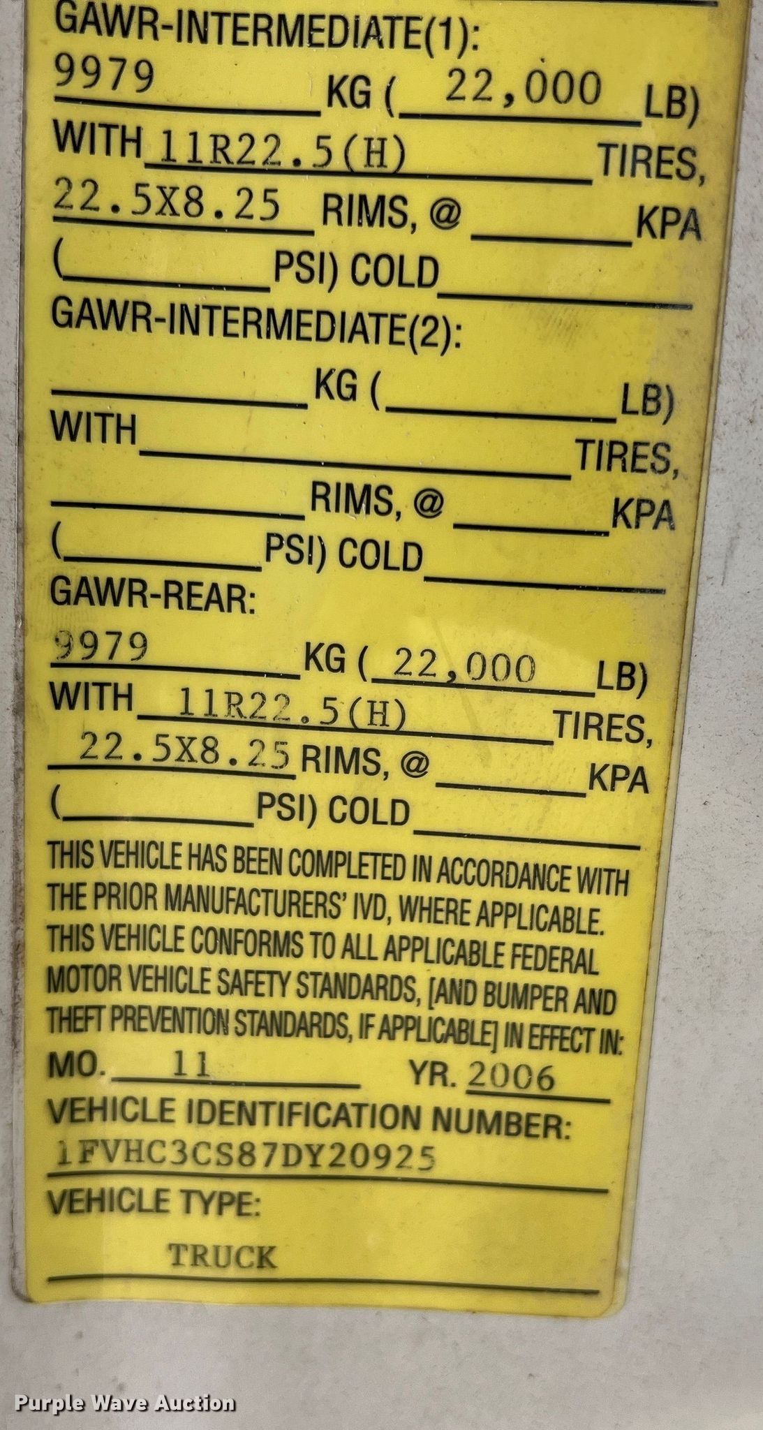 2007 Freightliner Business Class M2 dump truck. Miles: 85,179 on odometer, Hours: 4,509 on meter, VIN: 1FVHC3CS87DY20925. Engine Mercedes-Benz, Cylinders: 6, Fuel type: Diesel. Transmission Automatic. Chassis Double frame, Axles: Triple, Pusher axle, Differential lock: Inter-axle, Suspension: Spring, Brakes: Air, PTO, GVWR: 60,000 lbs FAWR: 18,740 lbs, IAWR: 22,000 lbs, RAWR: 22,000 lbs. Interior AC, Heat, Cruise control. Features Dump bed 17' L x 8' W, Side height: 41", Side board height: 7", Bed type: Steel, Roll tarp, Ram: Single , End gate: Air operated. Tires Front: 385/85R22.5, Rear: 11R22.5, Lift axle: 295/75R22.5. Texas title. Title distribution may be delayed up to 14 days from verification of funds. M CO CONSTRUCTION INC. 316 County Road 3672. Springtown, TX 76082