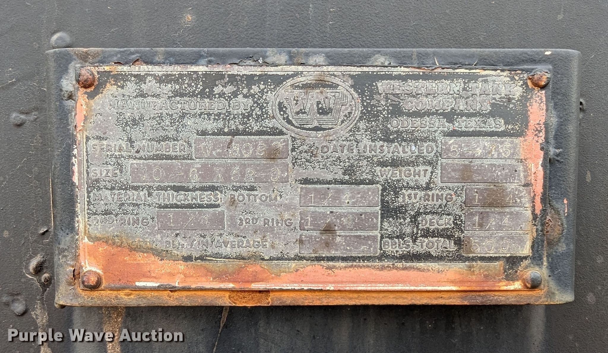 Loffland Western Tank Company 500BBL frac tank. Serial: 42-5258, W-3082, Unit #: 2. Dimensions Overall: 36' L x 10'6" W, Tank: 32' L x 10'6" W. Features Capacity: 500 BBL, Plumbing: 4", Manways: 2, Access ladder, Skid-mounted. Continental Resources, Inc.. 54441 South County Road 272. Ames, OK 73718