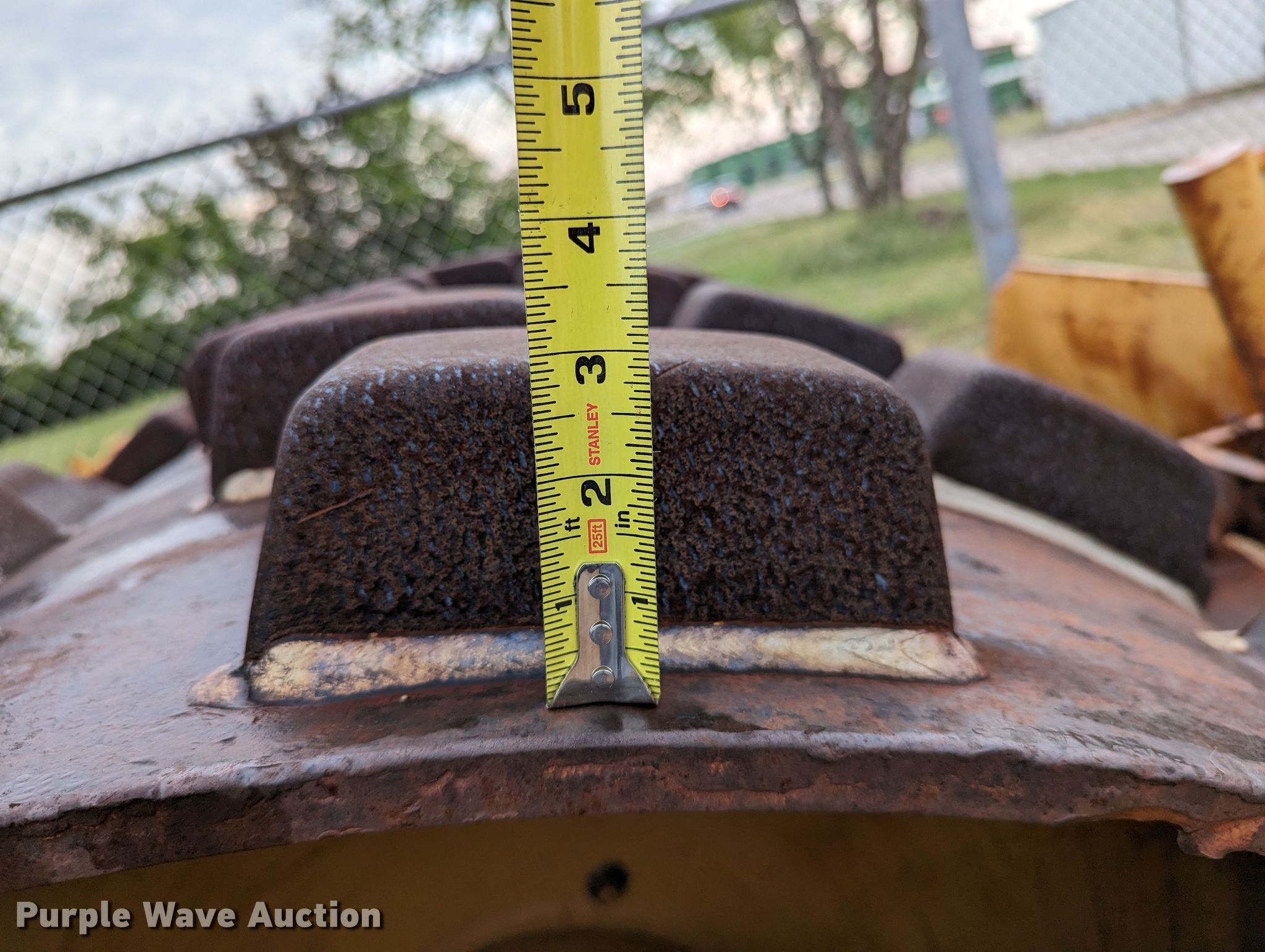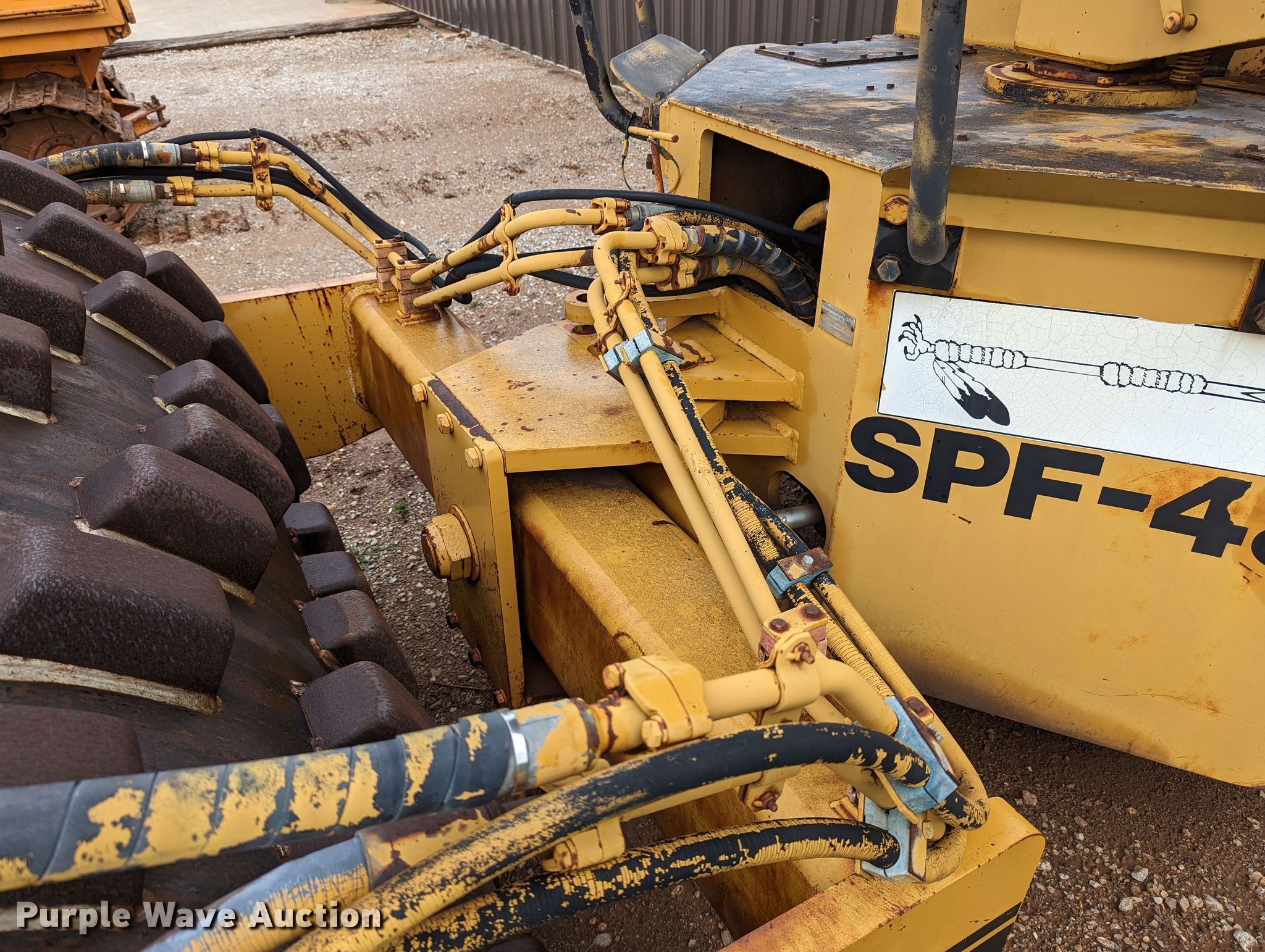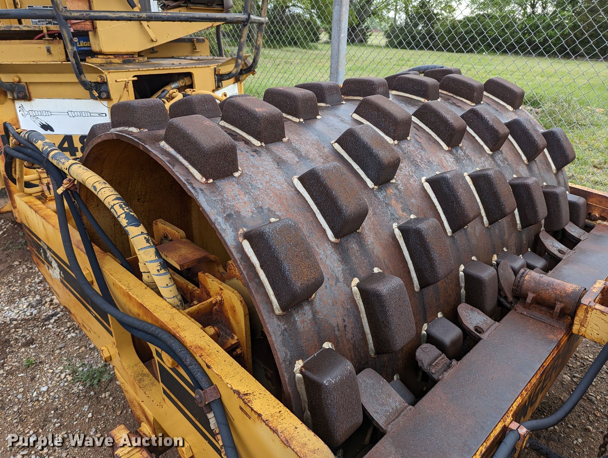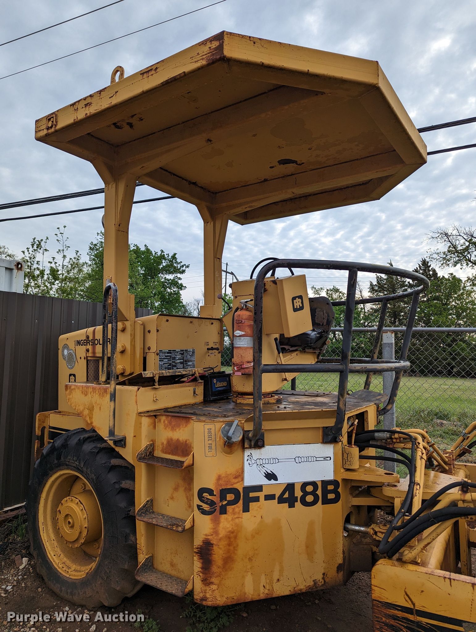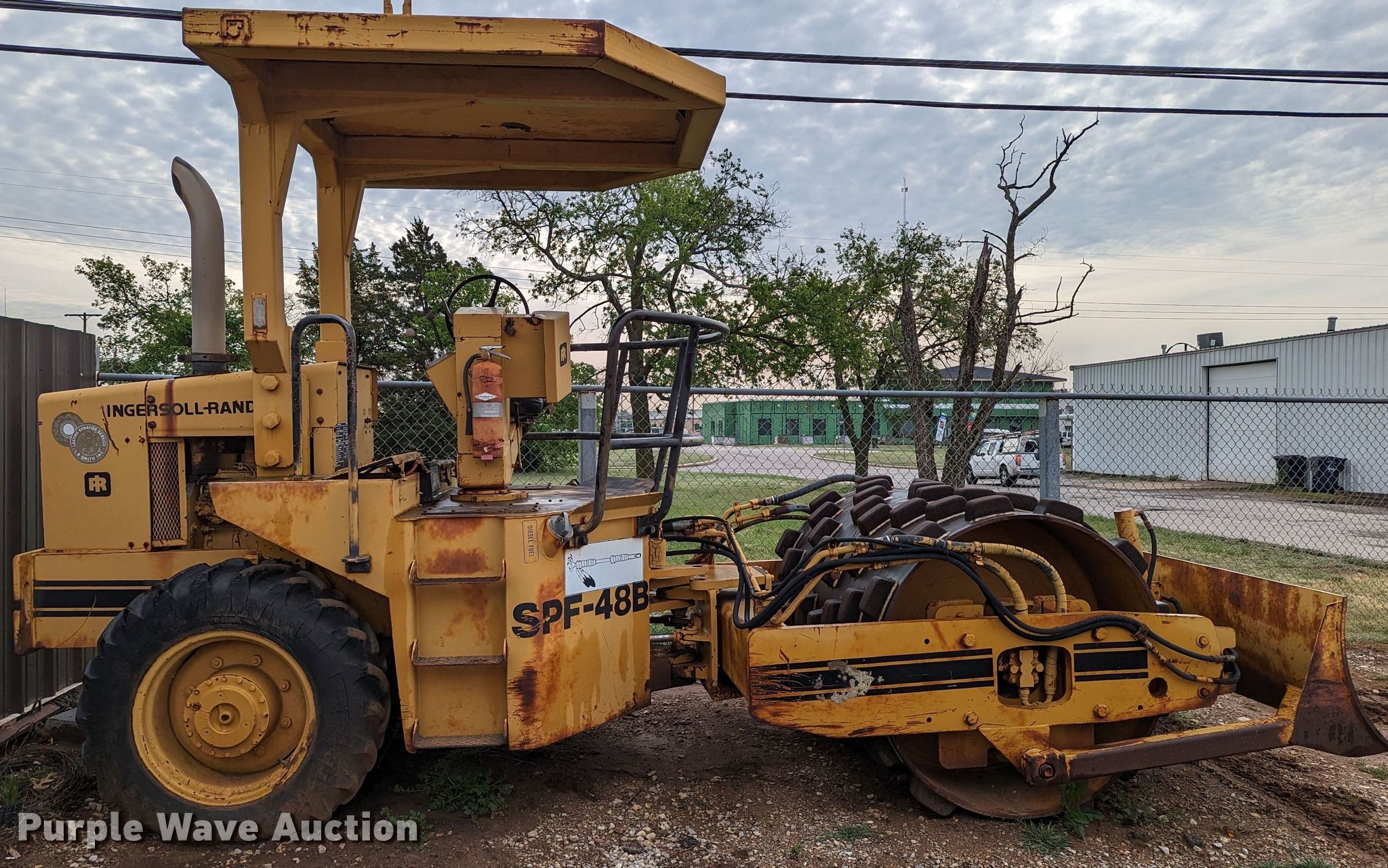 1986 Ingersoll Rand SPF-48B single drum vibratory roller. Hours: 1,349 on meter, Serial: 5854S. Engine Cylinders: 4, Fuel type: Diesel. Transmission Hydrostatic. Operators station OROPS, Vandal cover. Features Drum: Padfoot, Vibratory system: Single, Front drum Width: 66", Diameter: 48", Drum scrapers: Front, Front blade width: 84". Tires Size: 12.4-24. Notes Seal hydraulic leak. B & R Service, Inc.. 915 Northwest 73rd Street. Oklahoma City, OK 73116