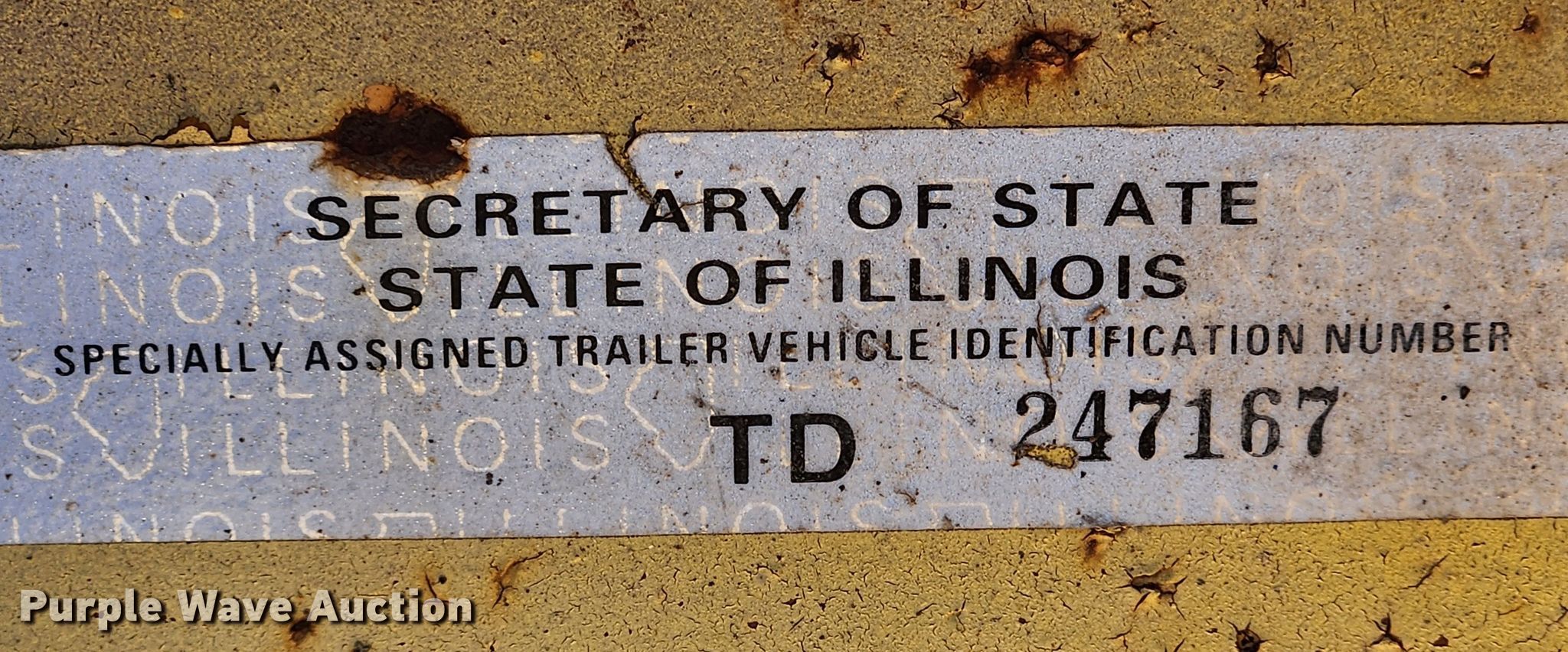Equipment trailer. VIN: TD247167. Dimensions Overall: 23' L x 91" W, Deck: 19' L x 73" W. Features Deck type: Steel. Chassis Hitch: Pintle, Landing gear: Single, Two speed, Suspension: Spring, Brakes: Electric. Tires Steel wheels, Size: 7.00-15LT. Notes Plug missing. Illinois title. Title distribution may be delayed up to 14 days from verification of funds. Ahrens Contracting. St. Louis, MO 63146