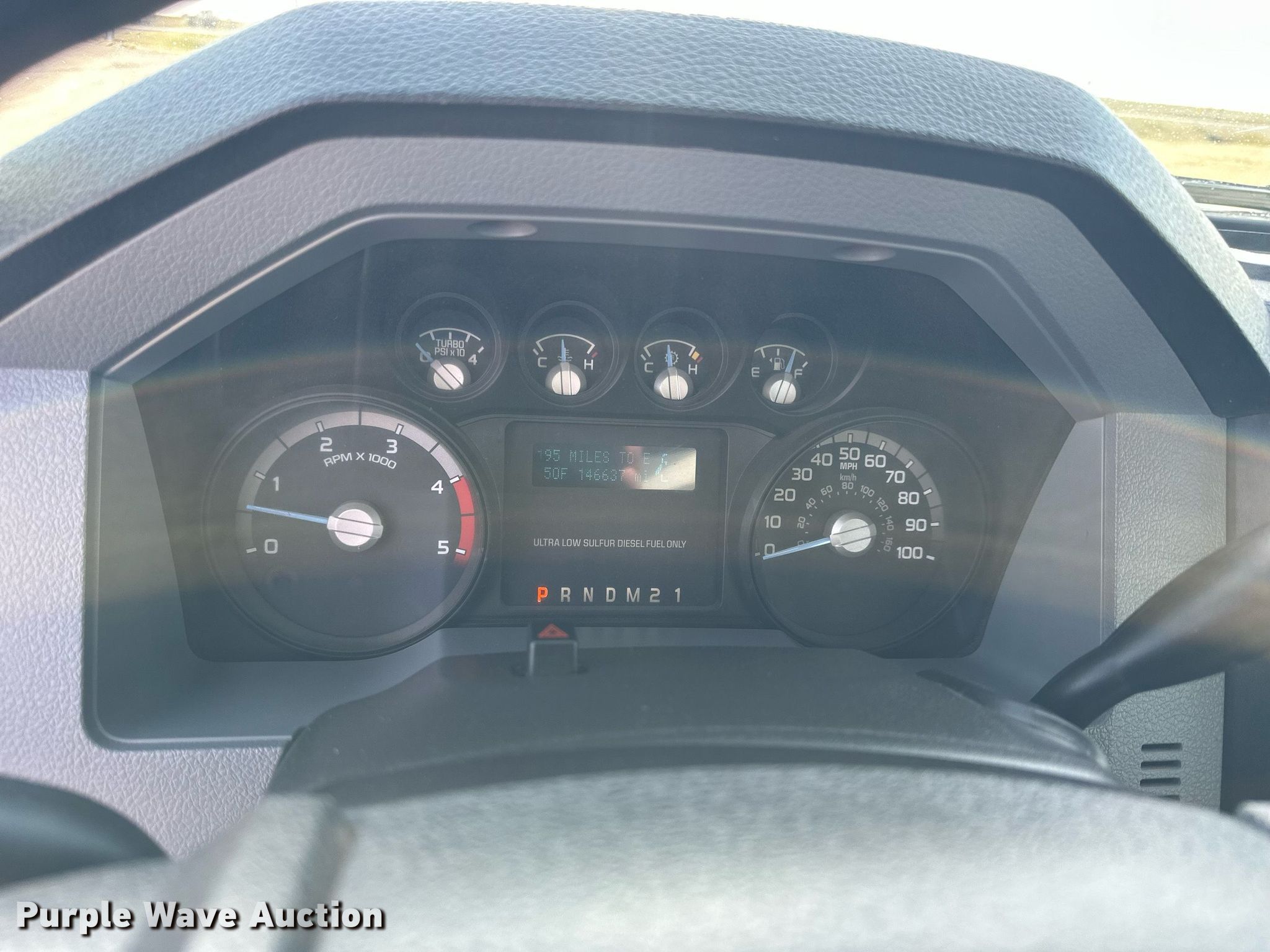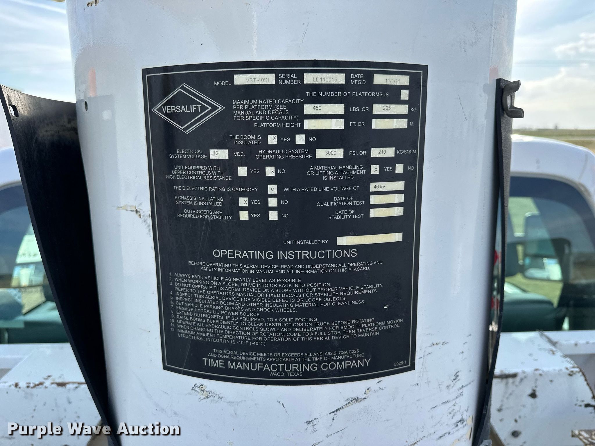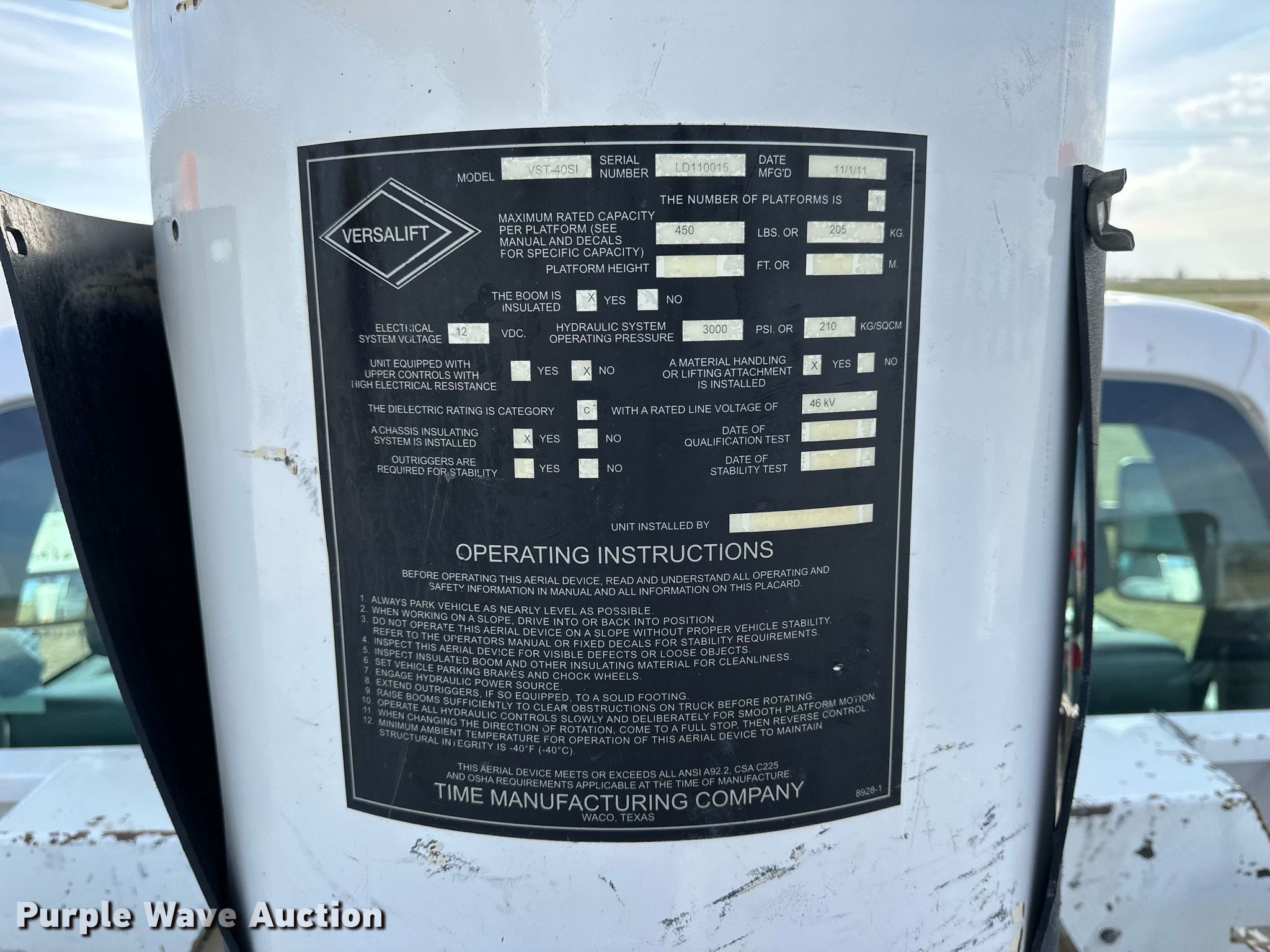 2012 Ford F550 Super Duty bucket truck. Miles: 146,637 on odometer, VIN: 1FDAF5HT7CEA66501. Engine Displacement: 6.7L, Cylinders: 8, Fuel type: Diesel. Transmission Automatic. Chassis Four wheel drive, Axles: Single, Suspension: Spring, Brakes: Hydraulic, PTO, GVWR: 19,500 lbs, Wheelbase: 165". Interior AC, Heat, Cruise control, Auxiliary controls. Features Bed Dakota Bodies 132-SB, Serial: DB13991, 13' L x 94" W, Boom 2011 Versalift VST-40SI, Serial: LD110015, Maximum lift capacity: 450 lbs, Maximum lift height: 40', Boom type: Insulated, Man basket, Boom controls Platform/ basket.. Tires Size: 225/70R19.5. Notes DEF deleted. Kansas title. Title distribution may be delayed up to 14 days from verification of funds. R.B. Electric. Gorham, KS 67640