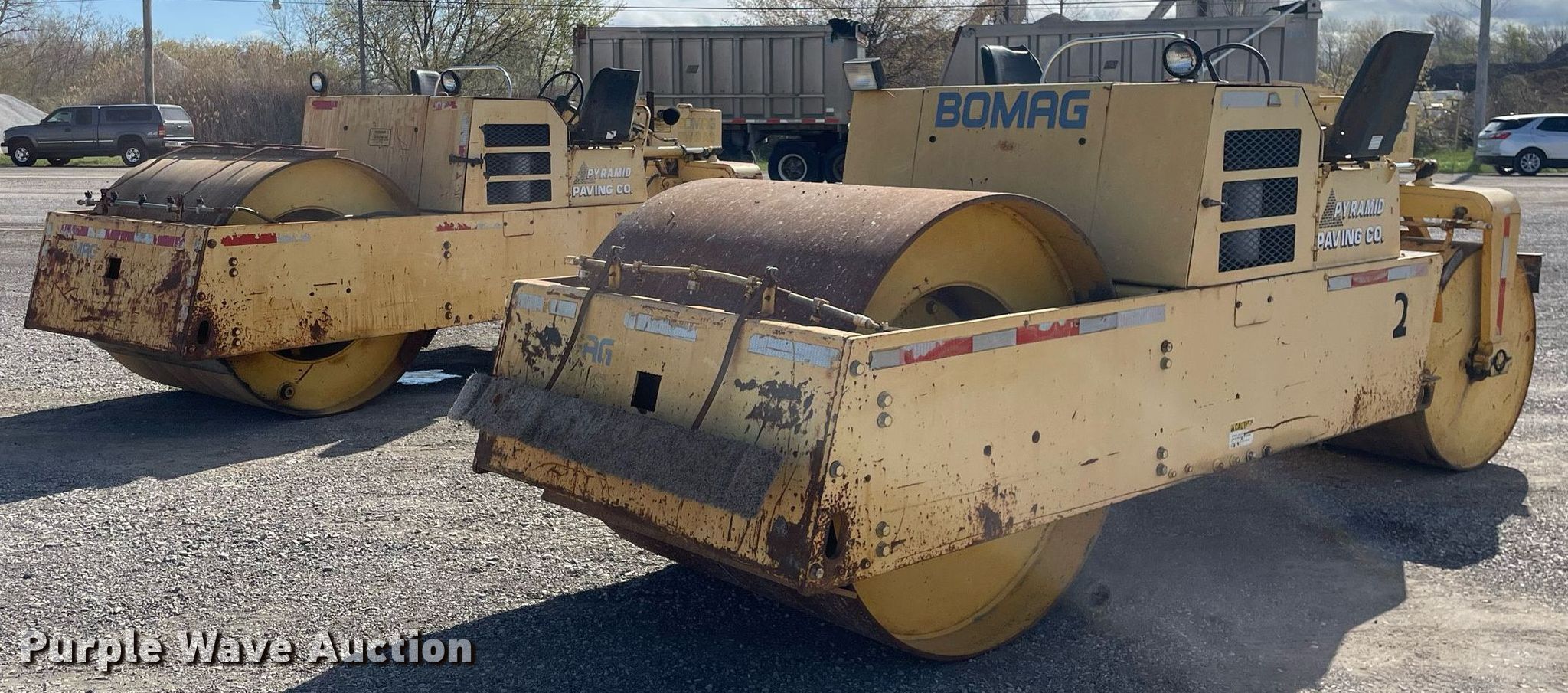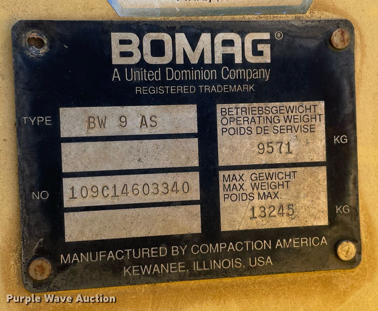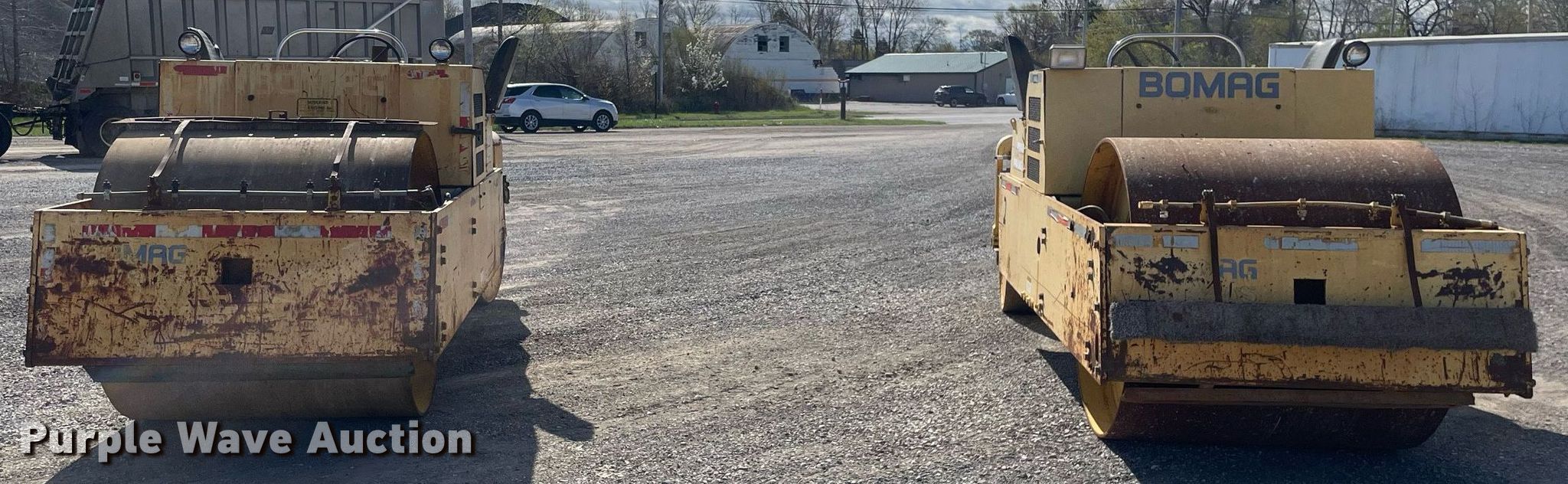 (2) double drum roller. 1994 Bomag BW9AS double drum roller. Hours: 7,709 on meter, Serial: C146C3197R, Unit #: 1. Engine Cummins 4B3.9-C, Displacement: 3.9L, Cylinders: 4, Fuel type: Diesel, HP: 76. Transmission Hydrostatic, Two speed travel. Operators station Vandal cover. Features Drum: Smooth, Front drum Width: 49.5", Diameter: 39.5", Rear drum Width: 50", Diameter: 52.5", Drum scrapers: Front, Rear, Water spray applicator: Front, Rear. Notes Hydraulic oil leak , Engine issues, engine smokes. 2000 Bomag BW9AS double drum roller Hours: 5,301 on meter, Serial: 109C14603340, Unit #: 2. Engine Cummins B3.9-C, Displacement: 3.9L, Cylinders: 4, Fuel type: Diesel. Transmission Hydrostatic, Two speed travel. Operators station Vandal cover. Features Drum: Smooth, Front drum Width: 49.5", Diameter: 39.5", Rear drum Width: 50", Diameter: 52.5", Drum scrapers: Rear, Water spray applicator: Front, Rear. 1503 Pine St. Essexville, MI 48708