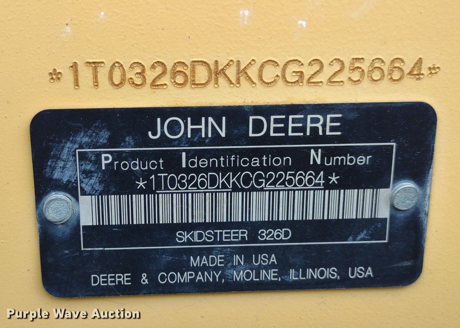 Purple Wave is selling a used Skid Steer Loader in Missouri. This item is a 2012 John Deere 326D skid steer loader with the following: Hours: 2,918 on meter, Serial: 1T0326DKKCG225664