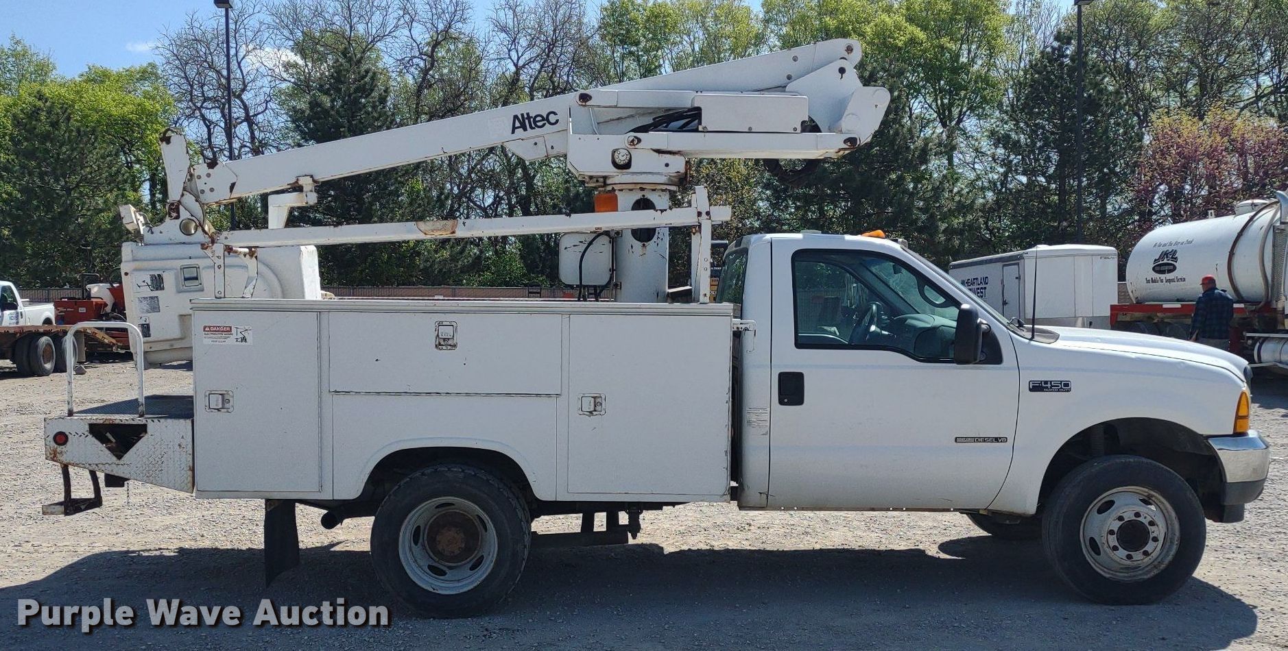 2001 Ford F450 Super Duty XL bucket truck. Miles: 187,200 on odometer, VIN: 1FDXF46F61EB58701. Engine Displacement: 7.3L, Cylinders: 8, Fuel type: Diesel. Transmission Automatic. Chassis Axles: Single, Suspension: Spring, Brakes: Hydraulic, PTO, GVWR: 15,000 lbs. Interior AC, Heat, Brake controller. Features Bed Altec, Serial: 57-12694, 11' 7" L x 7' 10" W, Boom Altec 235, Serial: 0601BX1307, Maximum lift capacity: 300 lbs, Maximum lift height: 35', Boom type: Articulating, Telescopic, Man basket, Boom controls Ground, Platform/ basket.. Tires Size: 225/70R19.5. Kansas title. Title distribution may be delayed up to 14 days from verification of funds. Heartland Midwest LLC. 15795 South Mahaffie Street. Olathe, KS 66062