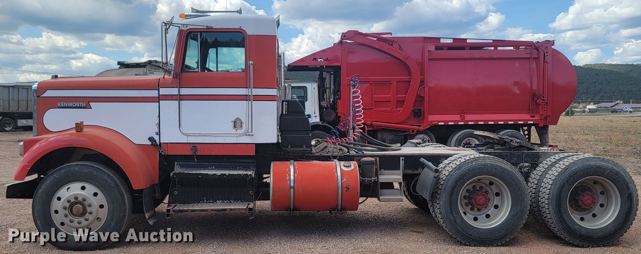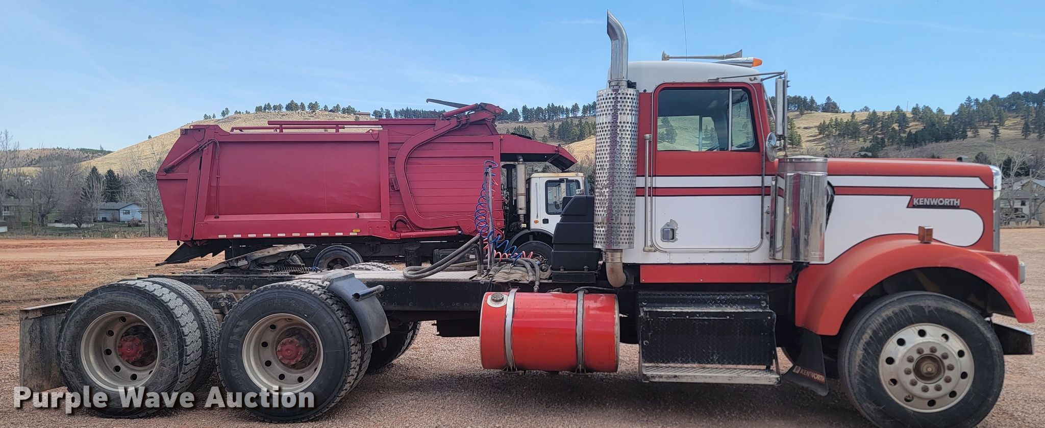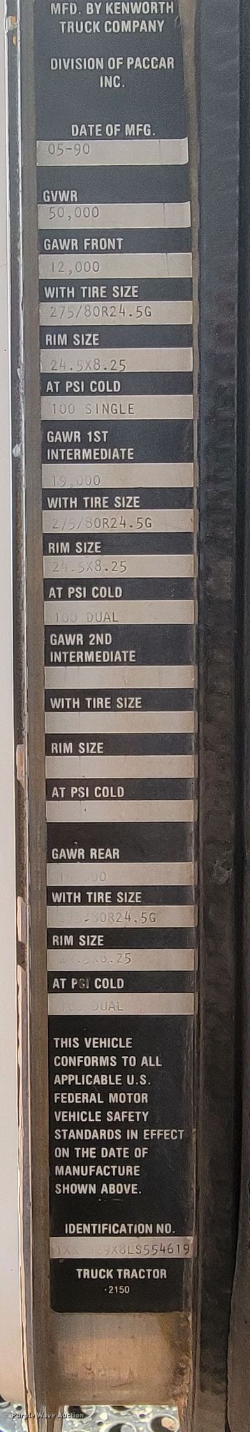 1990 Kenworth W900 semi truck. Miles: 803,841 on odometer Actual miles unknown, VIN: 1XKWD29X8LS554619. Engine Cummins NTC, Displacement: 14.0L, Cylinders: 6, Fuel type: Diesel, Engine brake. Transmission Manual. Chassis Axles: Tandem, Differential lock: Inter-axle, Suspension: Air Dump valves, Brakes: Air, PTO, Wet kit, GVWR: 50,000 lbs FAWR: 12,000 lbs, IAWR: 19,000 lbs, RAWR: 19,000 lbs. Interior AC, Heat, Cruise control. Features Deck plate: Aluminum, Fifth wheel type: Air operated, Sliding, Fuel tank: Dual. Tires Size: 11R24.5. Notes Odometer may have been replaced. South Dakota title. Mileage has not been verified. Odometer discrepancy will be marked on the title. Title distribution may be delayed up to 14 days from verification of funds. Iron Outfitter Waste Services Inc.. 7481 Stagestop Road. Black Hawk, SD 57718