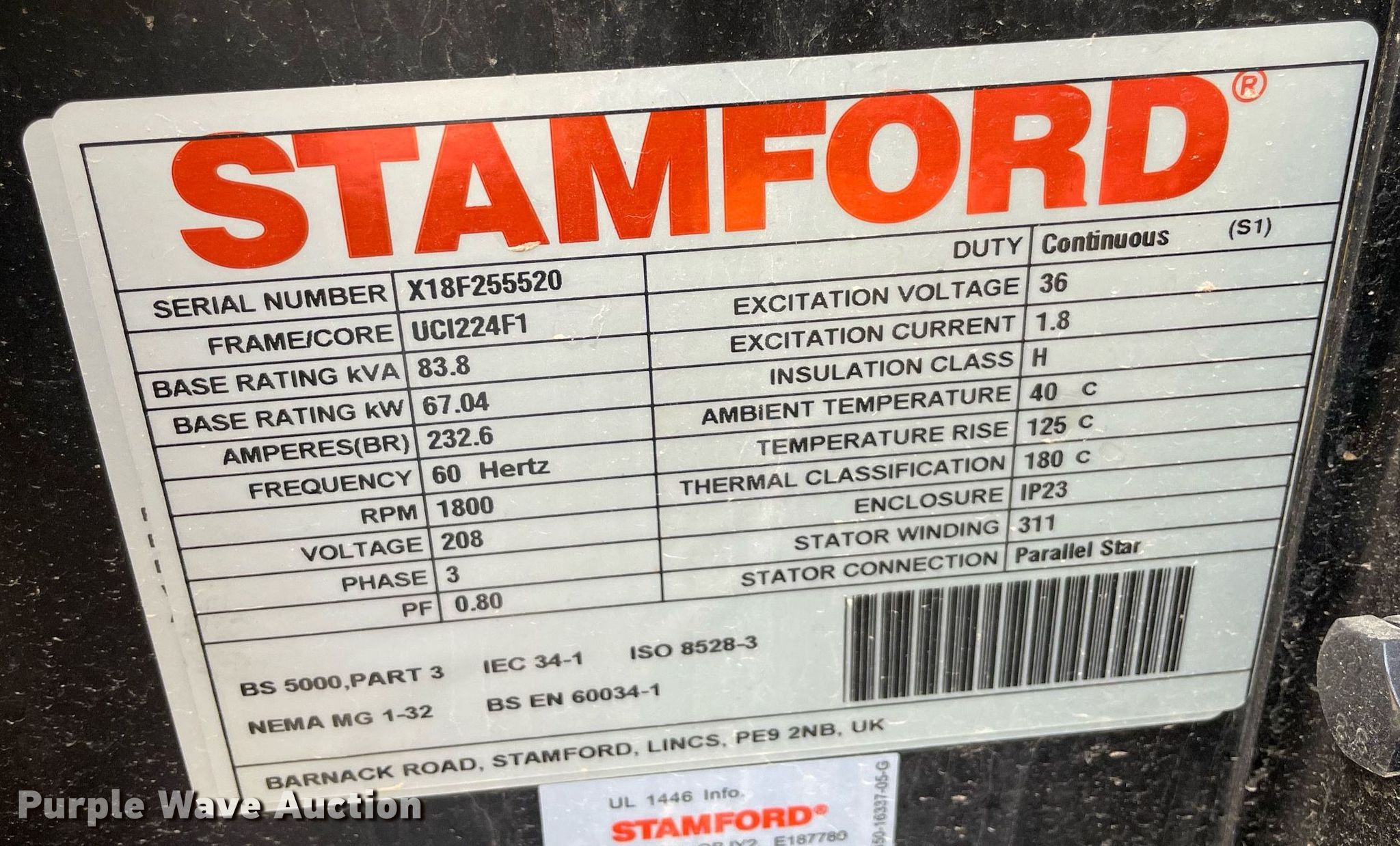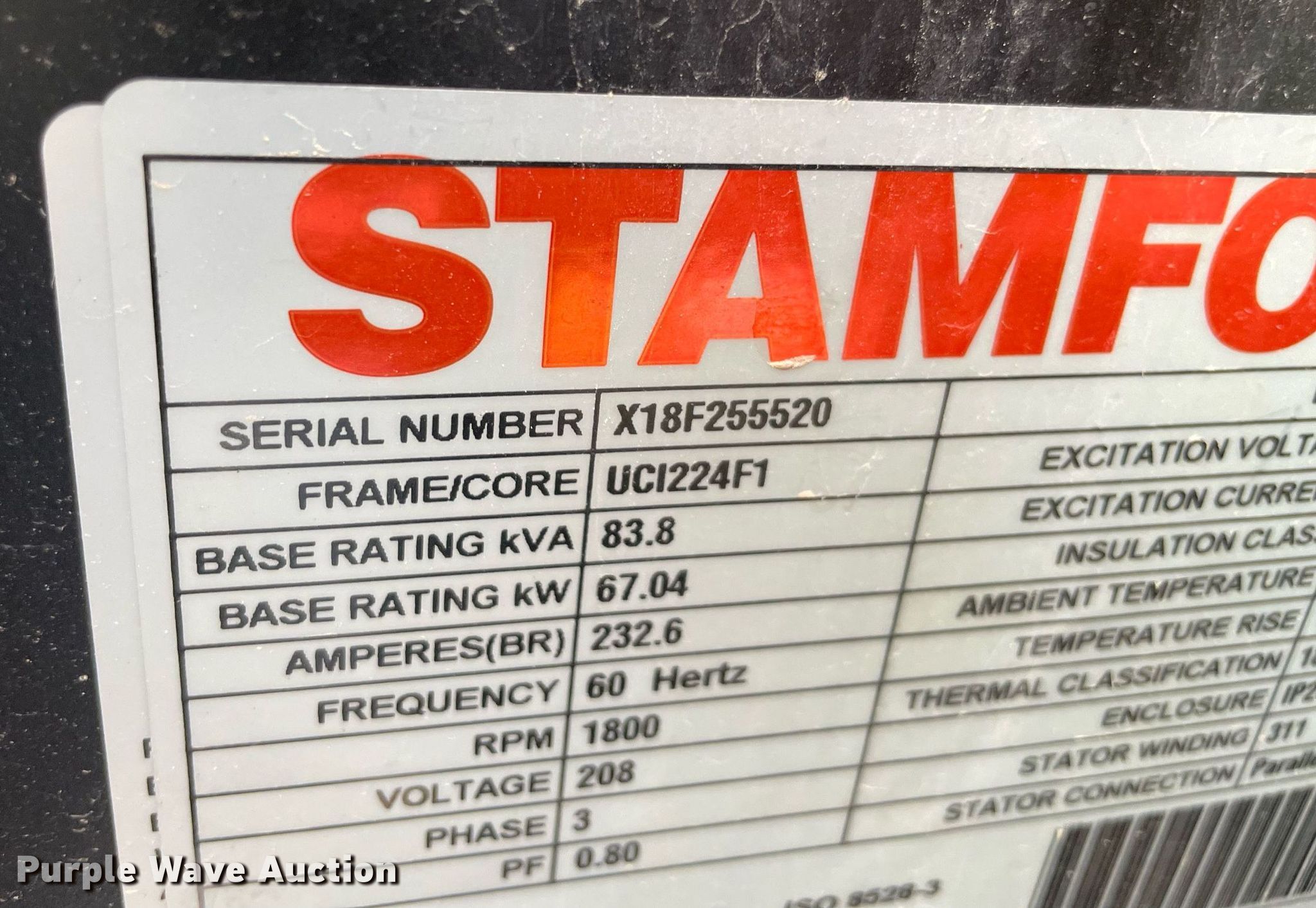 Purple Wave is selling a used Generator Set in Oklahoma. This item is a Stamford generator with the following: Hours: 539 on meter, Serial: X18F255520