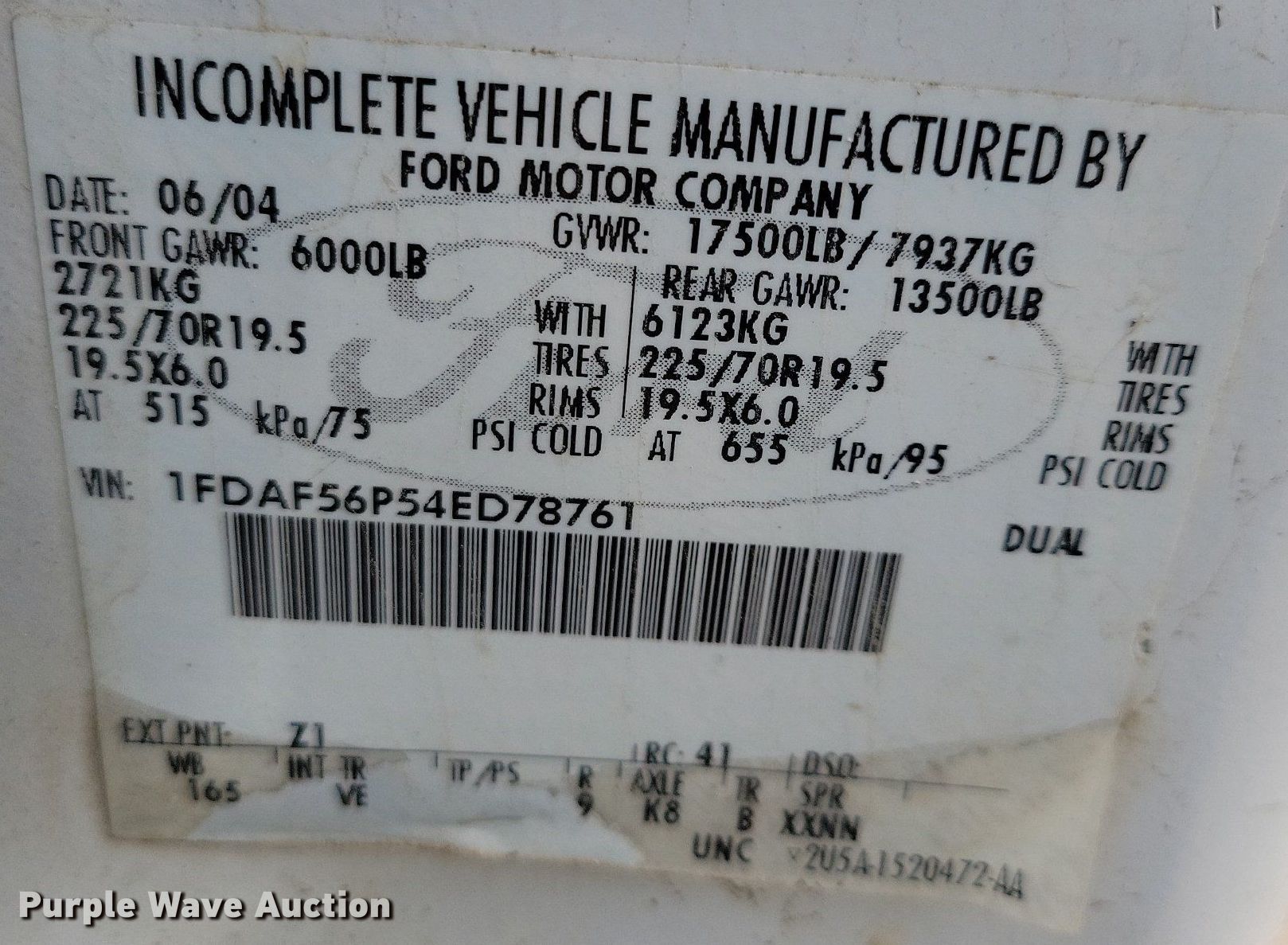 2004 Ford F550 Super Duty XL truck cab and chassis. Miles: 241,434 on odometer, VIN: 1FDAF56P54ED78761. Engine Displacement: 6.0L V8 OHV, Cylinders: 8, Fuel type: Diesel. Transmission Automatic. Chassis Axles: Single, Suspension: Spring, Brakes: Hydraulic, GVWR: 17,500 lbs FAWR: 6,000 lbs, RAWR: 13,500 lbs, Wheelbase: 165". Interior AC, Heat, Cruise control. Features Fuel tank: Single. Tires Size: 225/70R19.5. Iowa title. Title distribution may be delayed up to 14 days from verification of funds. Anchored Walls. 1962 Iowa 92. Winterset, IA 50273