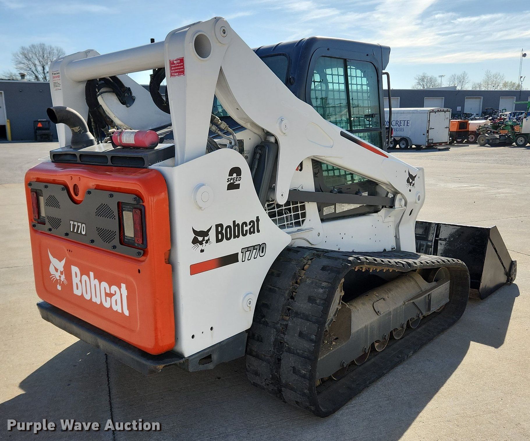 2018 Bobcat T770 tracked skid steer loader. Hours: 2,731 on meter, Serial: AT6317136. Engine Cylinders: 4, Fuel type: Diesel. Transmission Hydrostatic, Two speed travel. Operators station AC, Heat, Bucket control: Hand, Pattern changer, Electronic Monitoring System panel. Features Auxiliary hydraulics, Auxiliary electrical outlet, Quick coupler: Manual, Bucket Width: 80", Cutting edge: Bolt-on. Tracks Width: 17.5". Concrete Strategies, LLC. St. Louis, MO 63146