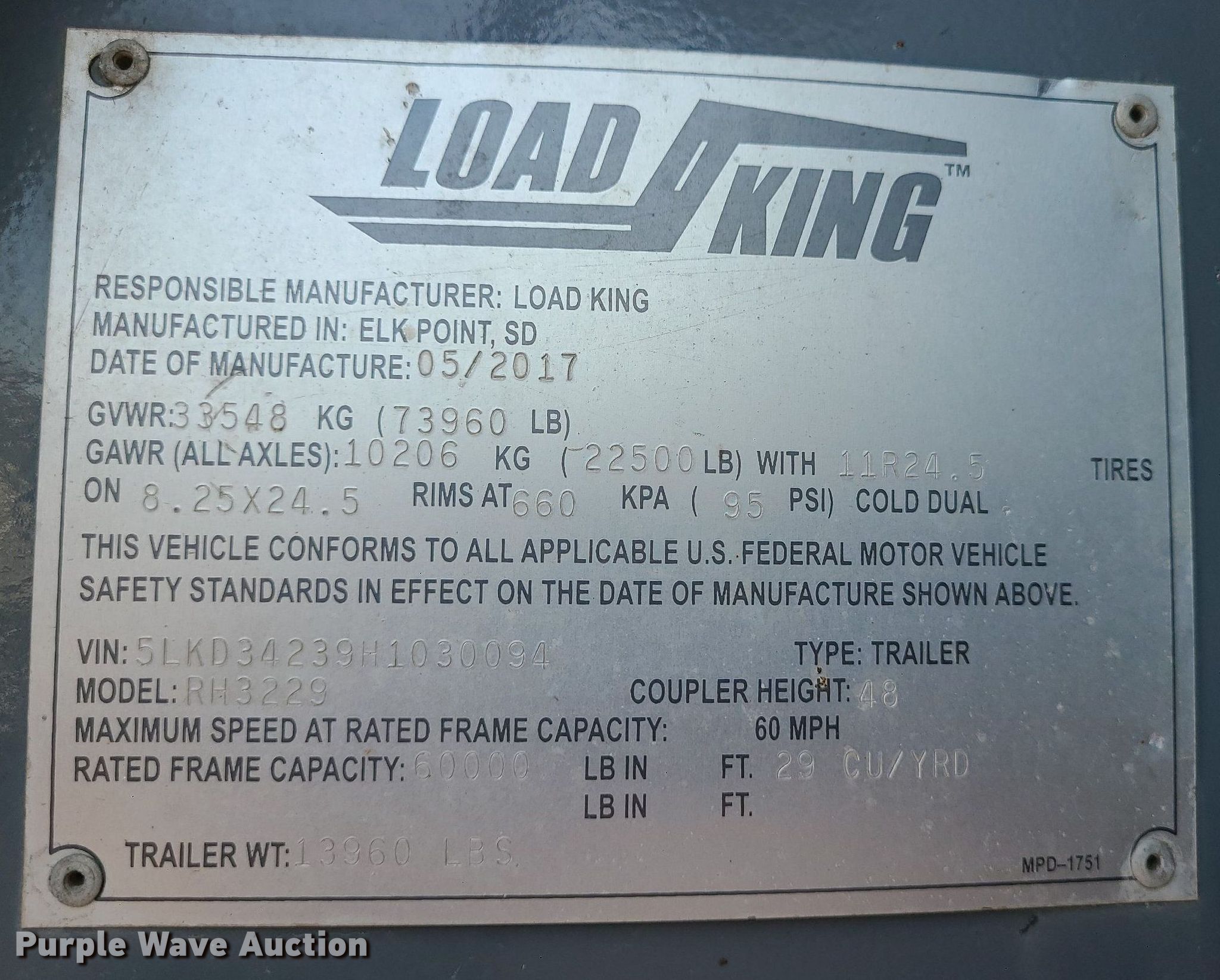 Purple Wave is selling a used End Dump Rock Trailer in Missouri. This item is a 2017 Load King RH3229 end dump trailer with the following: VIN: 5LKD34239H1030094