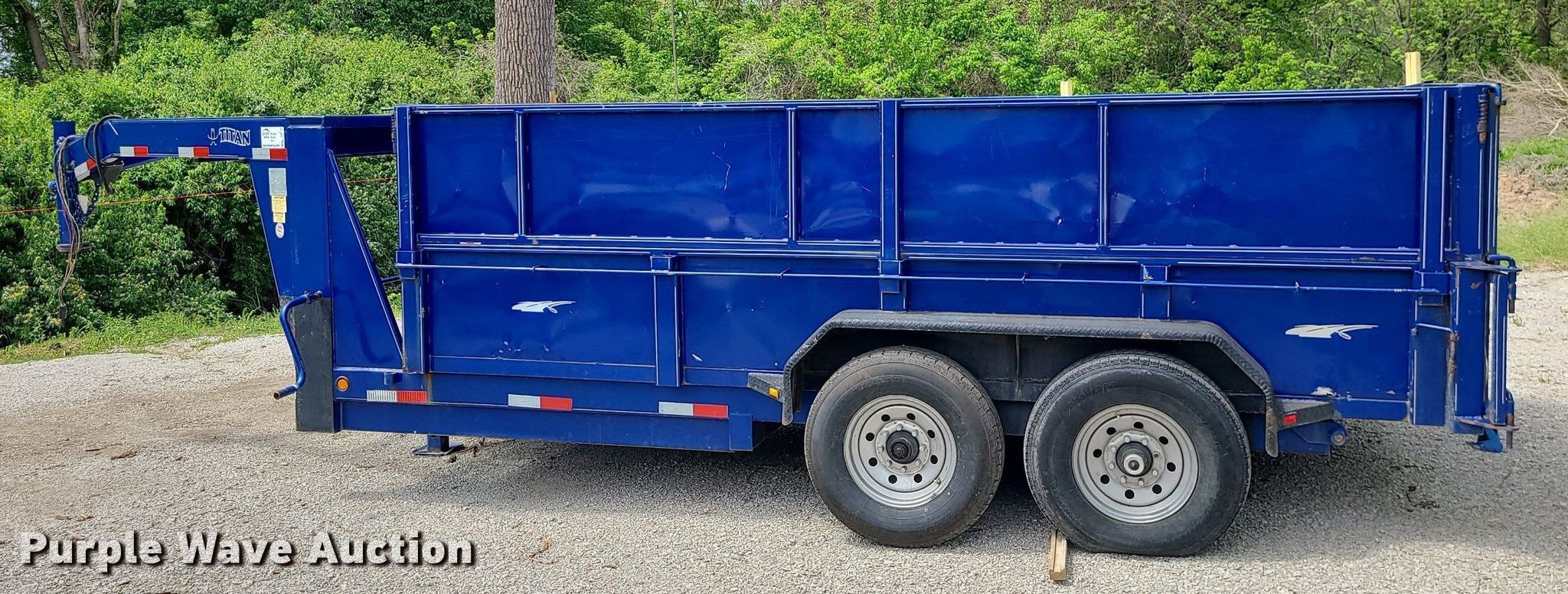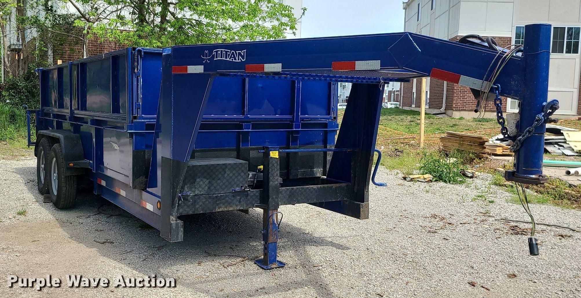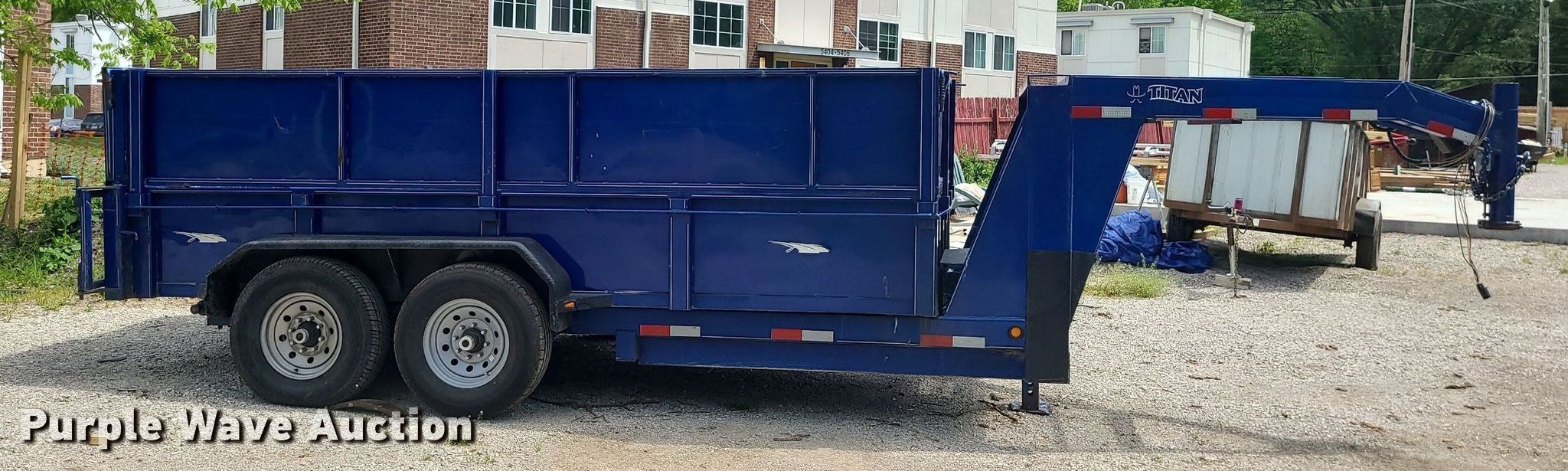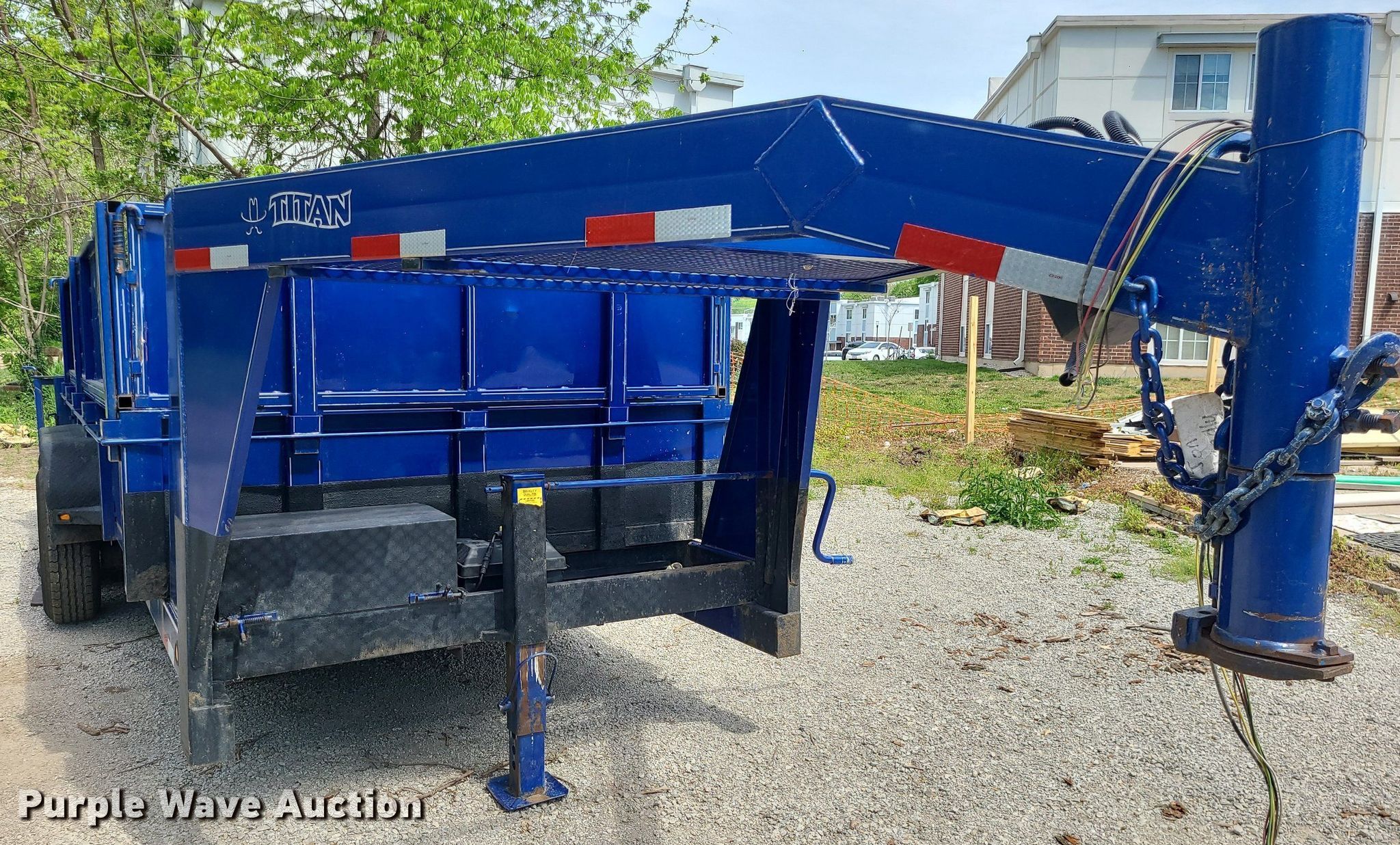 2003 Titan Trailer dump trailer. VIN: 4TGF1420X31025337. Dimensions Overall: 24' L x 102" W, Body: 14' L x 84" W, Side height: 45". Features Body type: Steel, Ram: Single, End gate: Manual. Chassis Hitch: Gooseneck, Landing gear: Single, Suspension: Spring, Brakes: Electric, Axles: Tandem, GVWR: 7,000 lbs. Tires Size: 235/80R16. Missouri title. Title distribution may be delayed up to 14 days from verification of funds. Mod Renovations KC. 5336 Northwest Waukomis Drive. Kansas City, MO 64151