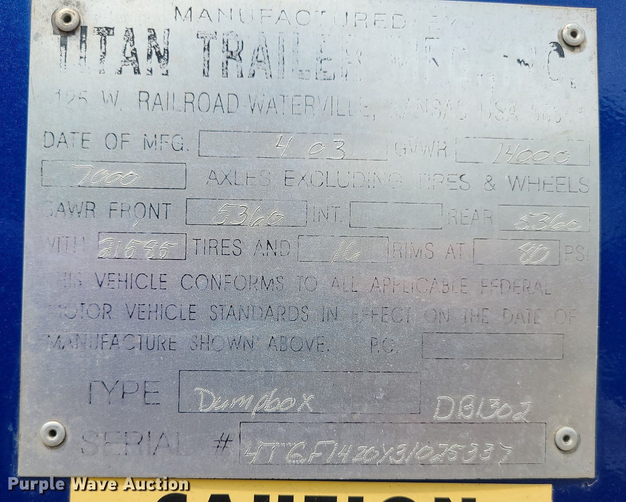 Purple Wave is selling a used Dump Trailer in Missouri. This item is a 2003 Titan Trailer dump trailer with the following: VIN: 4TGF1420X31025337