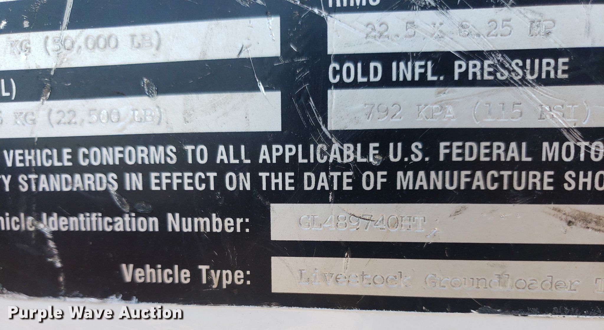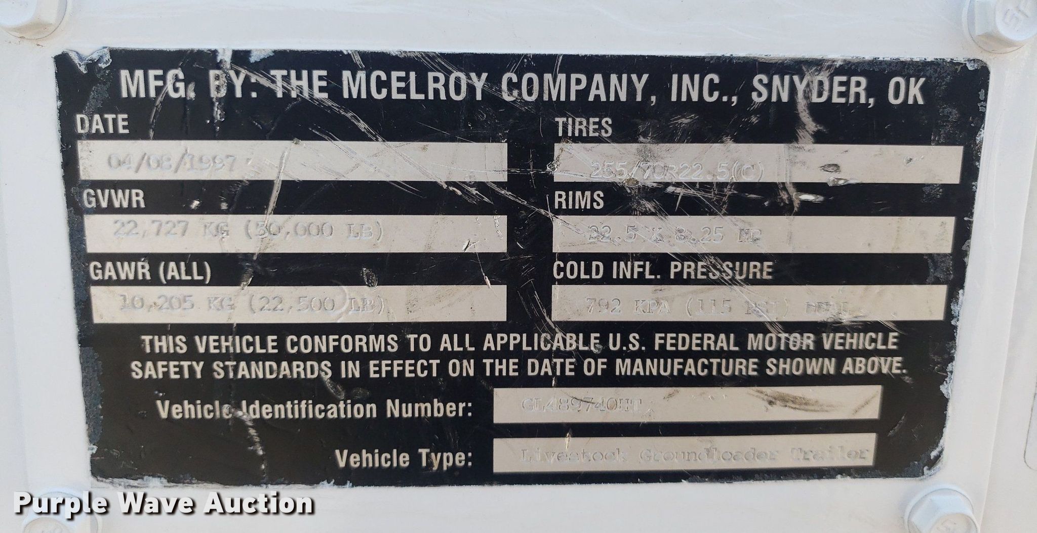 1997 McElroy livestock trailer. VIN: GL489740HT. Dimensions Overall: 40' L x 102" W. Features Center gates: 2. Chassis Landing gear: Dual, Suspension: Spring, Brakes: Air, GVWR: 50,000 lbs, GAWR: 22,500 lbs. Tires Steel wheels, Size: 295/75R22.5. Kansas title. Title distribution may be delayed up to 14 days from verification of funds. 7945 N Broadway. Valley Center, KS 67147