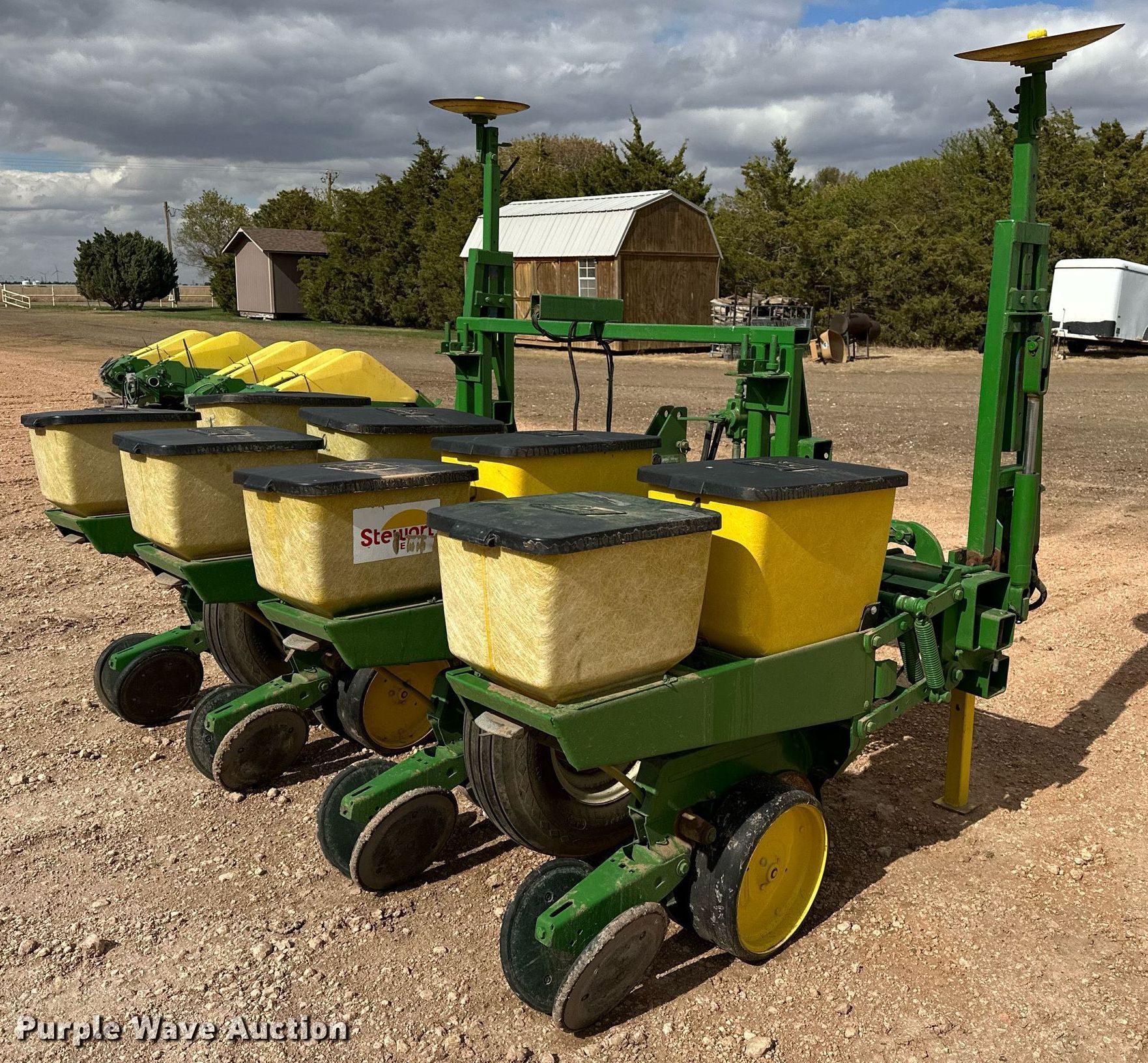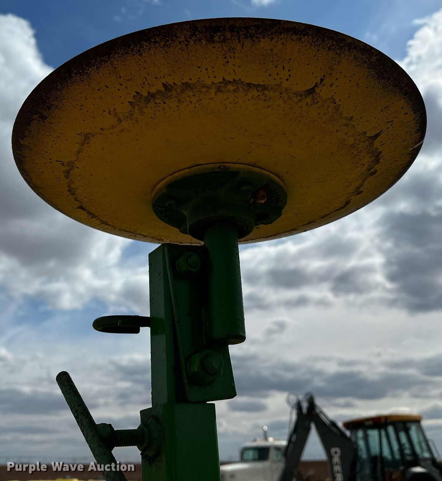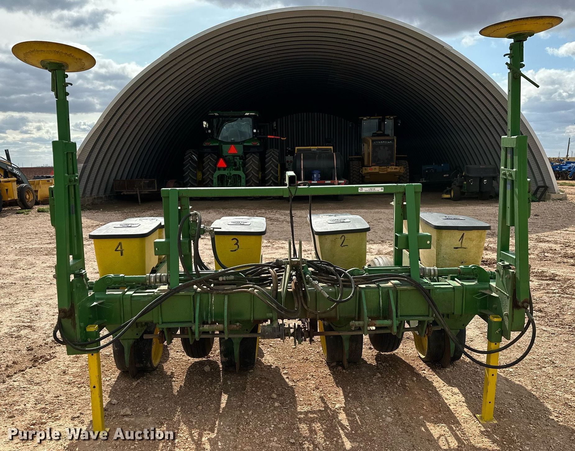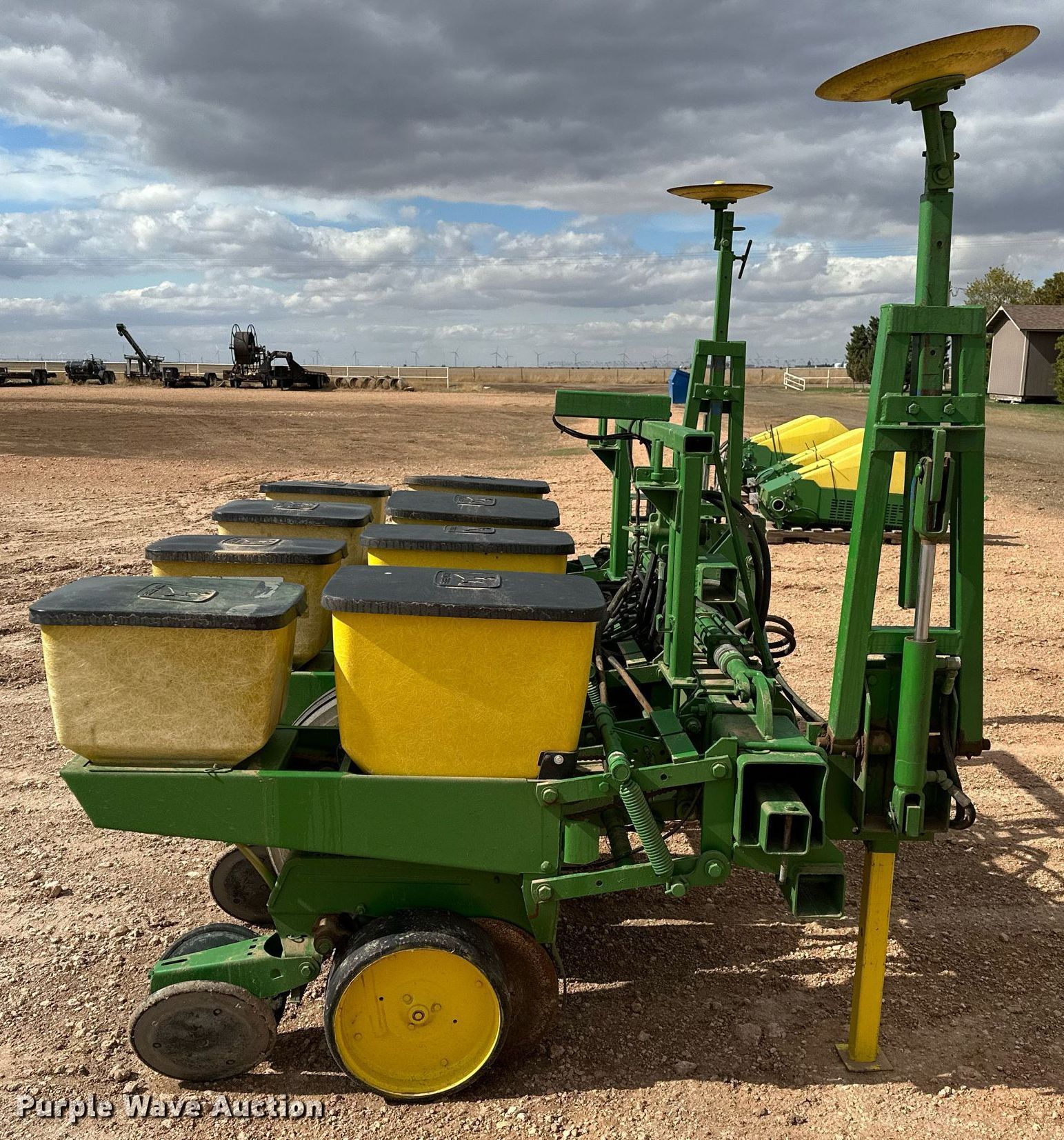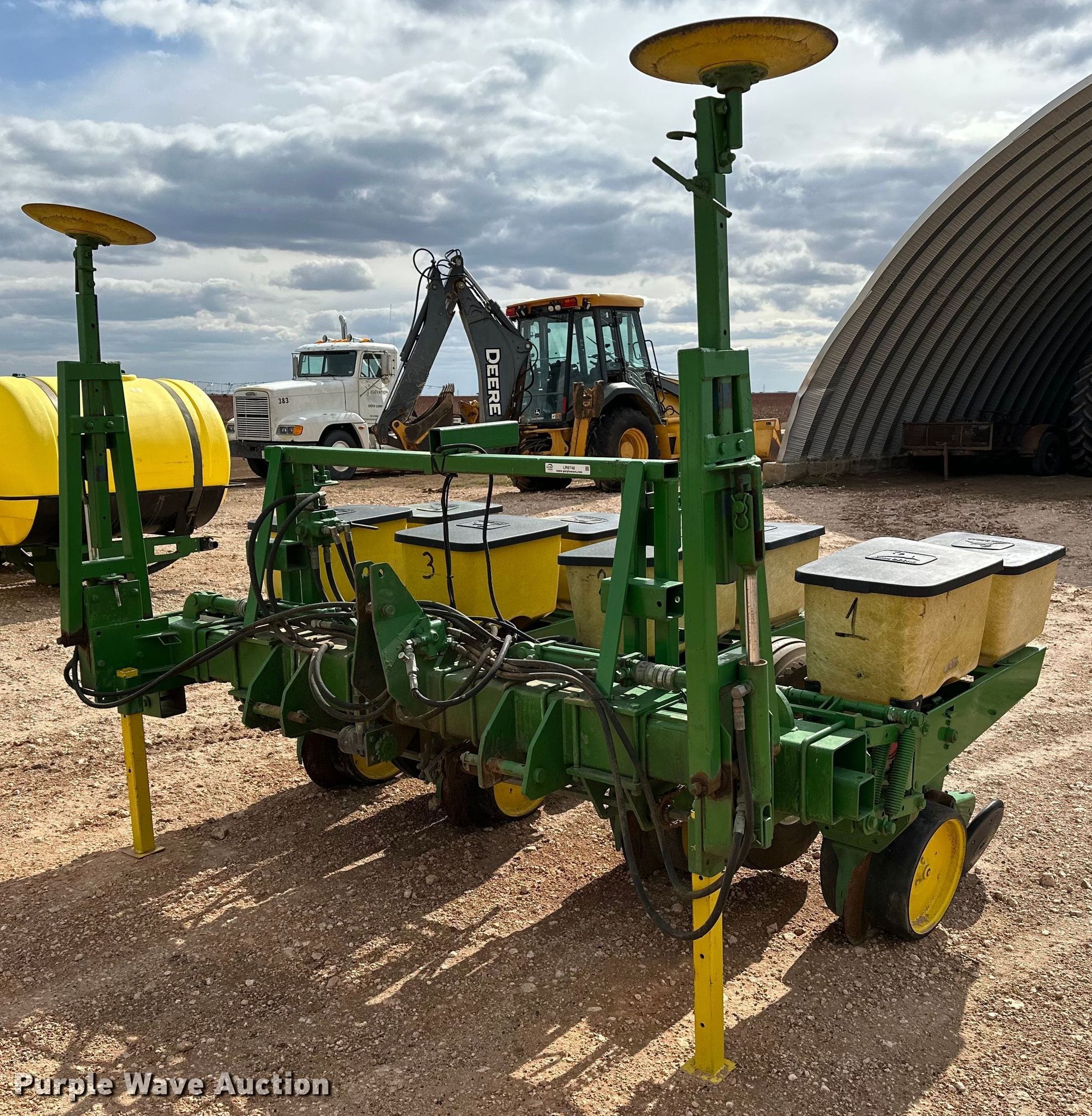 John Deere no-till planter. Width: 8', Row units: 4, Row spacing: 30", Serial: AJ4RPP88025. Features Frame Hitch: Three point, Marker arm, Seed delivery Individual seed hoppers, Row units Meter drive: Ground, Down pressure: Spring, Disk openers: Single , Gauge wheels: Double, Closing system: Double Type: Rubber, Fertilizer/ insecticide Fertilizer, Application method: Coulter, Insecticide boxes. Tires Transport tire size: 7.6-15 Quantity: 2. Notes Hole in seed hopper 2. 40720 County Road 28. Wildorado, TX 79098