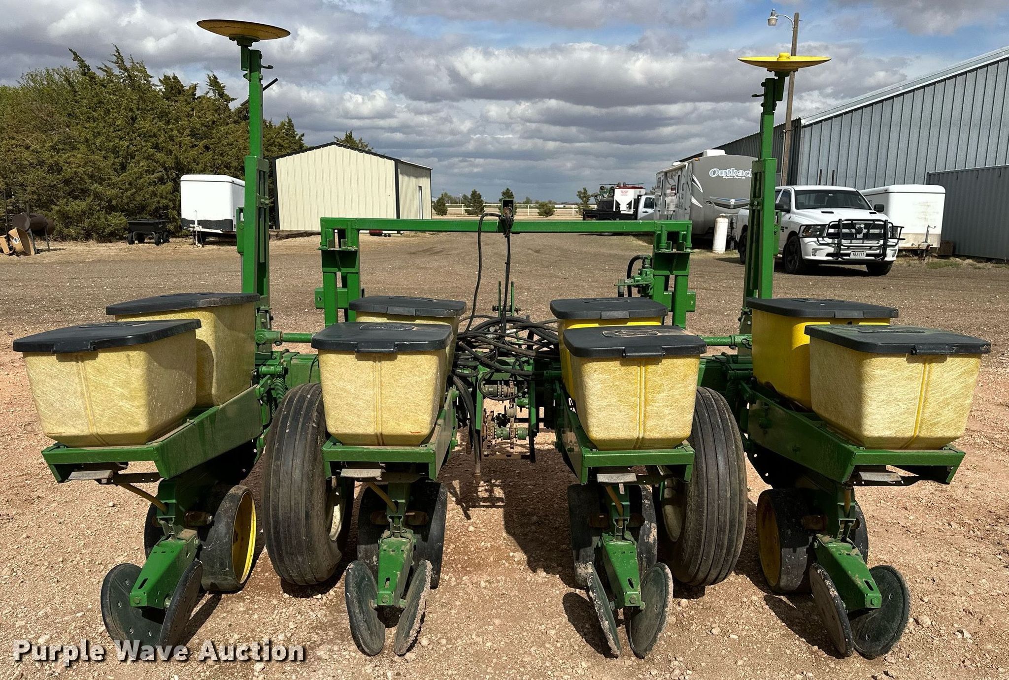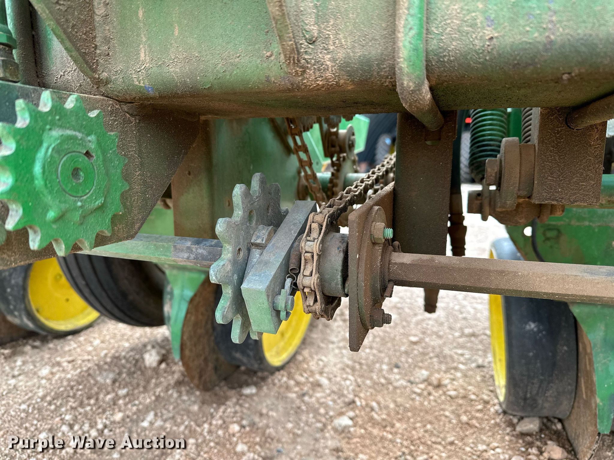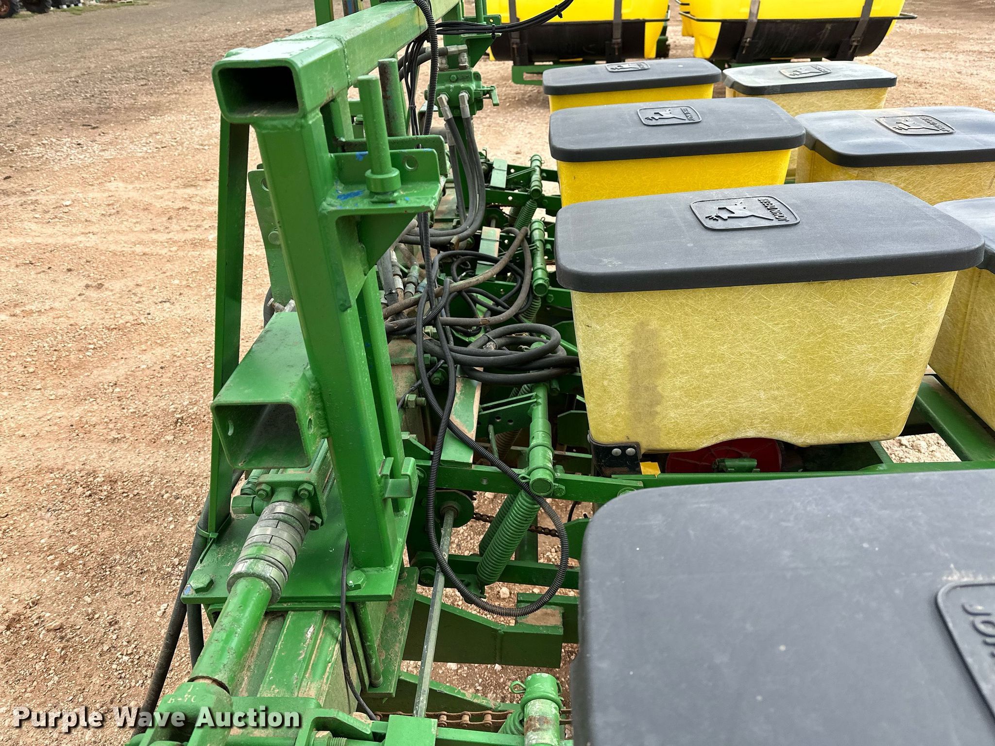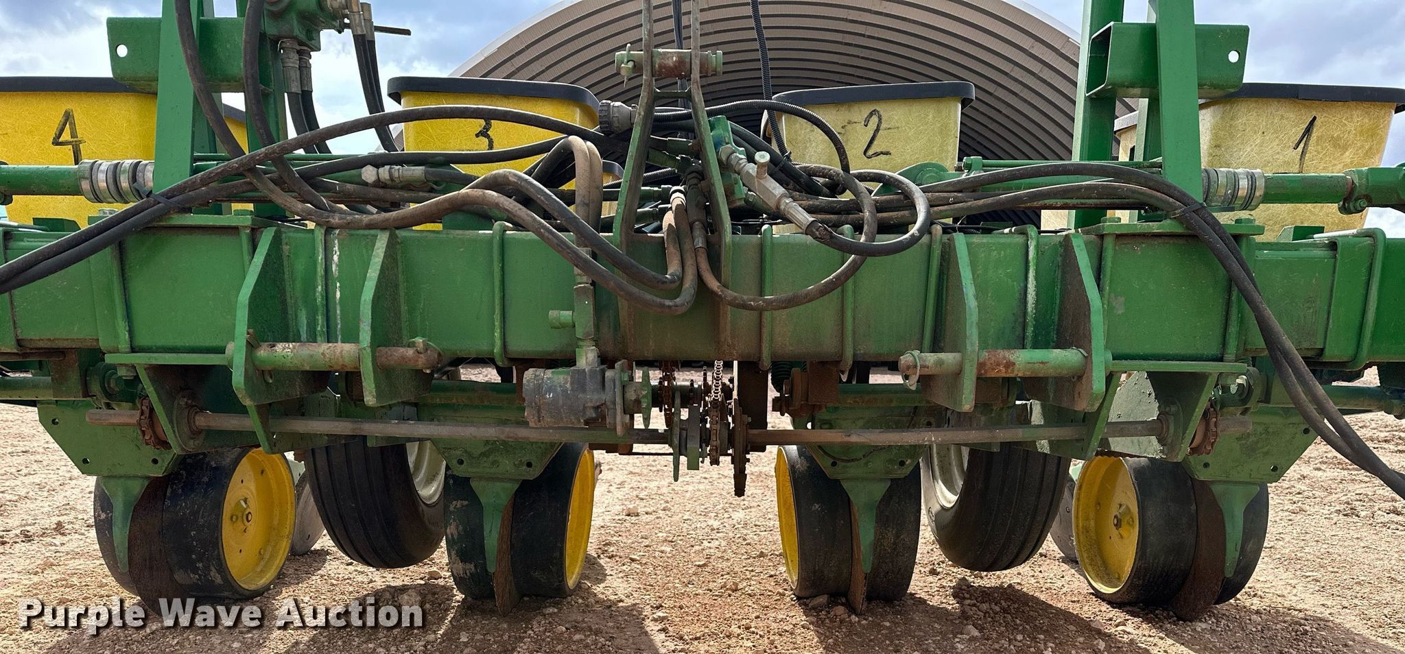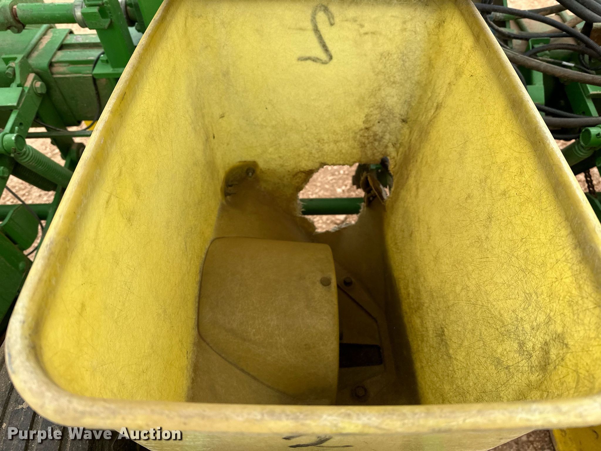 John Deere no-till planter. Width: 8', Row units: 4, Row spacing: 30", Serial: AJ4RPP88025. Features Frame Hitch: Three point, Marker arm, Seed delivery Individual seed hoppers, Row units Meter drive: Ground, Down pressure: Spring, Disk openers: Single , Gauge wheels: Double, Closing system: Double Type: Rubber, Fertilizer/ insecticide Fertilizer, Application method: Coulter, Insecticide boxes. Tires Transport tire size: 7.6-15 Quantity: 2. Notes Hole in seed hopper 2. 40720 County Road 28. Wildorado, TX 79098