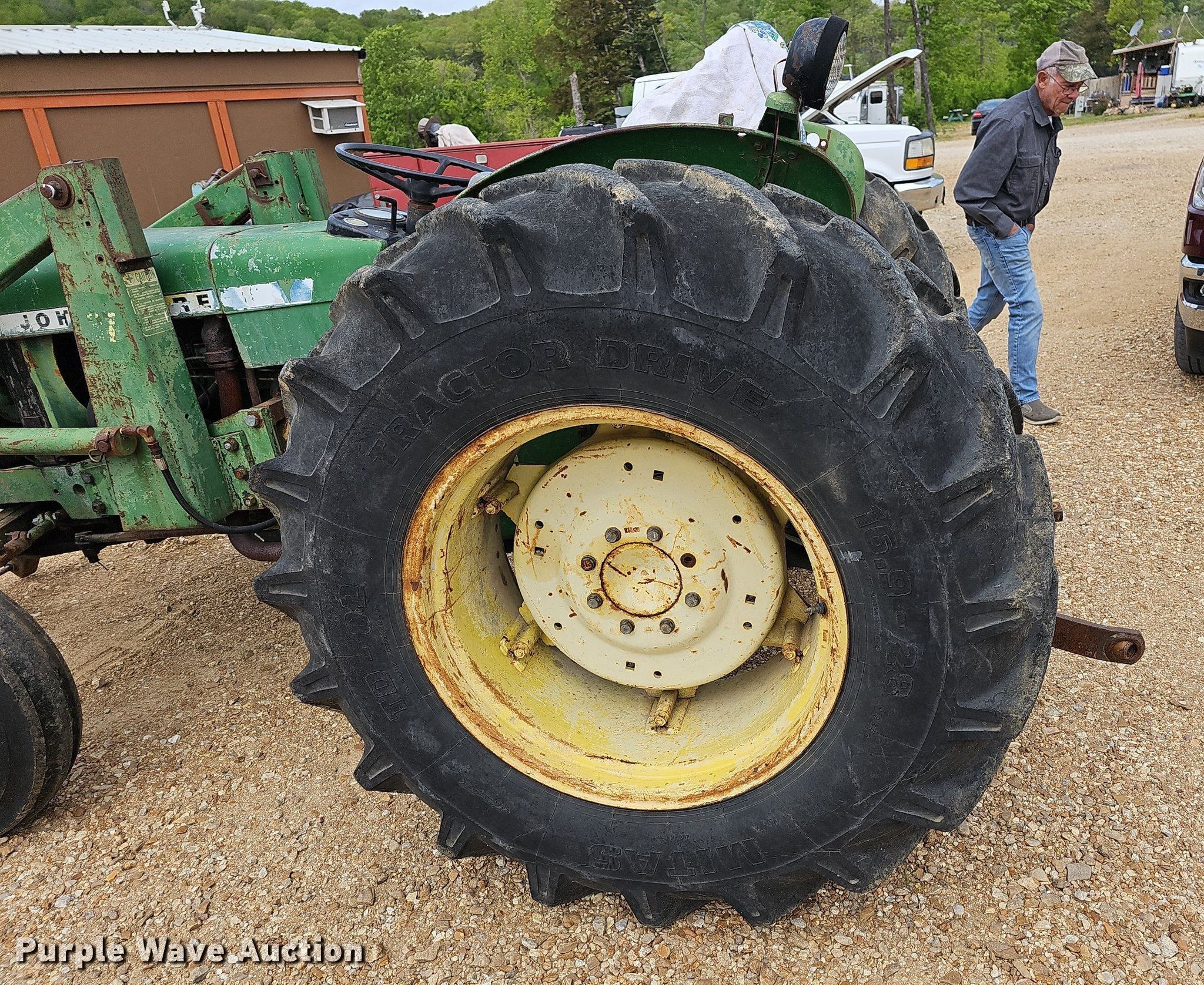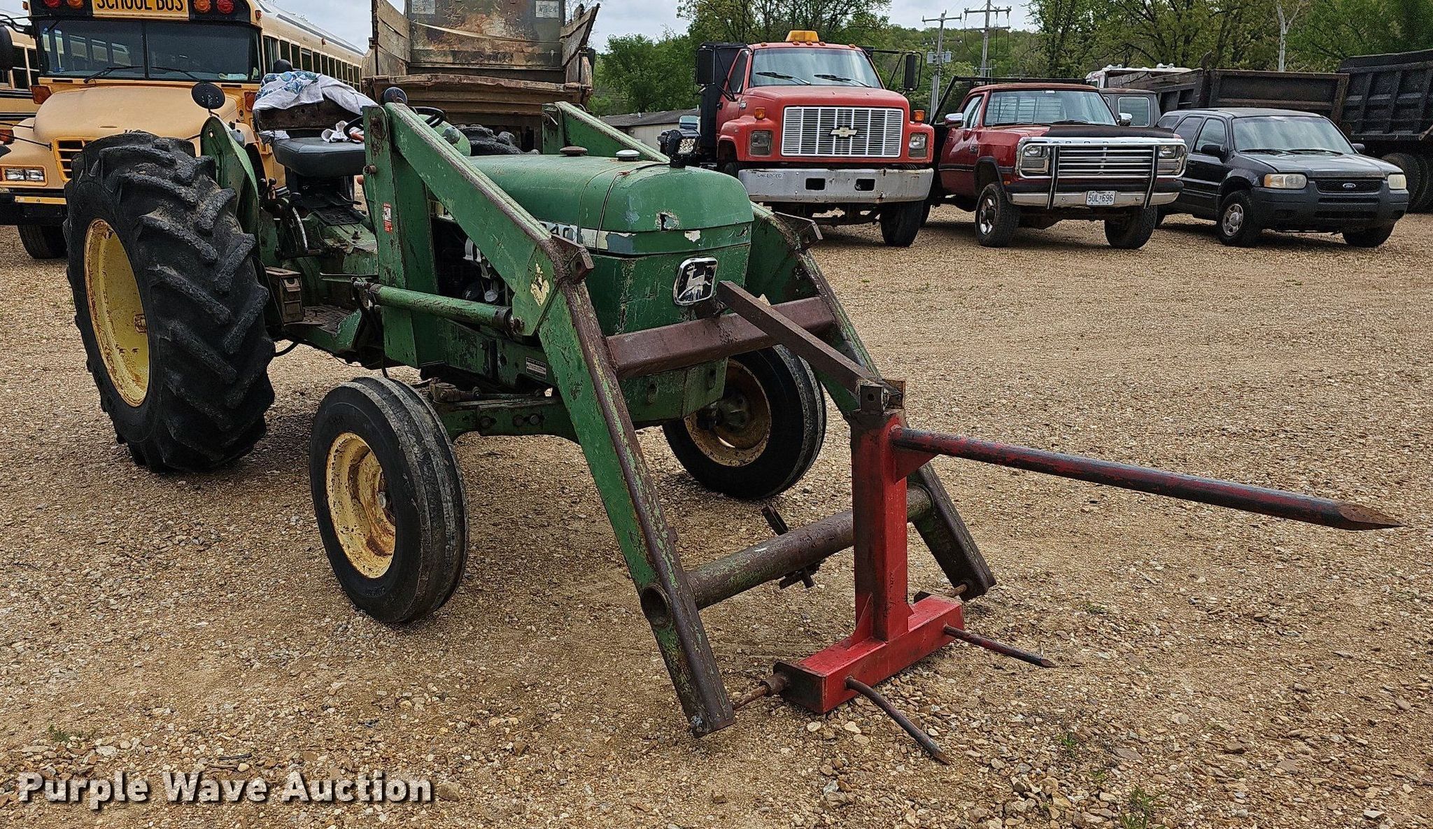 1976 John Deere 2240 tractor. Hours: 4,419 on meter, Serial: 209204. Engine Displacement: 179 C.I.D., Cylinders: 3, Fuel type: Diesel. Transmission Manual, 8F - 4R. Features PTO: 540, Three point, Hydraulic remote sets Rear: 1, Loader John Deere , Bale spear, Controls: Two-lever. Tires Front: 6.50-16, Rear: 16.9-28. 22474 Rustful Ln. Waynesville, MO 65583