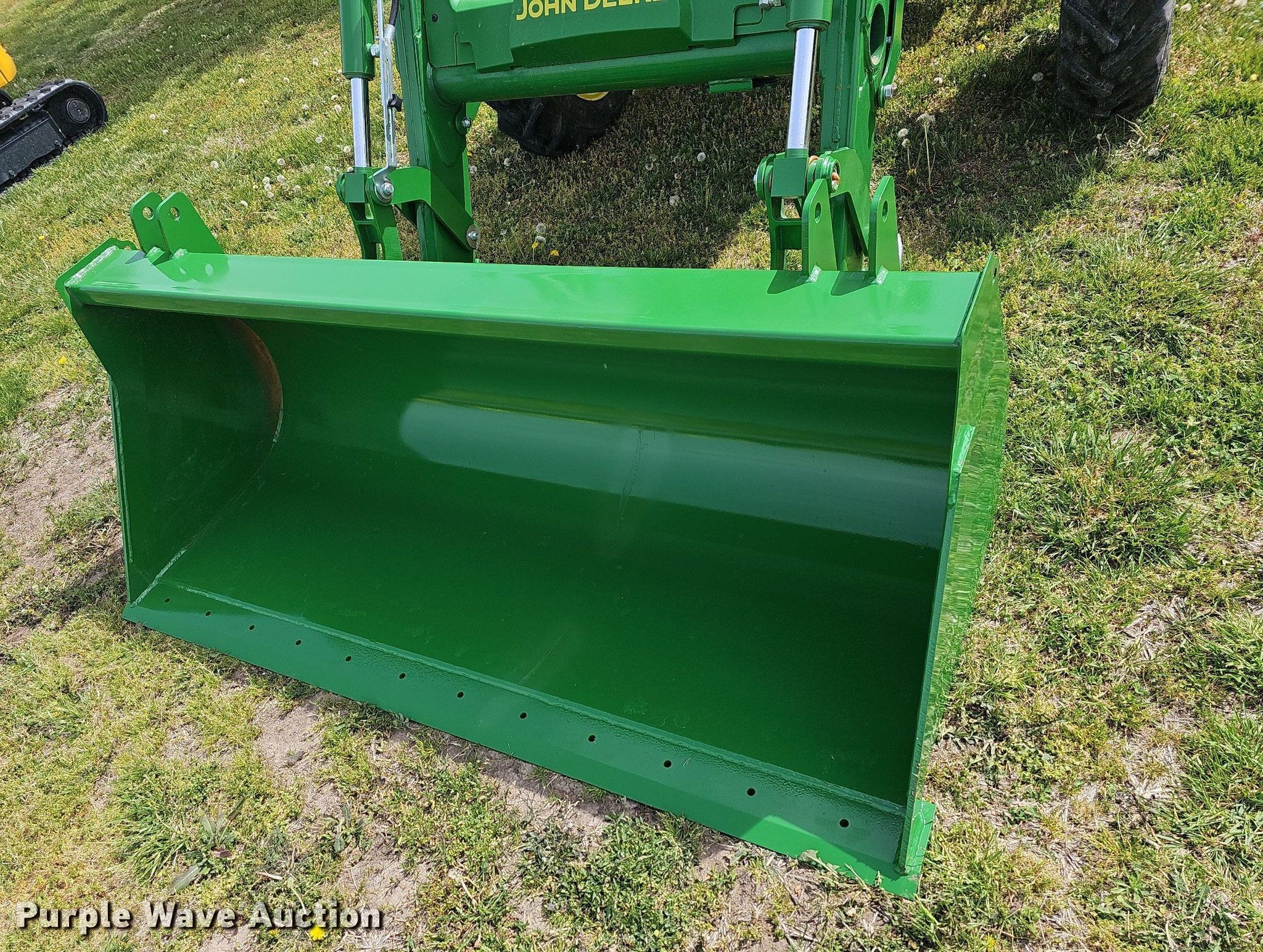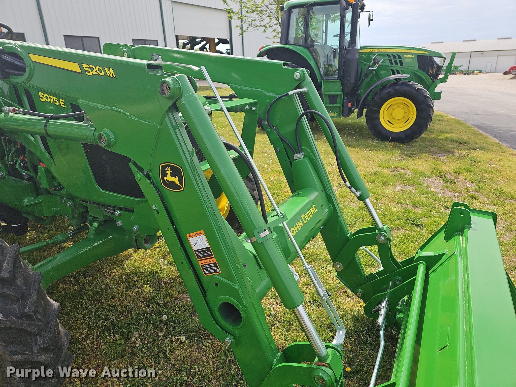 2021 John Deere 5075E MFWD tractor. Hours: 4 on meter, Serial: 1PY5075ELMN120584. Engine John Deere, Displacement: 2.9L, Cylinders: 4, Fuel type: Diesel. Transmission Synchro, 12F - 12R, Left-hand reverser, Differential lock. Features PTO: 540, Three point Top link, Seven pin outlet, Hydraulic remote sets Rear: 1, Loader John Deere 520M, Controls: Joystick, Bucket Width: 72".. Tires Front: 9.5-24, Rear: 16.9-28. Notes Manufacturer warranty valid through November 2023 or 2,000 hours on meter. Heritage Tractor. 404 South Prosperity Avenue. Joplin, MO 64801
