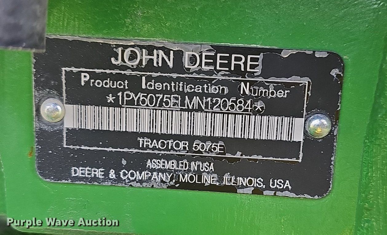 Purple Wave is selling a used Tractor in Missouri. This item is a 2021 John Deere 5075E MFWD tractor with the following: Hours: 4 on meter, Serial: 1PY5075ELMN120584
