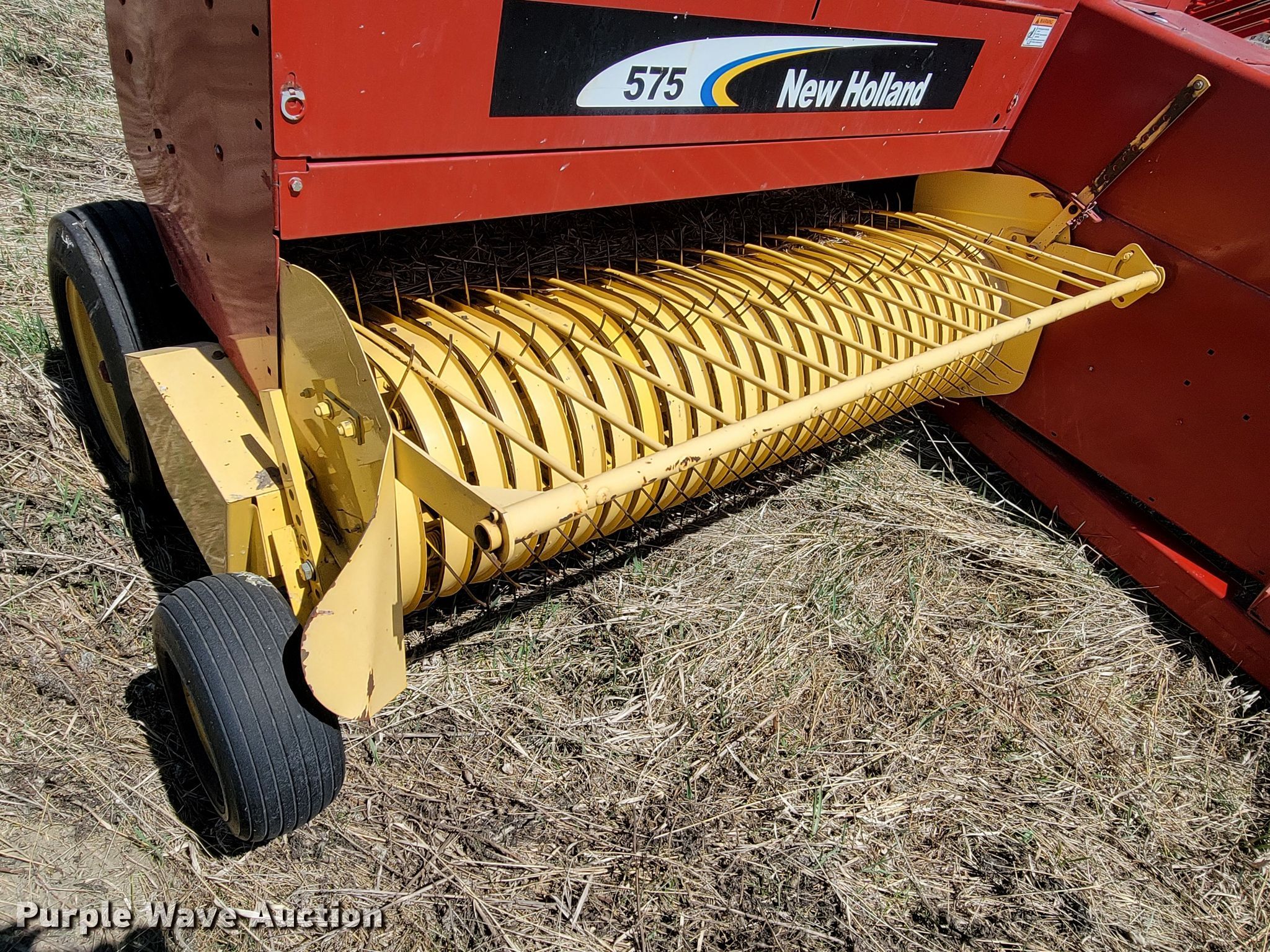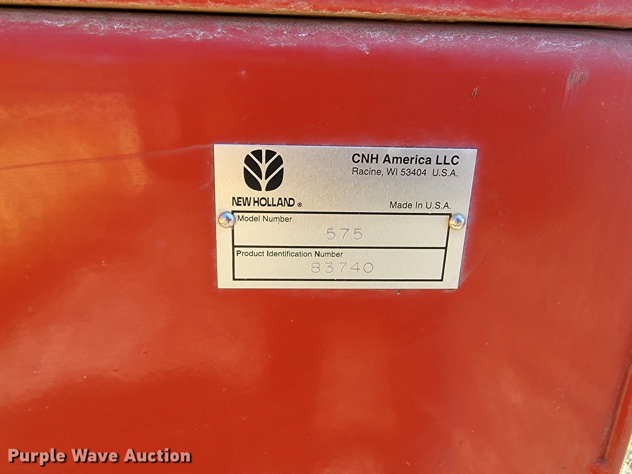 2007 New Holland 575 small square baler. Serial: 83740. Features PTO: 540, Pickup width: 75", Hydraulic pickup lift, Small square bale size: 14"x18", Knotters Quantity: 2, Twine tie, Bale chute. Tires Size: 27x9.50-15. Aberdeen, SD 57401