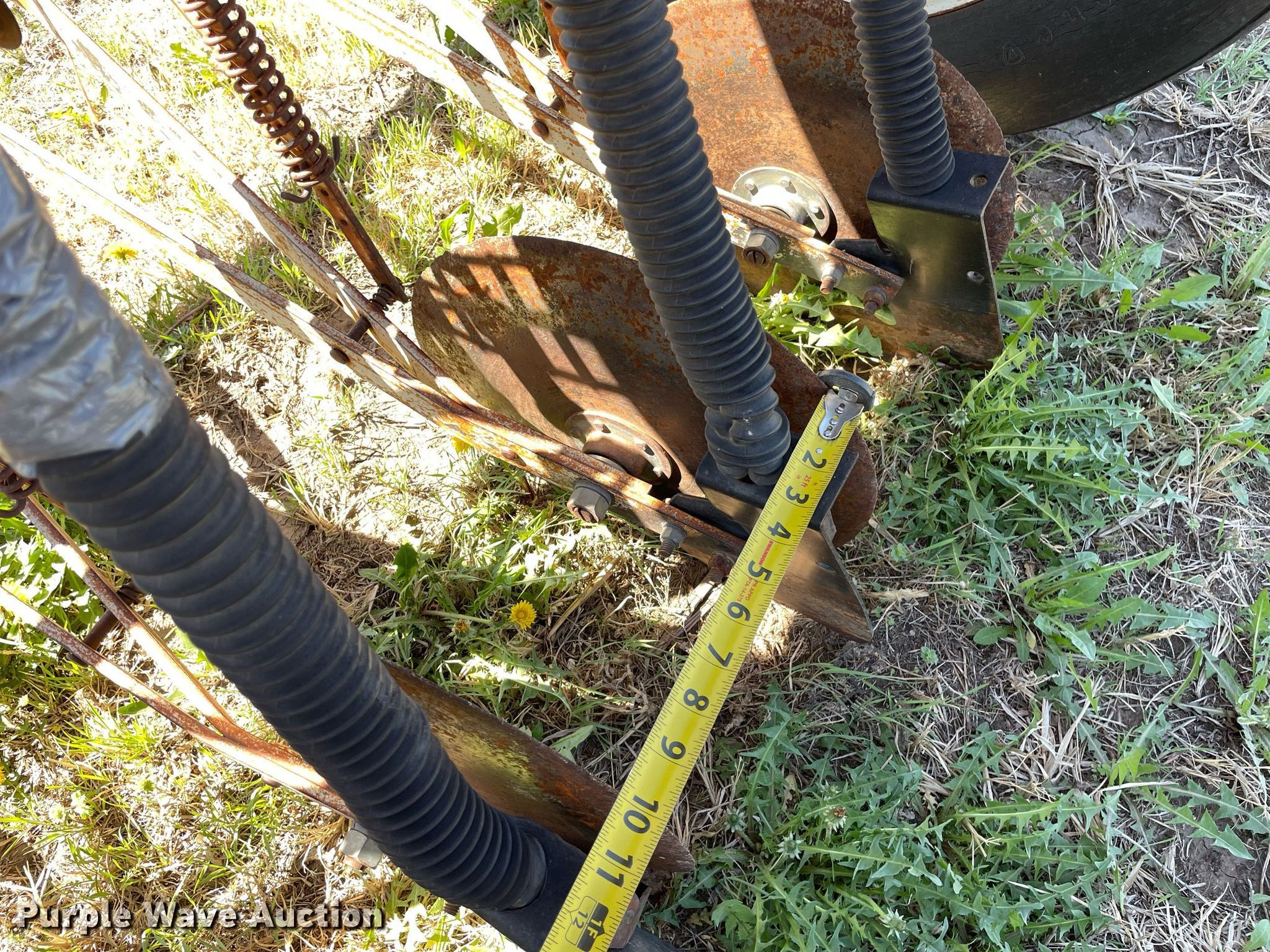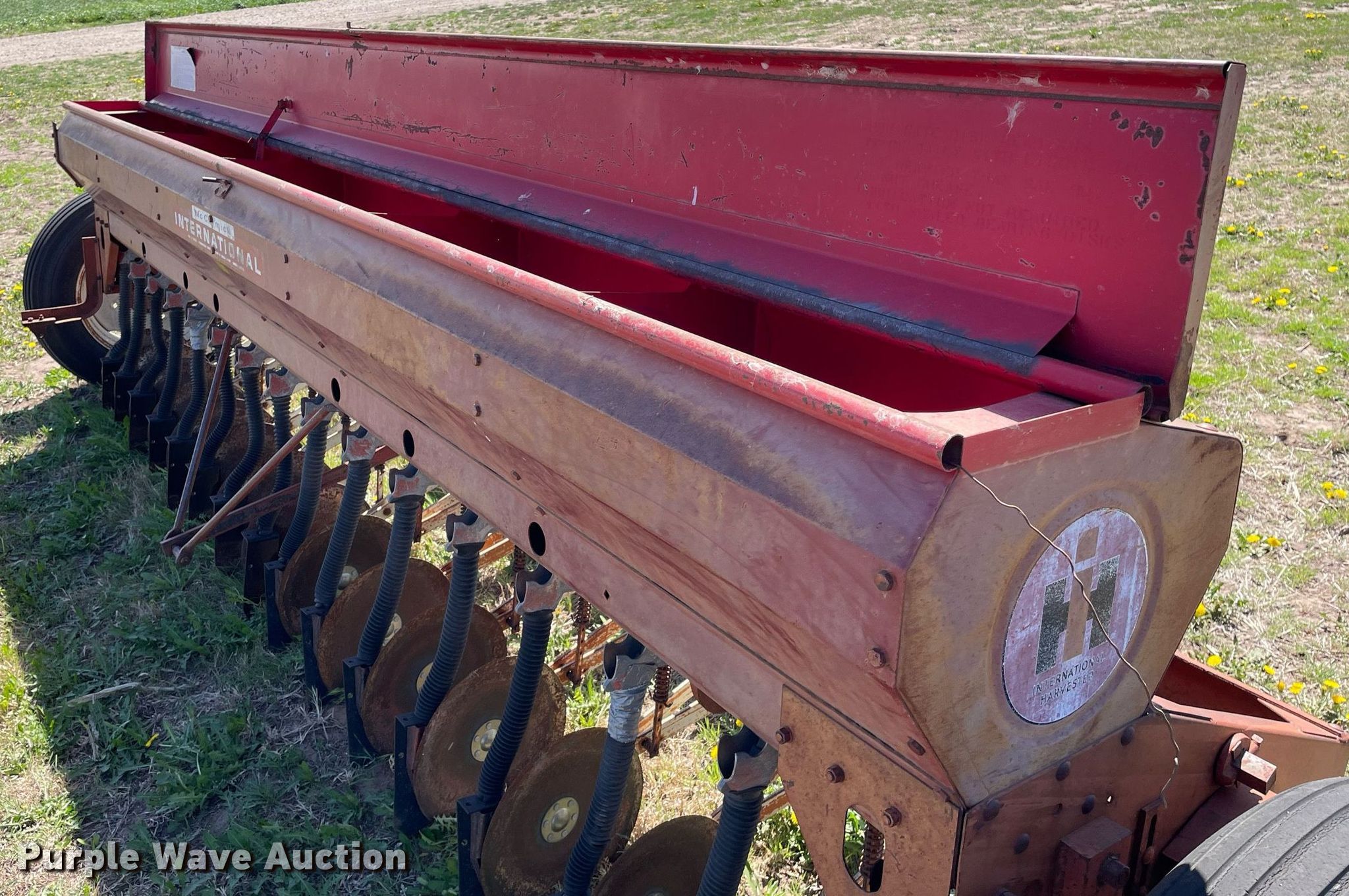 International Harvester grain drill. Width: 13', Row units: 16, Row spacing: 10". Features Seed delivery Bulk fill system, Row units Meter drive: Ground, Down pressure: Spring, Disk openers: Single , Closing system: Single Type: Rubber.. 1850 Avenue Q. Sterling, KS 67579