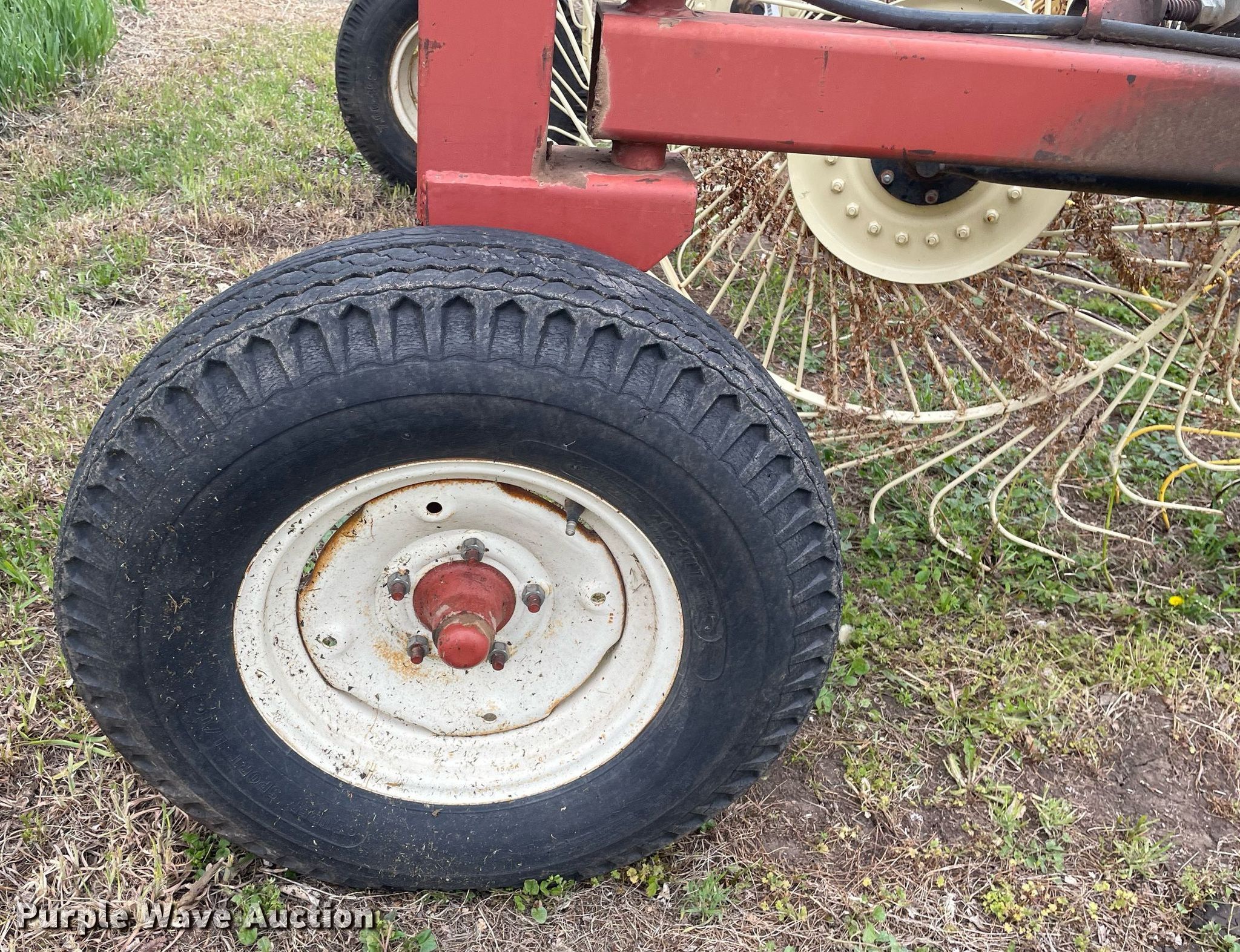 Hesston 3983 hay rake. Serial: 00201. Features Width: 30', Wheels: 12 Diameter: 54", Hydraulic lift, Hydraulic fold, Ground driven. Tires Front: 6.70-15, Rear: 7.00-15. Lindsborg, KS 67456