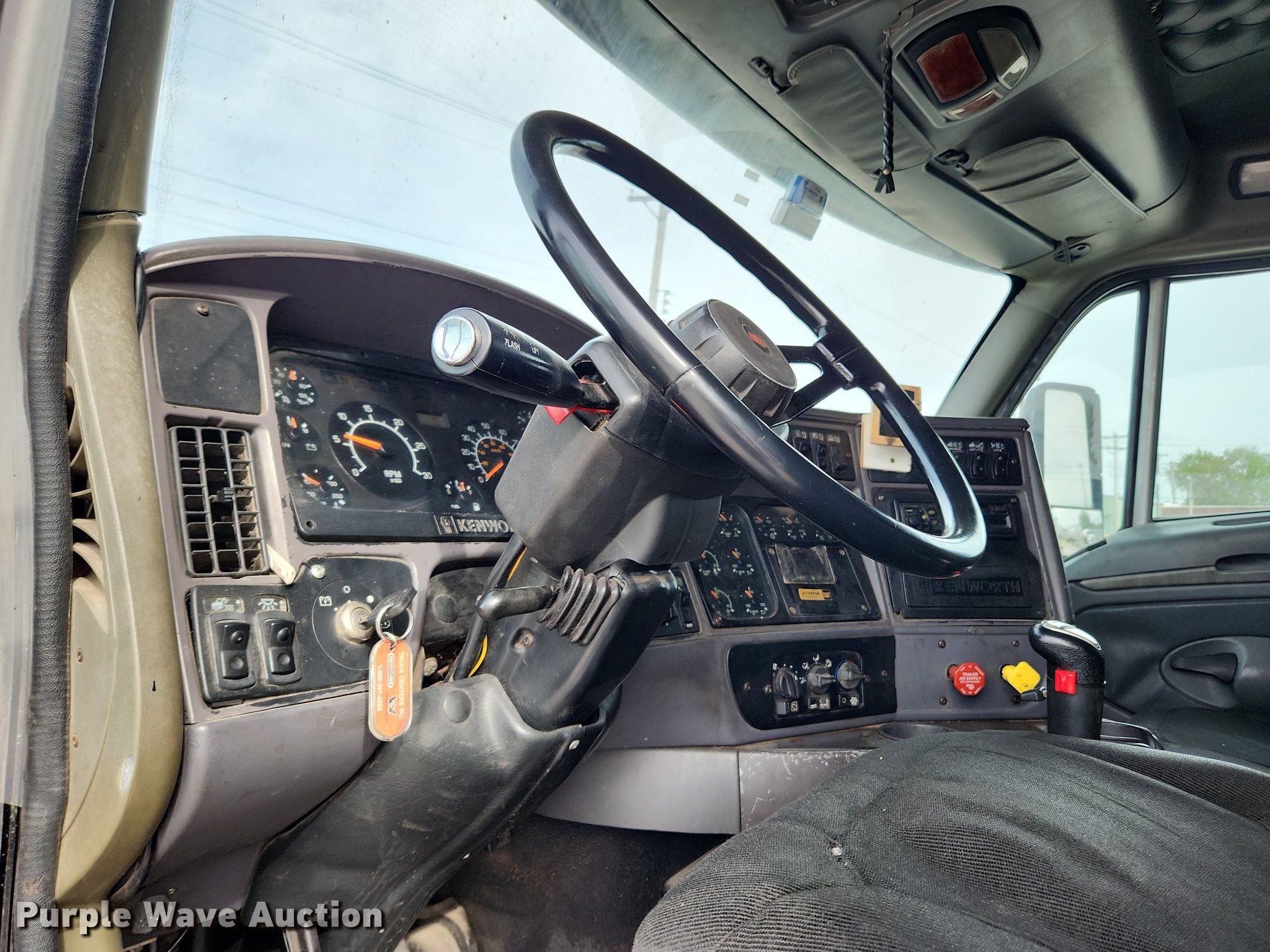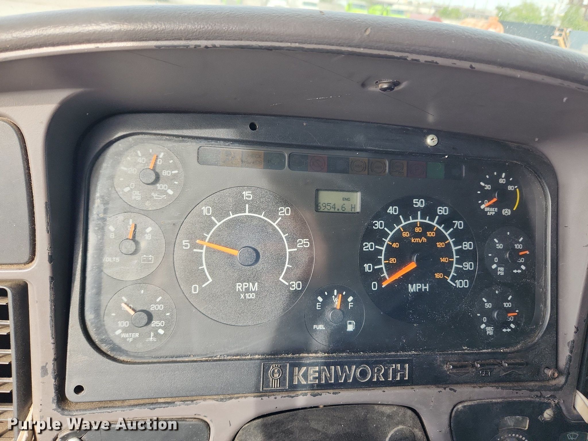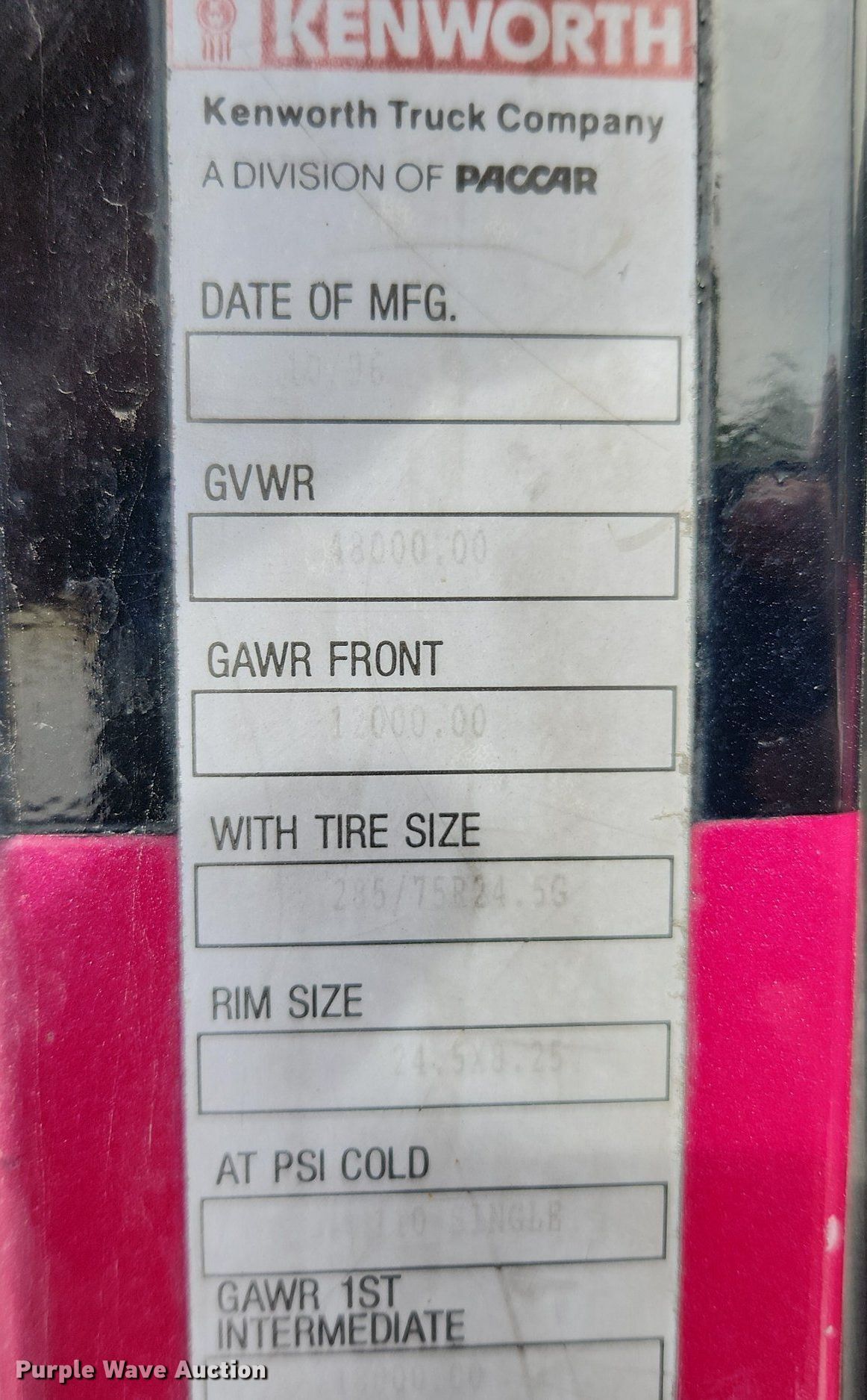 1997 Kenworth T2000 tank truck. Miles: 6,055 on odometer, Hours: 6,954 on meter, VIN: 1XKTDB9X3VJ738586. Engine Caterpillar 3406, Displacement: 14.6L, Cylinders: 6, Fuel type: Diesel. Transmission Eaton Fuller RTLO16713A, Manual, Speed: 13. Chassis Axles: Triple, Pusher axle, Differential lock: Inter-axle, Suspension: Air, Brakes: Air, PTO, GVWR: 48,000 lbs. Interior AC, Heat, Heated mirrors, Power windows, Power locks, Cruise control. Features Bed / tank Capacity: 4,500 gallons, 19' 6" L x 94" W, Side discharge, Rear drain: 3". Tires Front: 12R22.5, Rear: 285/75R24.5, Lift axle: 255/70R22.5. Notes Driver side power control module issues. Illinois title. Title distribution may be delayed up to 14 days from verification of funds. GFL Environmental Inc. St. Louis, MO 63146