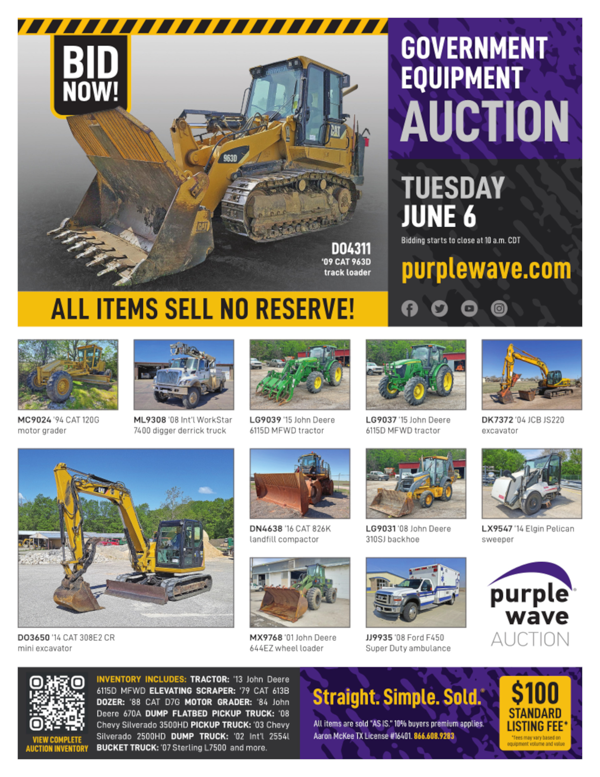 This auction is conducted by Purple Wave, Inc., whose home office is 825 Levee Drive, Manhattan, Kansas. Aaron McKee, Texas auctioneer license # 16401, operates Purple Wave, Inc. Complaints against us may be directed to the Texas Department of Licensing and Regulation, P.O. Box 12157, Austin, Texas 78711, (512) 463-6599. For additional required information, see the attached document.