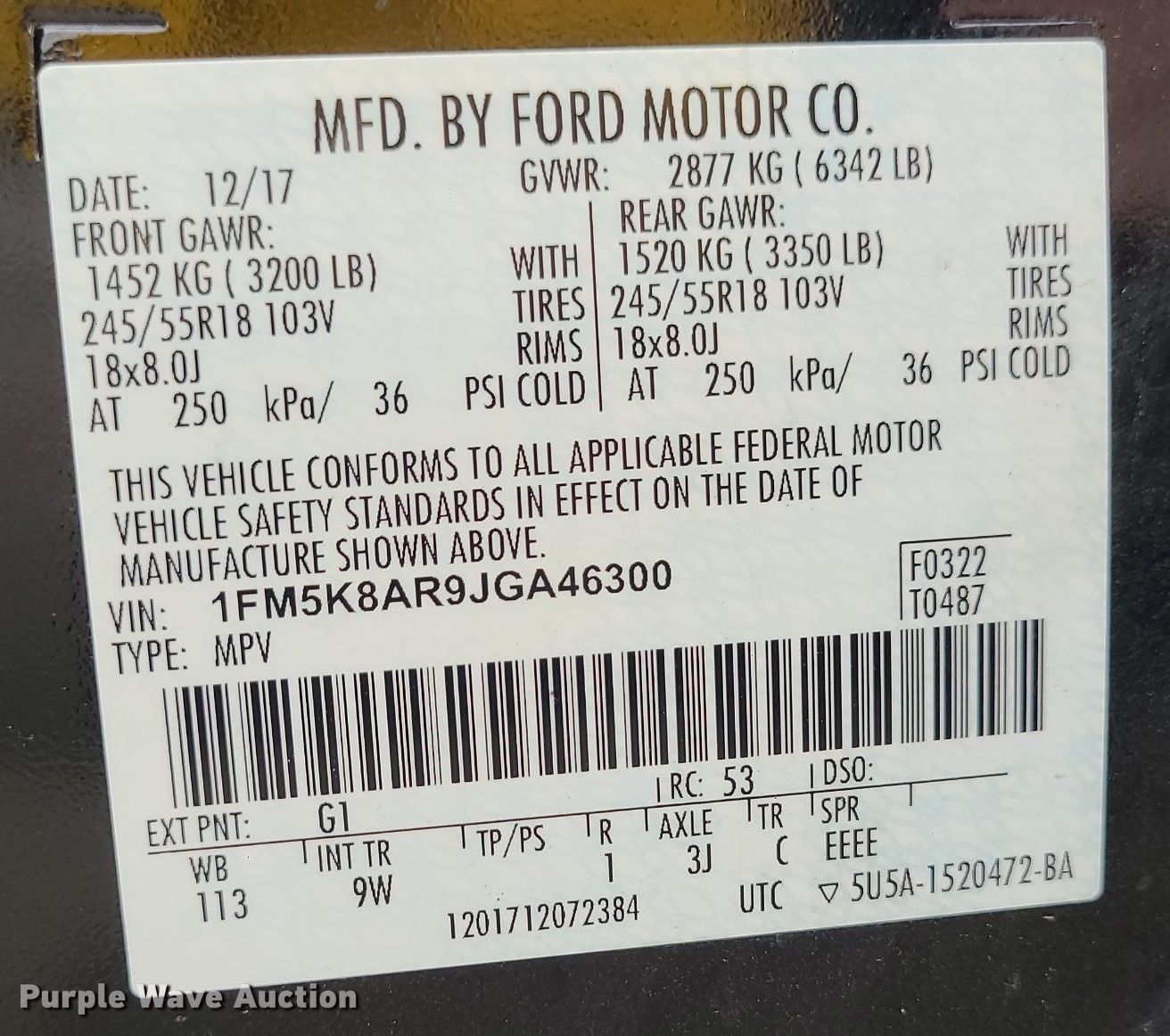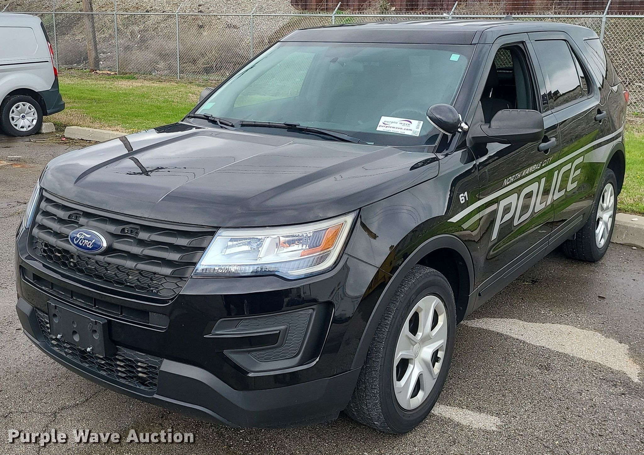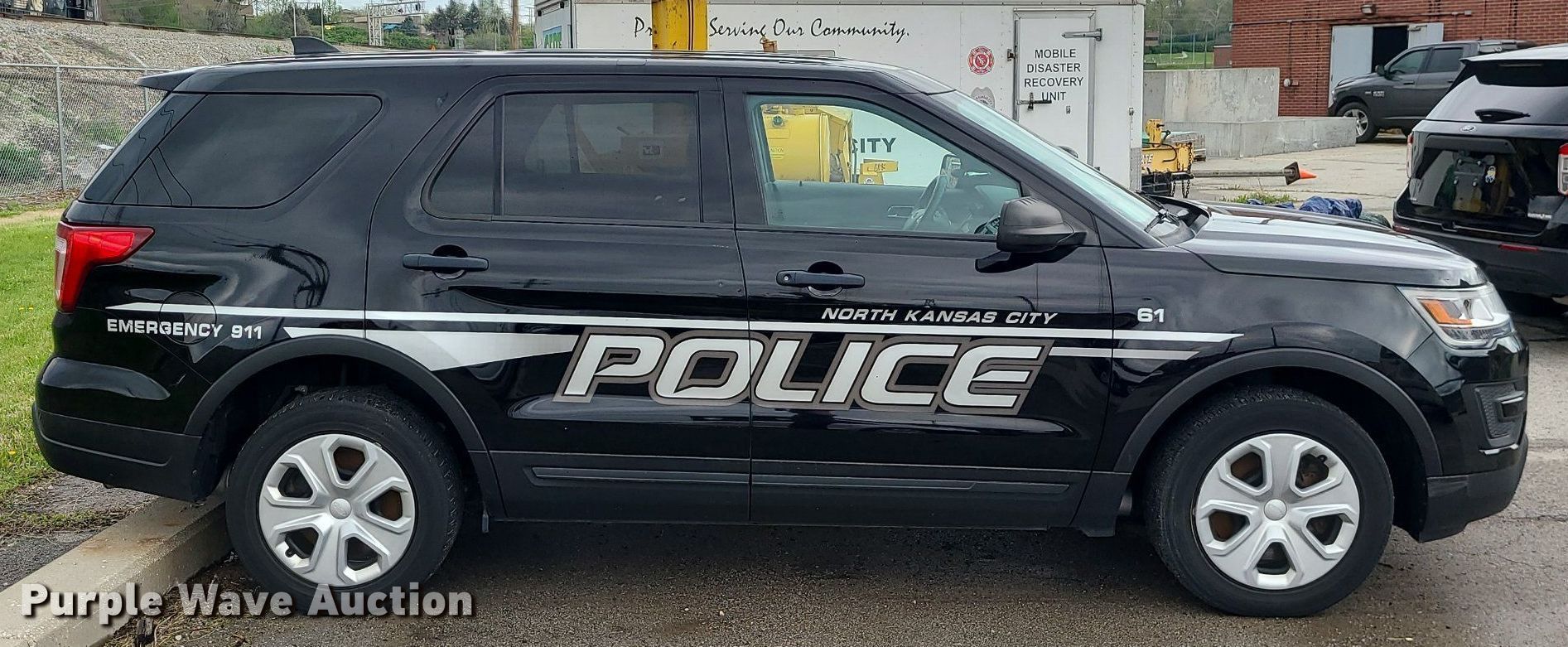2018 Ford Explorer Police Interceptor SUV. Miles: 65,686 on odometer, VIN: 1FM5K8AR9JGA46300. Engine Displacement: 3.7L V6 DOHC, Cylinders: 6, Fuel type: Gas. Transmission Automatic, All wheel drive. Interior AC, Heat, Power windows, Power locks, Cruise control. Tires Size: 245/55R18. Notes Dash warning indicator: Check engine, ABS, Traction control, Airbag. Missouri title. City of North Kansas City. 2010 Howell St. North Kansas City, MO 64116