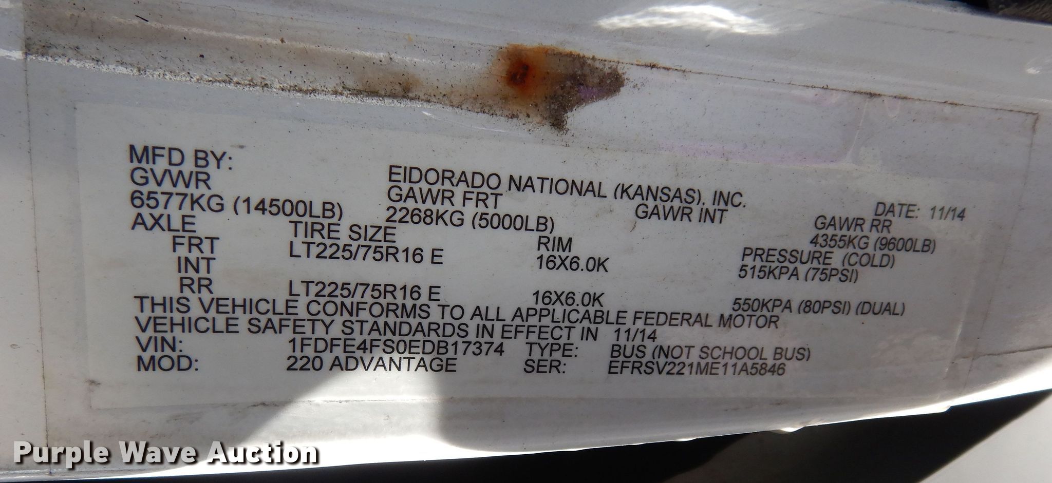 2015 Ford E450 Super Duty shuttle bus. Miles: 130,610 on odometer, VIN: 1FDFE4FS0EDB17374. Engine Displacement: 6.8L V10 SOHC, Cylinders: 10, Fuel type: Gas. Transmission Automatic. Chassis Axles: Single, Suspension: Spring, Brakes: Hydraulic, GVWR: 14,500 lbs, Wheelbase: 158". Interior AC, Heat, Cruise control, Passengers: 14, Wheelchair lift. Tires Size: 225/75R16. Kansas title. Title distribution may be delayed up to 14 days from verification of funds. Flint Hills Area Transportation Agency. 825 Levee Drive. Manhattan, KS 66502