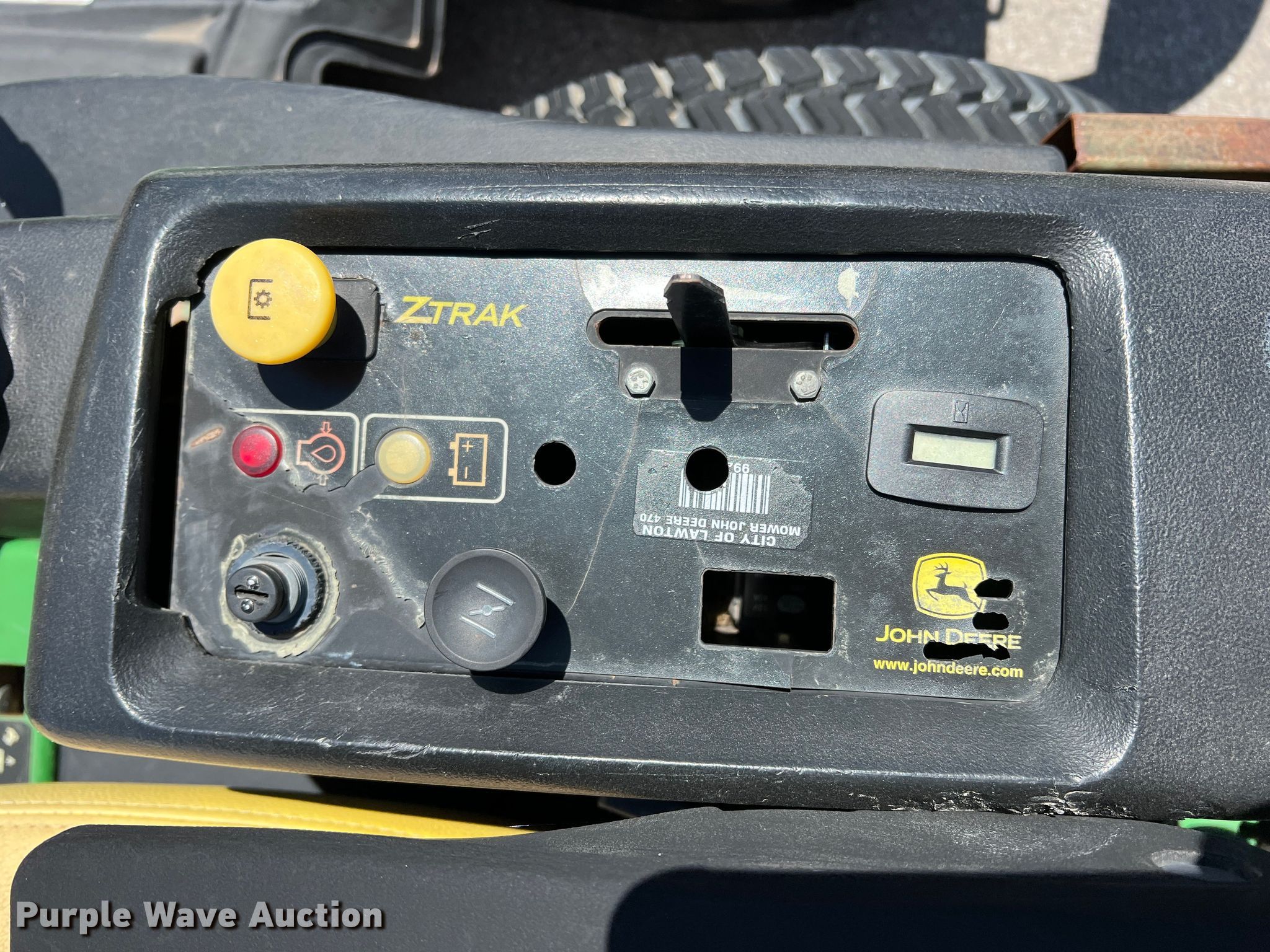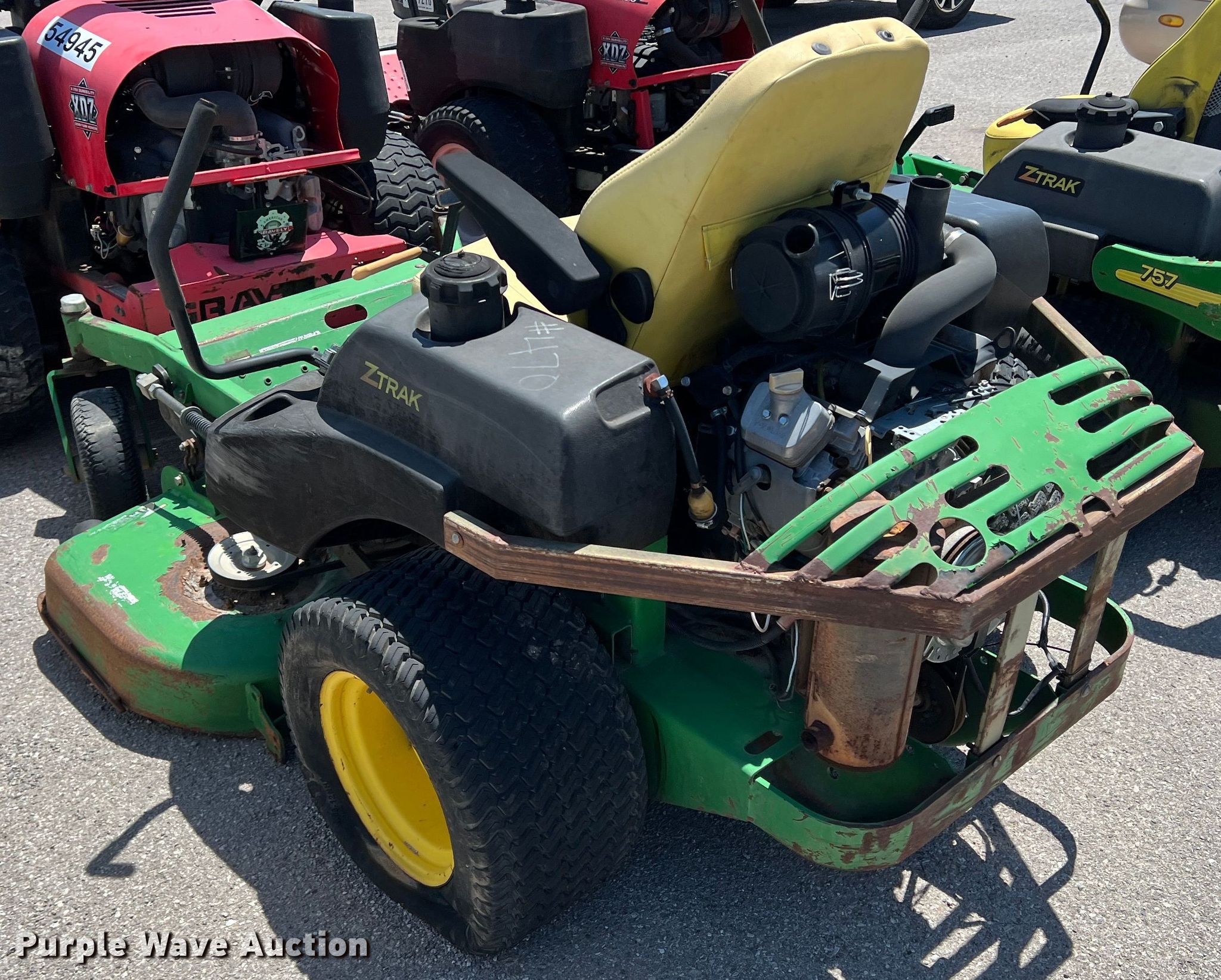 Purple Wave is selling a used Commercial Turf Mower in Oklahoma. This item is a John Deere ZTrak 757 ZTR lawn mower with the following: Hours: Unknown, Cutting width: 60", Serial: TC0757B036623, Unit #: 470