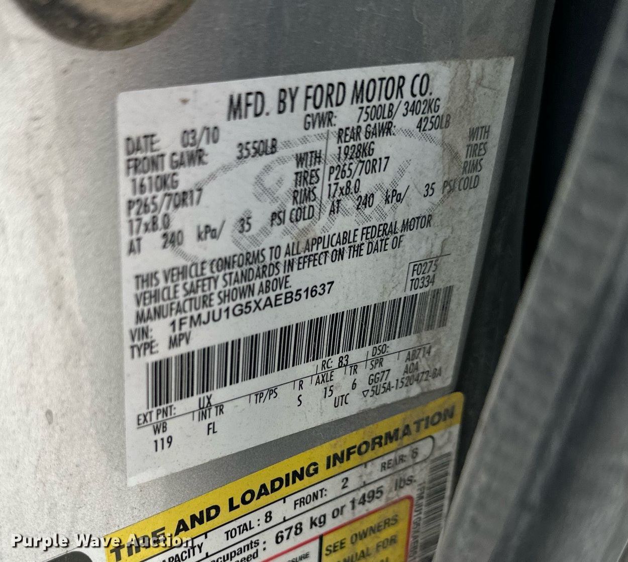 2010 Ford Expedition SUV. Miles: 194,743 on odometer, VIN: 1FMJU1G5XAEB51637. Engine Displacement: 5.4L V8 SOHC, Cylinders: 8, Fuel type: Gas. Transmission Automatic, Four wheel drive. Interior AC, Heat, Power windows, Power locks, Cruise control. Tires Size: 265/70R17. Kansas title. Seller is a government entity who will be assigning and distributing the title. Please contact the seller for distribution questions. Jefferson Co. Sheriff Dept.. 1360 Walnut Street. Oskaloosa, KS 66066